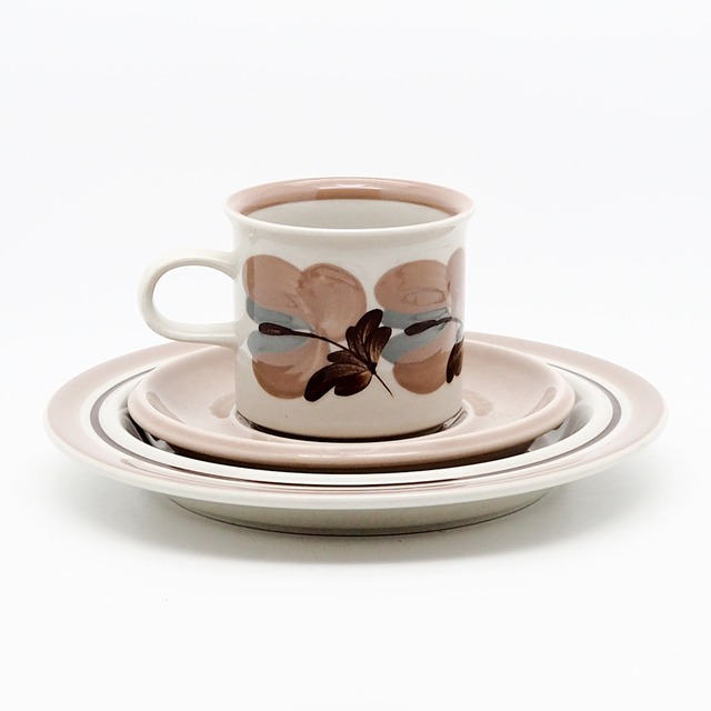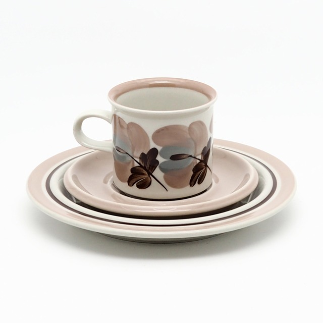 フィンランド語で「珊瑚」を意味する「Koralli(コラーリ)」シリーズ。いわゆるコーラルピンクより淡いまろやかなピンクベージュでデコレーションされています。やわらかいミルク色と茶色のコントラストも美しく、温かくやさしい雰囲気です。製造数が少ないのと近年の人気爆発で、かなりの高騰を見せる希少なコレクターアイテムとなってしまいました。こちらは小さめのコーヒーカップ&ソーサーにケーキプレートが付いたトリオで、ピンクとブラウンのラインが美しいプレートは単独でも活躍してくれること間違いなし。毎日の相棒として愛用していただきいたとっておきのアイテムです。 =========================== [メーカー]ARABIA(アラビア) [シリーズ]Koralli(コラーリ) [デザイナー] フォルム=Ulla Procope(ウラ・プロコッペ) デコレート=Raija Uosikkinen(ライヤ・ウォシッキネン) [年代]1983〜87年 =========================== [サイズ] カップ=φ70 × H63 mm ソーサー=φ125mm プレート=φ172mm 〈コンディション〉B 全体的にツヤもあり、ヴィンテージとしてはたいへん良好なコンディションです。 一部に経年によるごくわずかなスレ、若干のスクラッチがございます。 *白背景以外の写真はイメージ画像です。 ◉コンディションランクのめやす A:デッドストックなどの未使用品でダメージがほとんど無く新品同様のもの。 B:未使用品に限りなく近い綺麗な状態だが、光に当てればわかる程度の小傷やスレなどがあるもの。 C:小傷やスレなどがあり全体的に使用感はあるが、深い傷など目立つダメージはないもの。 D:経年による痛みが目立つが、使用には影響なくまだ楽しめるもの。 E:目立つ傷や割れ・欠けなどあり使用に影響が生じるジャンク品。 〈ヴィンテージ食器をお買い求めいただく際のご注意〉 こちらの商品は実際に使用されていたヴィンテージ(ユーズド)品ですので、経年による劣化や使用に伴う傷が多少ございます。また、手描きによるデコレーションの場合は、ペイントのかすれやにじみ、色ムラなどが見られることがあります。コンディション欄にてできるだけ詳しくご説明しておりますが、すべてを表記することができかねます。大切に受け継がれてきたヴィンテージ特有の風合いを楽しんでいただくことにご理解の上、ご注文いただけますようお願い申し上げます。