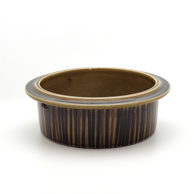 ヴィンテージアラビアの定番として多くのファンを持つKosmosシリーズ。ウラ・プロコッペが手がけたフォルムに、グンヴァル・オリン・グラングヴィストによる味わい深いデコレートが施されています。こちらはしっかりとした深さがある直径18センチのボウルで、サラダやスープや煮物などに大活躍してくれそうです。コスモスの花弁を表現したと思われる、深い茶・グリーン・黒のシックな色合いのペイントはひとつひとつ手で描かれており、落ち着いた美しさにうっとりします。和の食卓にもしっくり馴染む、飽きのこないアイテムです。 =========================== [メーカー]ARABIA(アラビア) [シリーズ]Kosmos(コスモス) [デザイナー] フォルム=Ulla Procope(ウラ・プロコッペ) デコレート=Gunvor Olin-Gronqvist(グンヴァル・オリン・グラングヴィスト) [年代]1964~76年 =========================== 〈サイズ〉 φ180 × H60mm 〈コンディション〉B 全体的にツヤがあり、ヴィンテージとしてはたいへん綺麗で良好なコンディションです。 高台など、ところどころにわずかなスレや小傷がございます。 ◉コンディションランクのめやす A:デッドストックなどの未使用品でダメージがほとんど無く新品同様のもの。 B:未使用品に限りなく近い綺麗な状態だが、光に当てればわかる程度の小傷やスレなどがあるもの。 C:小傷やスレなどがあり全体的に使用感はあるが、深い傷など目立つダメージはないもの。 D:経年による痛みが目立つが、使用には影響なくまだ楽しめるもの。 E:目立つ傷や割れ・欠けなどあり使用に影響が生じるジャンク品。 〈ヴィンテージ食器をお買い求めいただく際のご注意〉 こちらの商品は実際に使用されていたヴィンテージ(ユーズド)品ですので、経年による劣化や使用に伴う傷が多少ございます。コンディション欄にてできるだけ詳しくご説明しておりますが、すべてを表記することができかねます。大切に受け継がれてきたヴィンテージ特有の風合いを楽しんでいただくことにご理解の上、ご注文いただけますようお願い申し上げます。