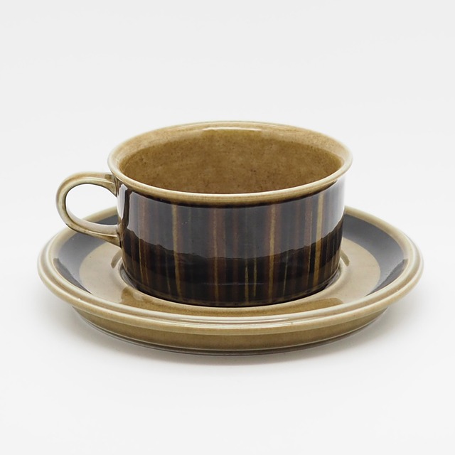 ヴィンテージアラビアの定番として多くのファンを持つKosmosシリーズ。ウラ・プロコッペが手がけたフォルムに、グンヴァル・オリン・グラングヴィストによる味わい深いデコレートが施されています。こちらはたっぷりとコーヒーやお茶が楽しめる大きなティーカップ&ソーサーで、スープやショートパスタを入れてお食事で使っていただいてもすてきです。カップ裏のバックスタンプは手描きで、「gog」のサインと「OVENPROOF」の表記を見ることができます。コスモスの花弁を表現したと思われる、深い茶・グリーン・黒のシックな色合いのペイントはひとつひとつ手で描かれており、落ち着いた美しさにうっとりします。和の食卓にもしっくり馴染む、飽きのこないアイテムです。 =========================== [メーカー]ARABIA(アラビア) [シリーズ]Kosmos(コスモス) [デザイナー] フォルム=Ulla Procope(ウラ・プロコッペ) デコレート=Gunvor Olin-Gronqvist(グンヴァル・オリン・グラングヴィスト) [年代]1964~76年 =========================== 〈サイズ〉 カップ=φ100 × H55mm ソーサー=φ160mm 〈コンディション〉B 全体的にツヤがあり、ヴィンテージとしては良好なコンディションです。 ところどころにわずかなスレや小傷、若干のスクラッチがございます。 カップの内側にペイントムラが、持ち手に製造時にできたと思われるごく小さな突起が見られますが、ご使用に問題はありません。 ◉コンディションランクのめやす A:デッドストックなどの未使用品でダメージがほとんど無く新品同様のもの。 B:未使用品に限りなく近い綺麗な状態だが、光に当てればわかる程度の小傷やスレなどがあるもの。 C:小傷やスレなどがあり全体的に使用感はあるが、深い傷など目立つダメージはないもの。 D:経年による痛みが目立つが、使用には影響なくまだ楽しめるもの。 E:目立つ傷や割れ・欠けなどあり使用に影響が生じるジャンク品。 〈ヴィンテージ食器をお買い求めいただく際のご注意〉 こちらの商品は実際に使用されていたヴィンテージ(ユーズド)品ですので、経年による劣化や使用に伴う傷が多少ございます。また、手描きによるデコレーションの場合は、ペイントのかすれやにじみ、色ムラなどが見られることがあります。コンディション欄にてできるだけ詳しくご説明しておりますが、すべてを表記することができかねます。大切に受け継がれてきたヴィンテージ特有の風合いを楽しんでいただくことにご理解の上、ご注文いただけますようお願い申し上げます。