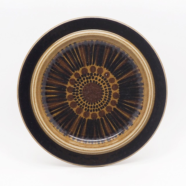 ヴィンテージアラビアの定番として多くのファンを持つKosmosシリーズ。ウラ・プロコッペが手がけたフォルムに、GOG(グンヴァル・オリン・グラングヴィスト)による味わい深いデコレートが施されています。コスモスの花を表現したと思われる、深い茶・グリーン・黒のシックな色合いのペイントはひとつひとつ手で描かれており、落ち着いた美しさにうっとりします。カップやボウルは花びらを表したシンプルなストライプですが、こちらのプレート類にはコスモスの花の中心のめしべやおしべも表現され、大輪の花が咲き開いたよう。少しだけ深さのある20cmプレートは、お食事にもデザートにも活躍する使いやすいサイズです。 =========================== [メーカー]ARABIA(アラビア) [シリーズ]Kosmos(コスモス) [デザイナー] フォルム=Ulla Procope(ウラ・プロコッペ) デコレート=Gunvor Olin-Gronqvist(グンヴァル・オリン・グラングヴィスト) [年代]1964~76年 =========================== 〈サイズ〉 約φ200mm 〈コンディション〉C 全体的に使用感があり、表面に経年によるスレや小傷、カトラリー跡が見られますが、割れ欠けなどの大きなダメージはなくツヤもあり、この時代のヴィンテージならではの味としてご愛用いただけるコンディションです。 このシリーズによく見られるように、型のゆがみや色ムラがありますが、ご使用に支障をきたすものではありません。 *白背景以外の写真はイメージ画像です。 ◉コンディションランクのめやす A:デッドストックなどの未使用品でダメージがほとんど無く新品同様のもの。 B:未使用品に限りなく近い綺麗な状態だが、光に当てればわかる程度の小傷やスレなどがあるもの。 C:小傷やスレなどがあり全体的に使用感はあるが、深い傷など目立つダメージはないもの。 D:経年による痛みが目立つが、使用には影響なくまだ楽しめるもの。 E:目立つ傷や割れ・欠けなどあり使用に影響が生じるジャンク品。 〈ヴィンテージ食器をお買い求めいただく際のご注意〉 こちらの商品は実際に使用されていたヴィンテージ(ユーズド)品ですので、経年による劣化や使用に伴う傷が多少ございます。また、手描きによるデコレーションの場合は、ペイントのかすれやにじみ、色ムラなどが見られることがあります。コンディション欄にてできるだけ詳しくご説明しておりますが、すべてを表記することができかねます。大切に受け継がれてきたヴィンテージ特有の風合いを楽しんでいただくことにご理解の上、ご注文いただけますようお願い申し上げます。