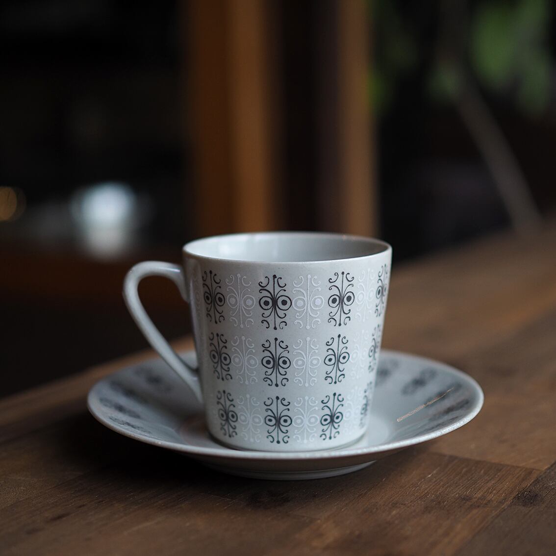 繊細でエキゾチックな柄が神秘的な「Sylvia(シルヴィア)」のカップ&ソーサー。アラビア社で数々の名作を手がけたライヤ・ウオシッキネンの作品です。グレー・ブルー・ピンクの3色が作られたシリーズで、こちらはクールでエレガントなグレー。「シルヴィア」とはフィンランドの女性の名と思われ、洗練されたやさしい雰囲気を持っています。シャープな持ち手が印象的な美しいフォルムもポイントです。