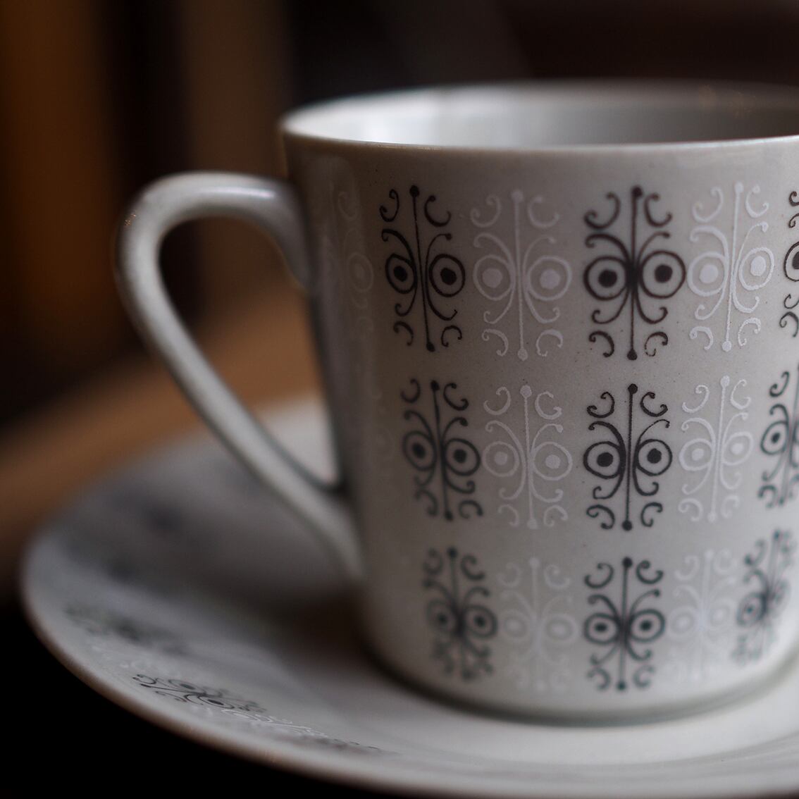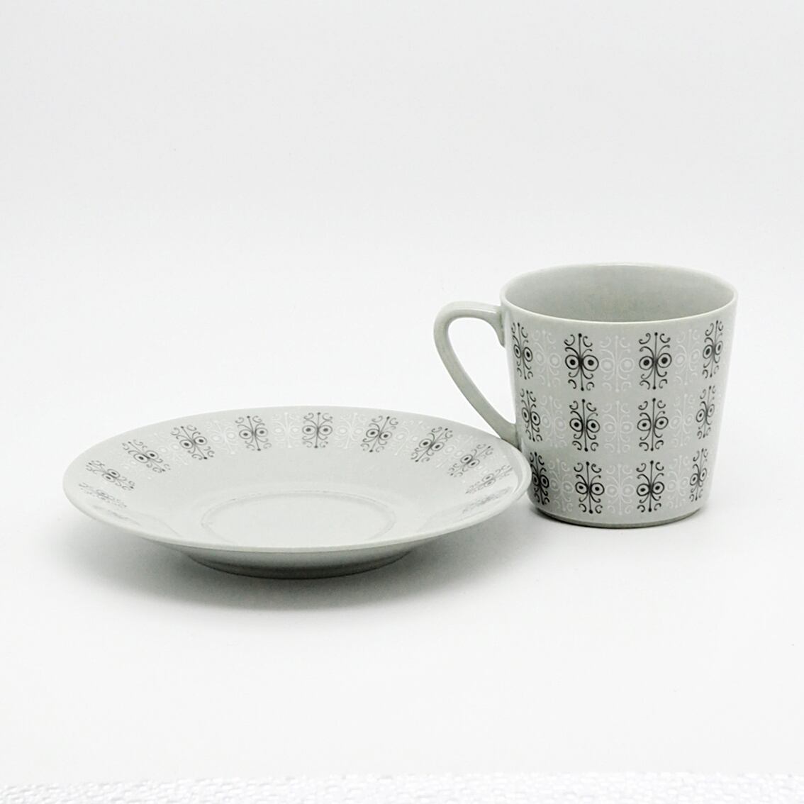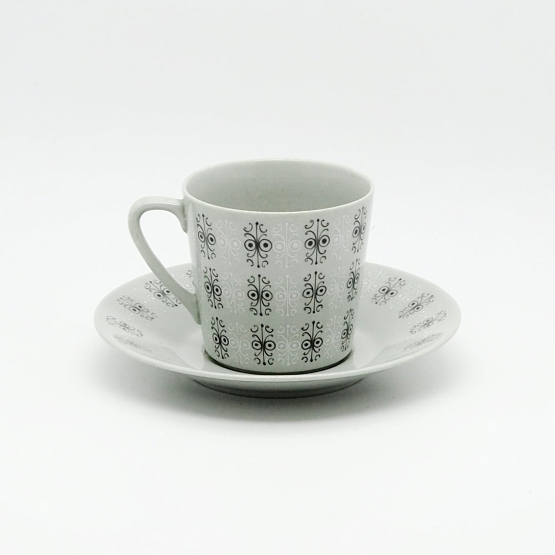 繊細でエキゾチックな柄が神秘的な「Sylvia(シルヴィア)」のカップ&ソーサー。アラビア社で数々の名作を手がけたライヤ・ウオシッキネンの作品です。グレー・ブルー・ピンクの3色が作られたシリーズで、こちらはクールでエレガントなグレー。「シルヴィア」とはフィンランドの女性の名と思われ、洗練されたやさしい雰囲気を持っています。シャープな持ち手が印象的な美しいフォルムもポイントです。