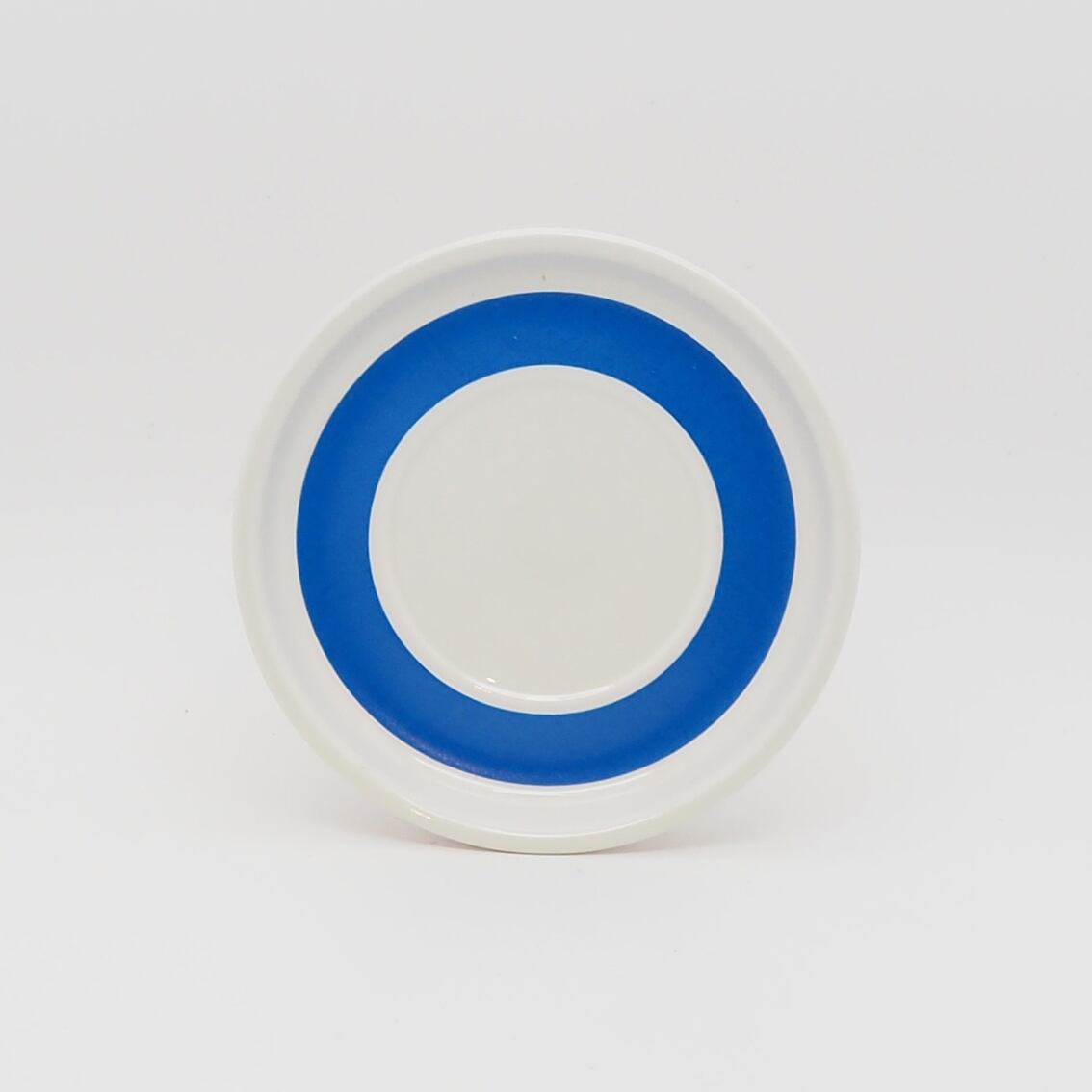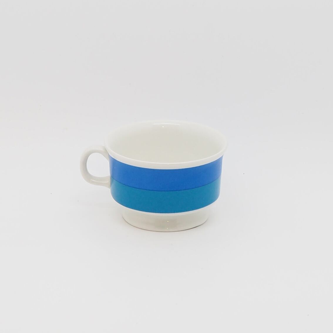 鮮やかな二層のブルーが美しい「Spektri(スペクトリ)」のカップ&ソーサーです。虹の光の帯を意味する名前を持ち、青一色に見えて微妙に異なるツートーンになっているデザインがユニーク。フォルムは「Valencia(ヴァレンシア)」などと同じウラ・プロコッペによるNDモデルで、カップの高台と立ち上がりのあるソーサーのバランスがなんともいえずチャーミングです。いろいろなサイズやアイテムに展開されることの多いアラビアの他シリーズと異なり、「Spektri」はこのデミタスサイズのみの展開だったようで、たしかにこの可愛らしいバランスでこそ生きるデザインな気がします。現地でもあまり出回ることのない希少なアイテムです。