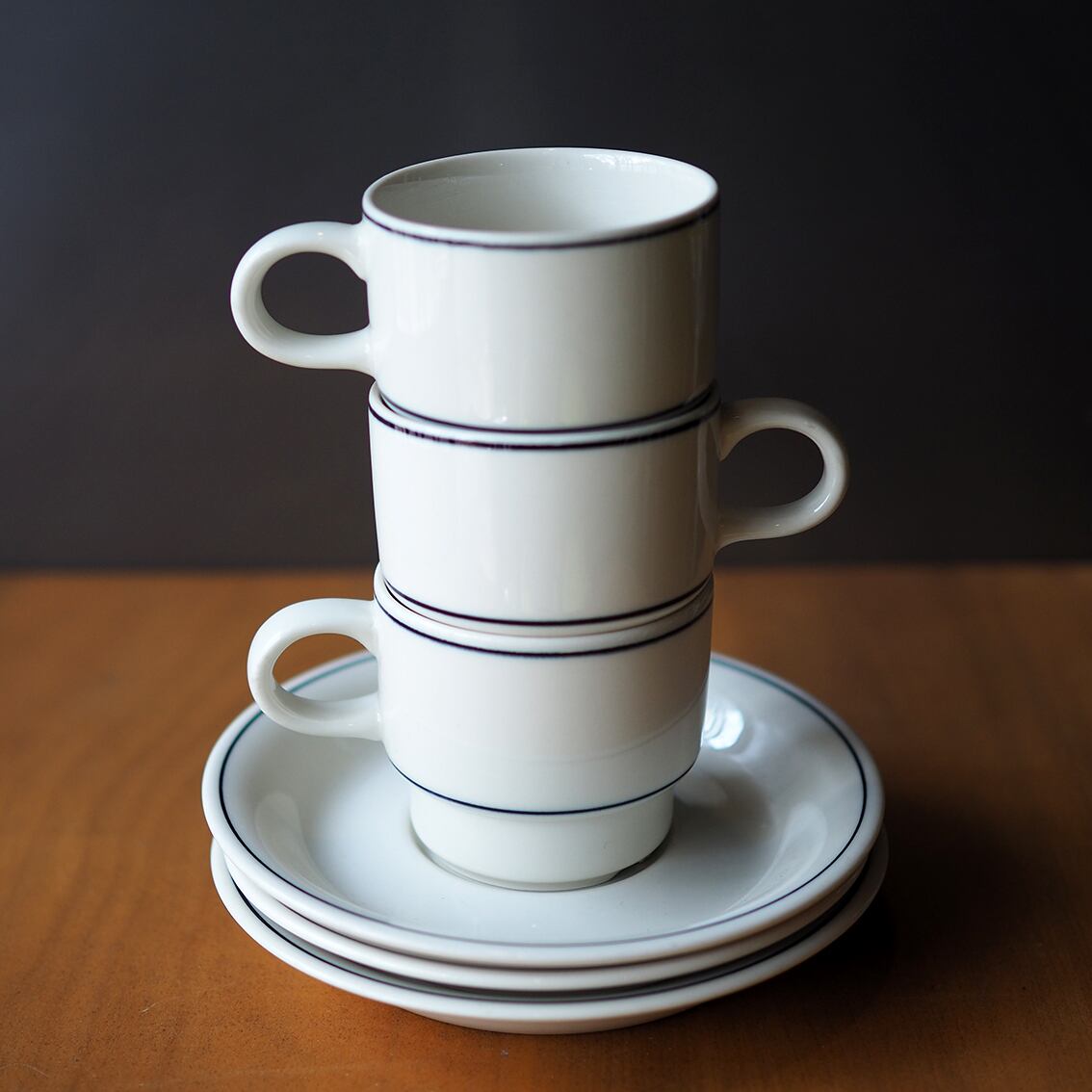 まろやかな白地にキリッと入ったネイビーの細いラインがスタイリッシュな「Polar」。「Inari」や「Kasino」と同じく、レストランやカフェ・公共施設で使われる、いわゆる業務用のテーブルウェアを数多く手がけたゴラン・バックがフォルムをデザインしたシリーズです。シンプルでクールなデコレーションは、繊細な植物柄を得意としたエステリ・トムラによるもの。彼女の別な面を発見すると同時に、その多才さに感動を覚えます。スタッキング可能な構造や、食洗機で洗った際の水はけを考慮した高台の溝など、機能面も優れているのが特長。使いやすくしまいやすく飽きのこないデザインでお値段もお手頃なので、ご家族ぶんセットで揃えていただいても、また飲食店などでも活躍してくれる名作だと思います。
