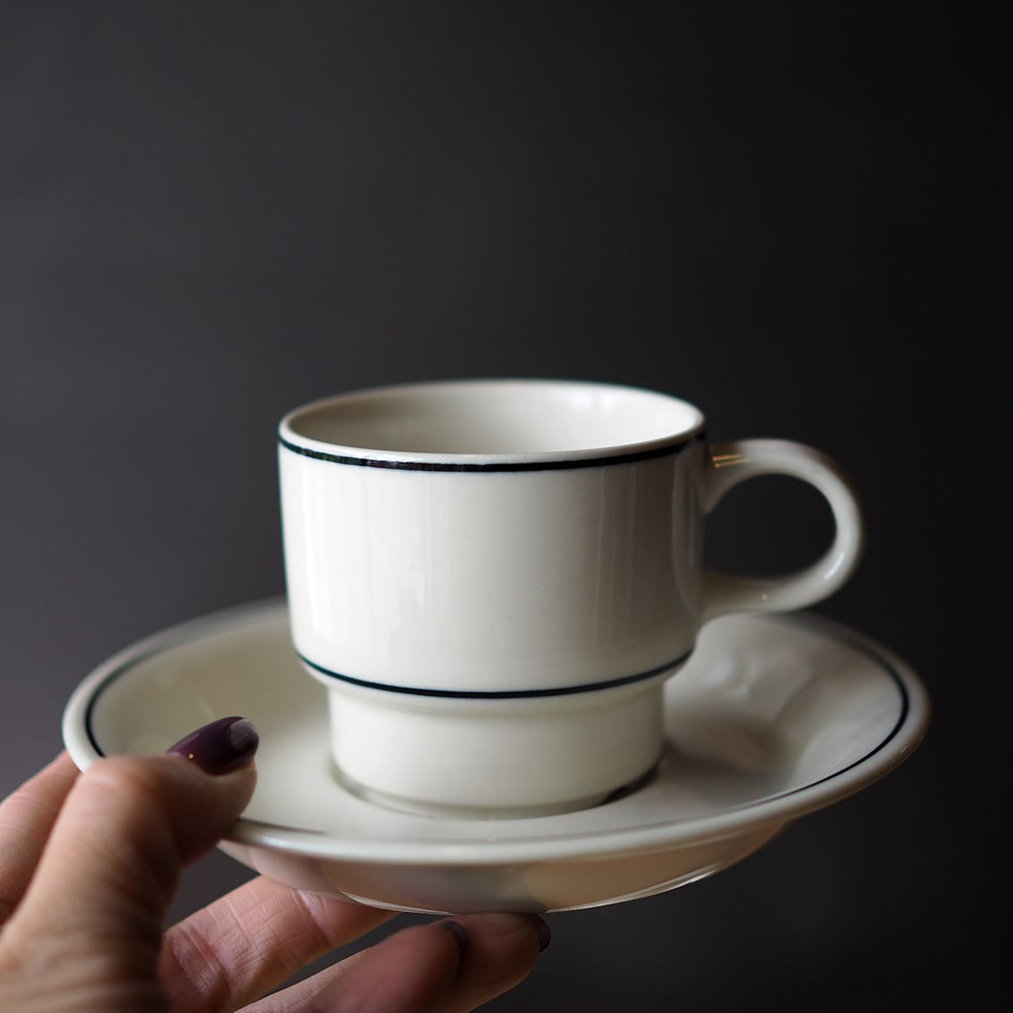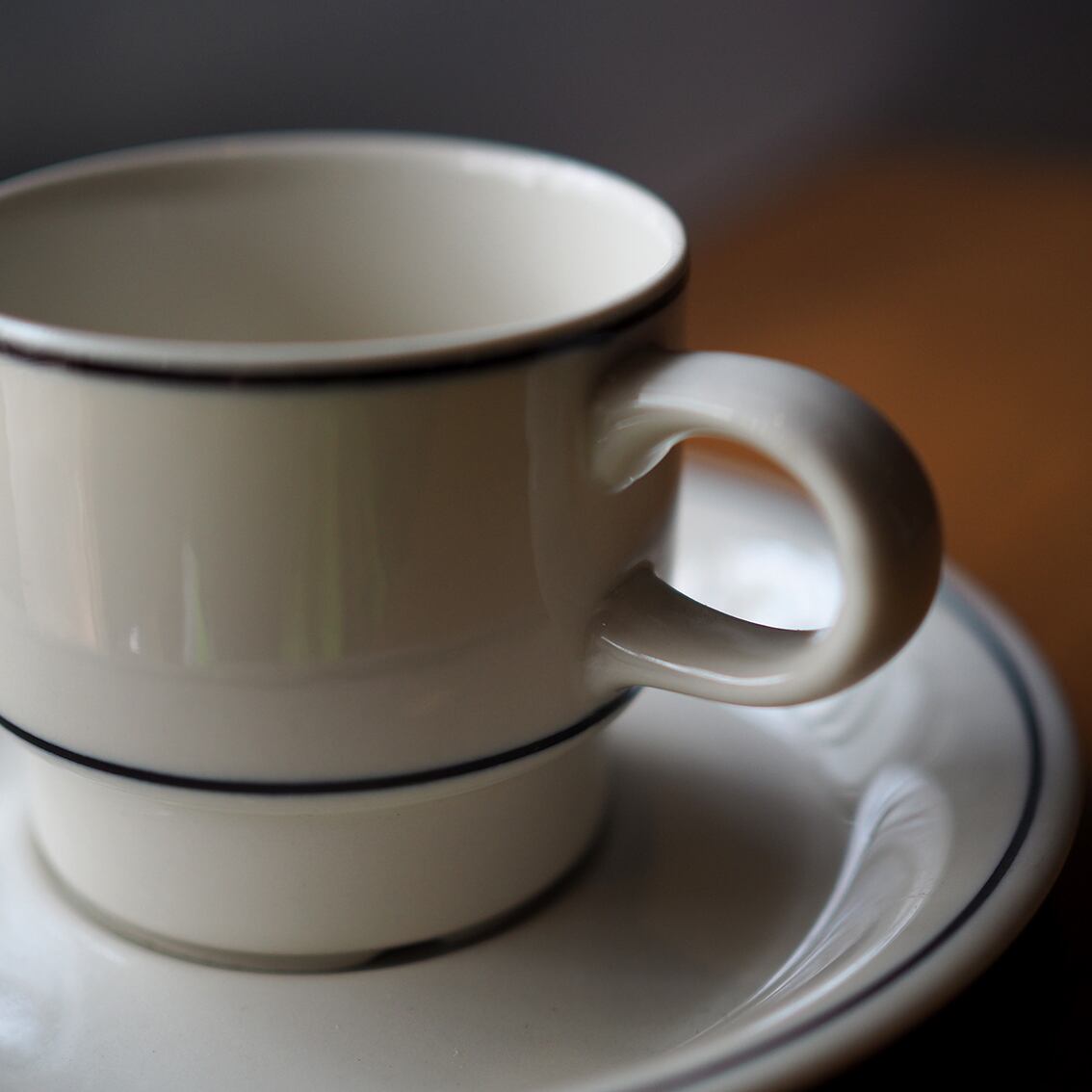 まろやかな白地にキリッと入ったネイビーの細いラインがスタイリッシュな「Polar」。「Inari」や「Kasino」と同じく、レストランやカフェ・公共施設で使われる、いわゆる業務用のテーブルウェアを数多く手がけたゴラン・バックがフォルムをデザインしたシリーズです。シンプルでクールなデコレーションは、繊細な植物柄を得意としたエステリ・トムラによるもの。彼女の別な面を発見すると同時に、その多才さに感動を覚えます。スタッキング可能な構造や、食洗機で洗った際の水はけを考慮した高台の溝など、機能面も優れているのが特長。使いやすくしまいやすく飽きのこないデザインでお値段もお手頃なので、ご家族ぶんセットで揃えていただいても、また飲食店などでも活躍してくれる名作だと思います。