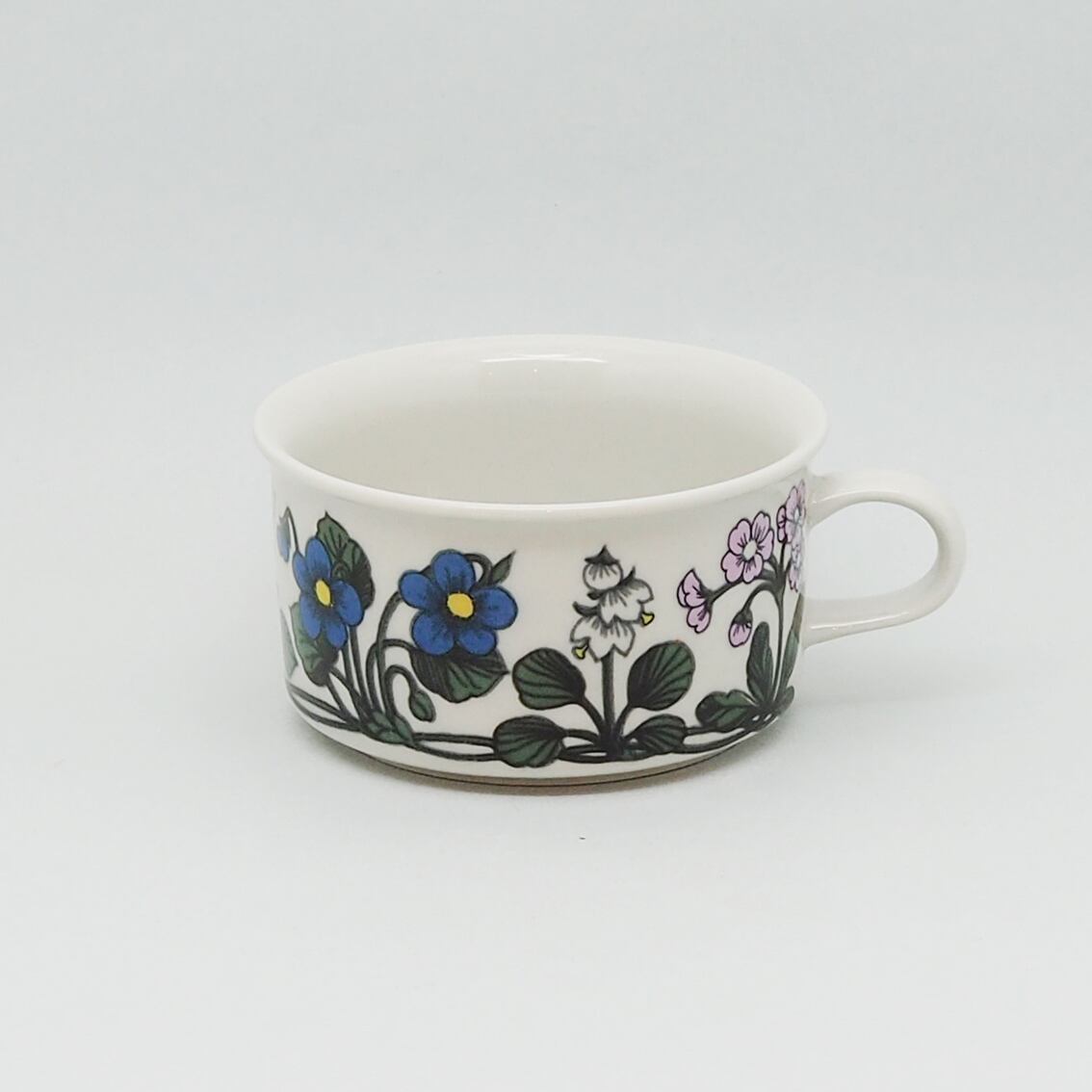 たんぽぽ、すずらん、桜草、スミレなど、素朴な野の花がやさしいタッチで描かれた「フローラ」。植物をモチーフに多くの名作を生んだエステリ・トムラがデコレートを手がけた作品です。「植物誌」を意味する名前のとおり、具象的な草花の描写は図鑑のようでもあり、カップの表面にぐるりと咲きつらなる様子は春の野原をさんぽしているような気分にもさせてくれます。スープカップとしても使える大きなティーカップは、角度によって違う風景を見ることができ、いつまでも眺めていたい魅力があります。バックスタンプにも花が咲いている特別バージョンなのもうれしいポイント。製造年数が短く、年々入手が難しくなっているアイテムです。