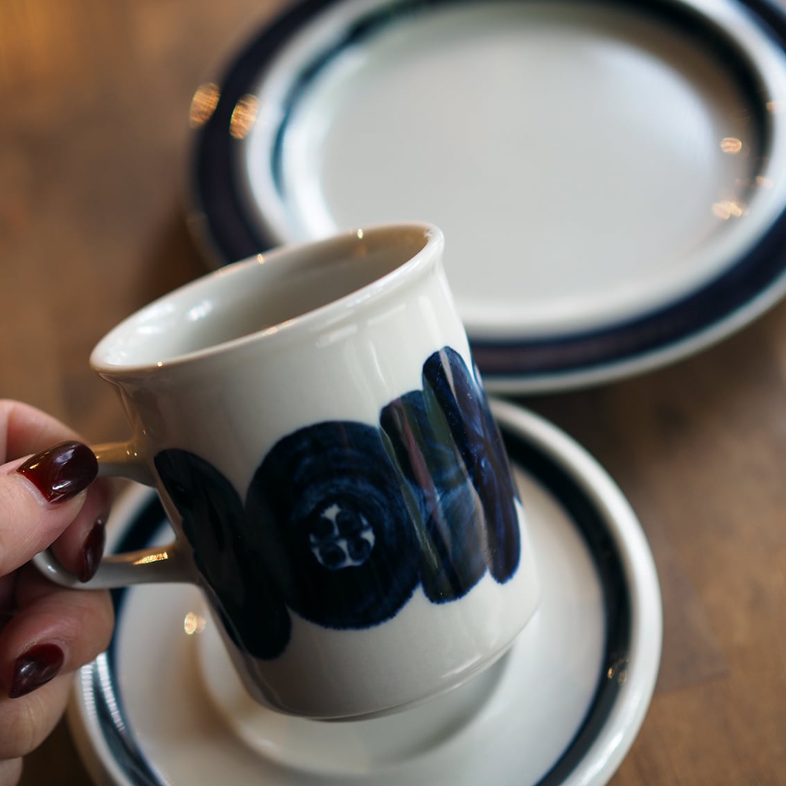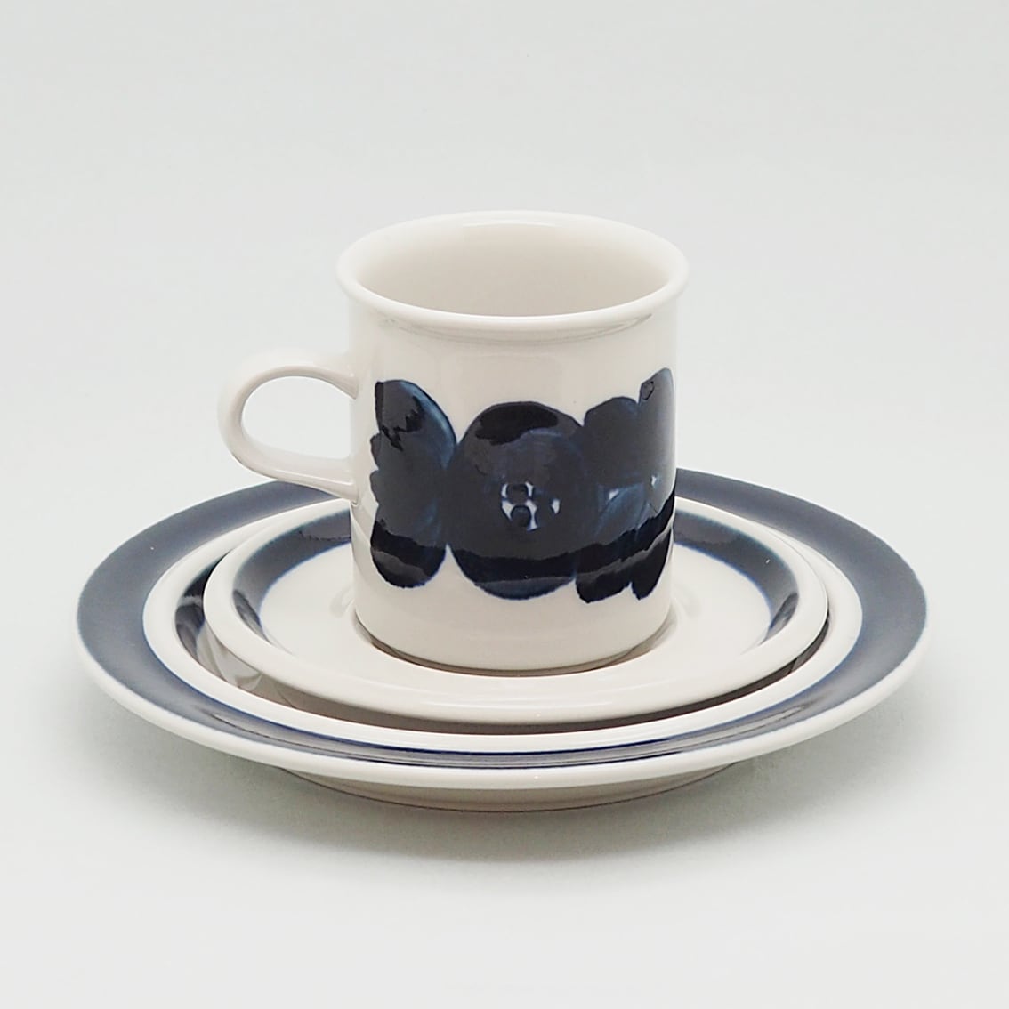 ARABIAを代表するデザイナー、ウラ・プロコッペがフォルムとデコレートデザインどちらも手掛けたAnemone(アネモネ)シリーズ。 深みのあるブルーと、数人の訓練された絵付師がフリーハンドで描いた花の模様が美しく、ひとつひとつすべて表情が異なります。こちらは1980年代に短期間販売された復刻版で、Sモデルのコーヒーカップ&ソーサーに、単独でも活躍する17センチのプレートが付いたトリオセット。アラビア全盛期の美しさを存分に味わうことができる、とっておきのアイテムです。