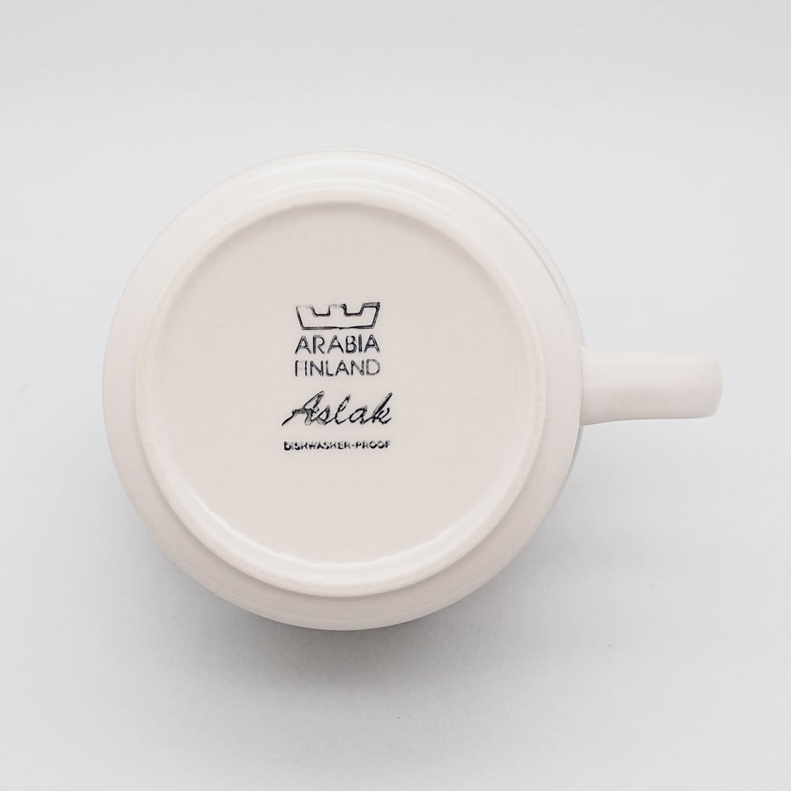 ラップランド地方の男性の名前を持つAslak (アスラク)は、Uhtuaなどと同じくウラ・プロコッペとインケリ・レイヴォのコンビによる作品です。シンプルなラインのみの構成ながら、モノトーンの中に絶妙なアプリコットオレンジがぱっと目を引くポイントになっており、モダンで洗練された配色はいちど見たら忘れられない魅力を持っています。どっしりとした安定感のあるティーカップは、コーヒーや紅茶はもちろん、スープやショートパスタを入れてお食事で使ってもすてきです。