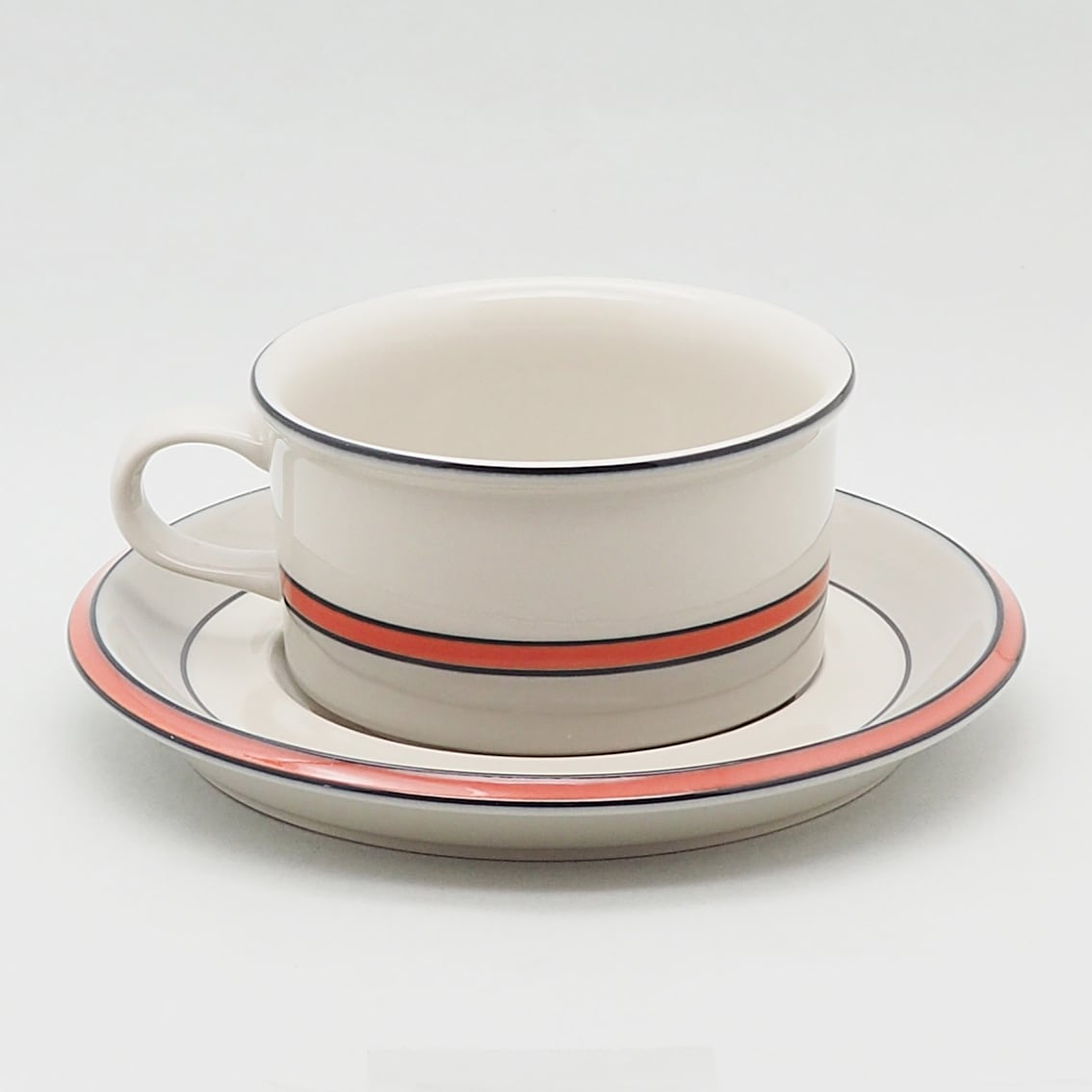 ラップランド地方の男性の名前を持つAslak (アスラク)は、Uhtuaなどと同じくウラ・プロコッペとインケリ・レイヴォのコンビによる作品です。シンプルなラインのみの構成ながら、モノトーンの中に絶妙なアプリコットオレンジがぱっと目を引くポイントになっており、モダンで洗練された配色はいちど見たら忘れられない魅力を持っています。どっしりとした安定感のあるティーカップは、コーヒーや紅茶はもちろん、スープやショートパスタを入れてお食事で使ってもすてきです。