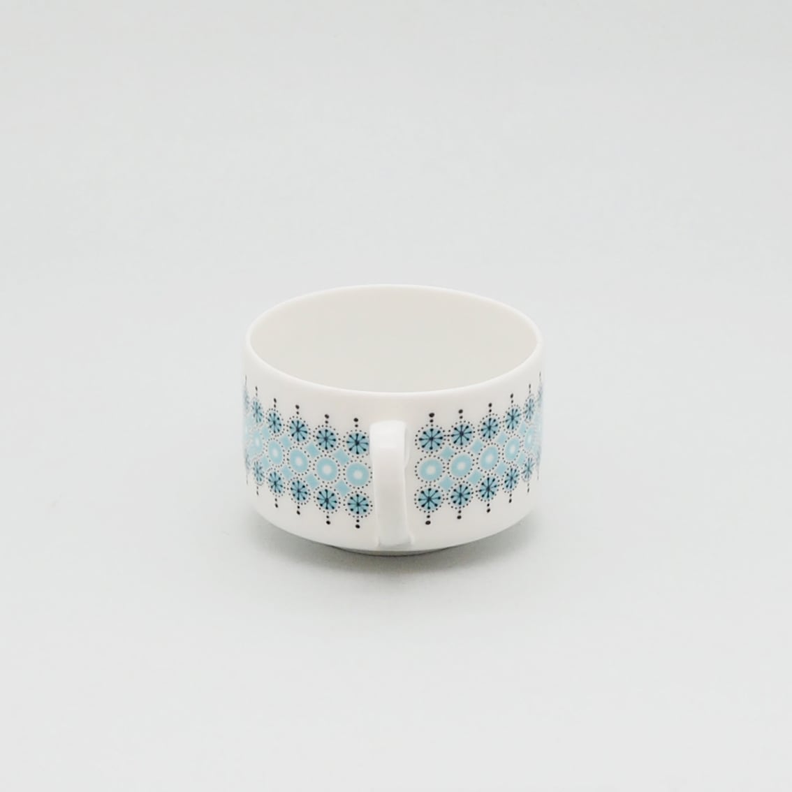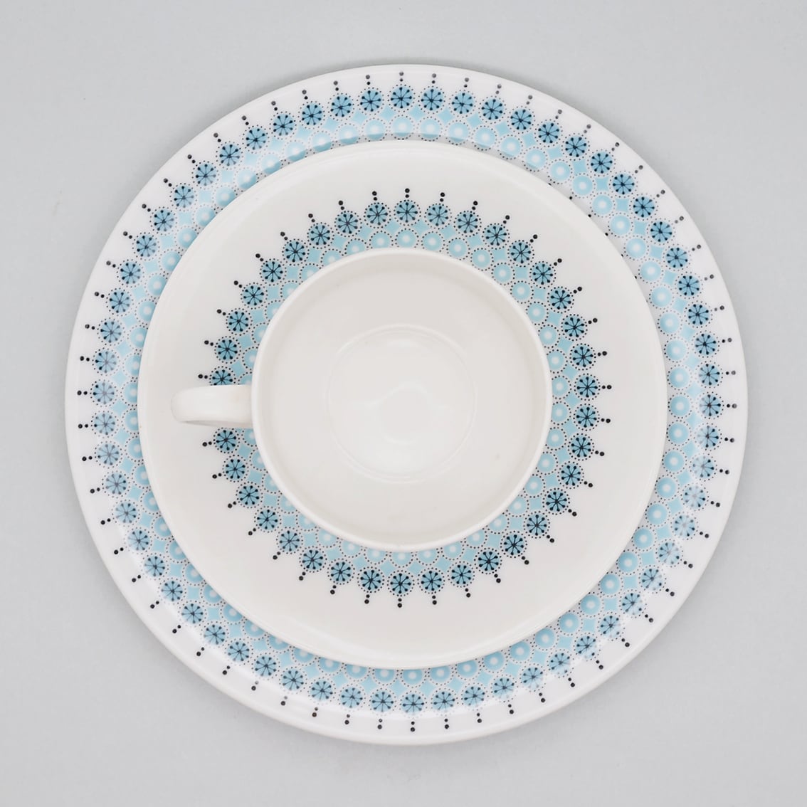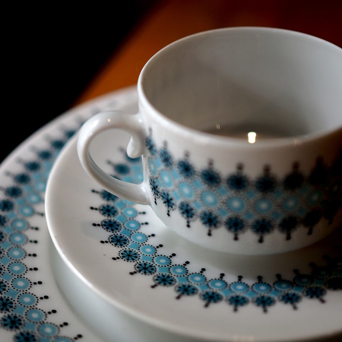 1969年から5年間のみ製造された「Louhi(ロウヒ)」のトリオです。フィンランドの民族叙事詩『カレワラ』に登場する北の国の魔女(女王)の名前から名付けられたと思われるシリーズで、雪の結晶のような繊細な柄が水色とターコイズで描かれています。ライヤ・ウオシッキネンが手がけた氷の粒や水の波紋にも見えるデザインは、ひんやりと冷たい北欧の冬の景色のようで、うっとりするほど美しいたたずまいです。軽くて扱いやすい小さめのカップ&ソーサーに単独でも活躍する17センチのプレートが付いたトリオセットは、とっておきのフィーカを演出してくれます。