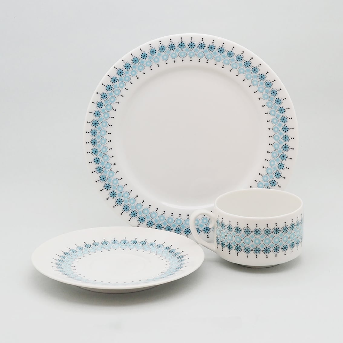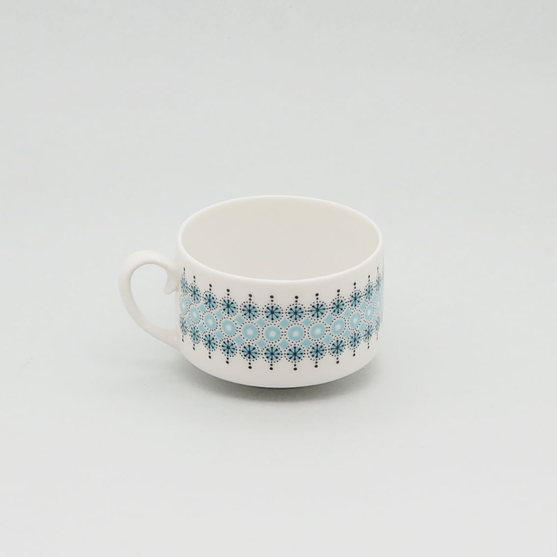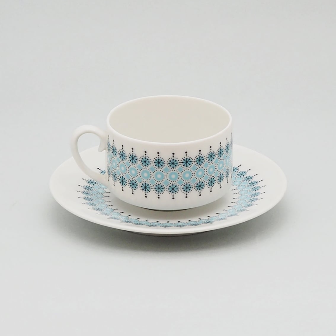 1969年から5年間のみ製造された「Louhi(ロウヒ)」のトリオです。フィンランドの民族叙事詩『カレワラ』に登場する北の国の魔女(女王)の名前から名付けられたと思われるシリーズで、雪の結晶のような繊細な柄が水色とターコイズで描かれています。ライヤ・ウオシッキネンが手がけた氷の粒や水の波紋にも見えるデザインは、ひんやりと冷たい北欧の冬の景色のようで、うっとりするほど美しいたたずまいです。軽くて扱いやすい小さめのカップ&ソーサーに単独でも活躍する17センチのプレートが付いたトリオセットは、とっておきのフィーカを演出してくれます。