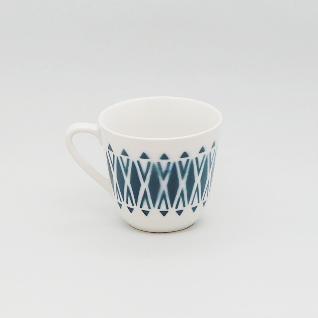 模様がくり抜かれた型をカップに装着し、スプレーで柄を吹き付ける〈ステンシル技法〉で作られた1960〜70年代のシリーズ。可愛らしいけれど洗練された柄と、職人の手によるペイントのやわらかい輪郭とあたたかい表情が魅力です。こちらは、珍しいブルーグリーンの幾何学模様が描かれたカップ&ソーサー。あまり見かけない柄で、絶妙な色合いといいモダンなパターンといい、最高にチャーミングなたたずまいです。