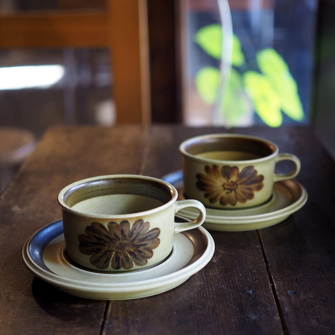 使用感がほとんどなく、この年代のヴィンテージとしてはとてもきれいなコンディションです。ところどころに、経年によるわずかなスレ・小傷などがございます。カップ側面に、製造時にできたと思われる小さな傷があります。ソーサー裏の高台に、製造時にできた細かい突起(ツブ)が見られます。いずれも安定感やご使用に支障をきたすものではありません。