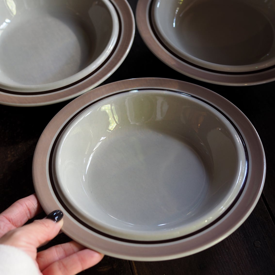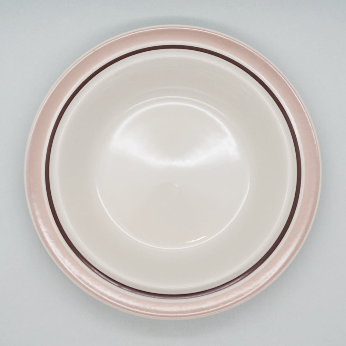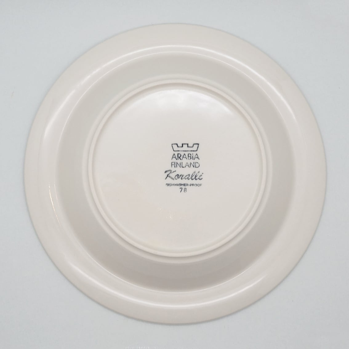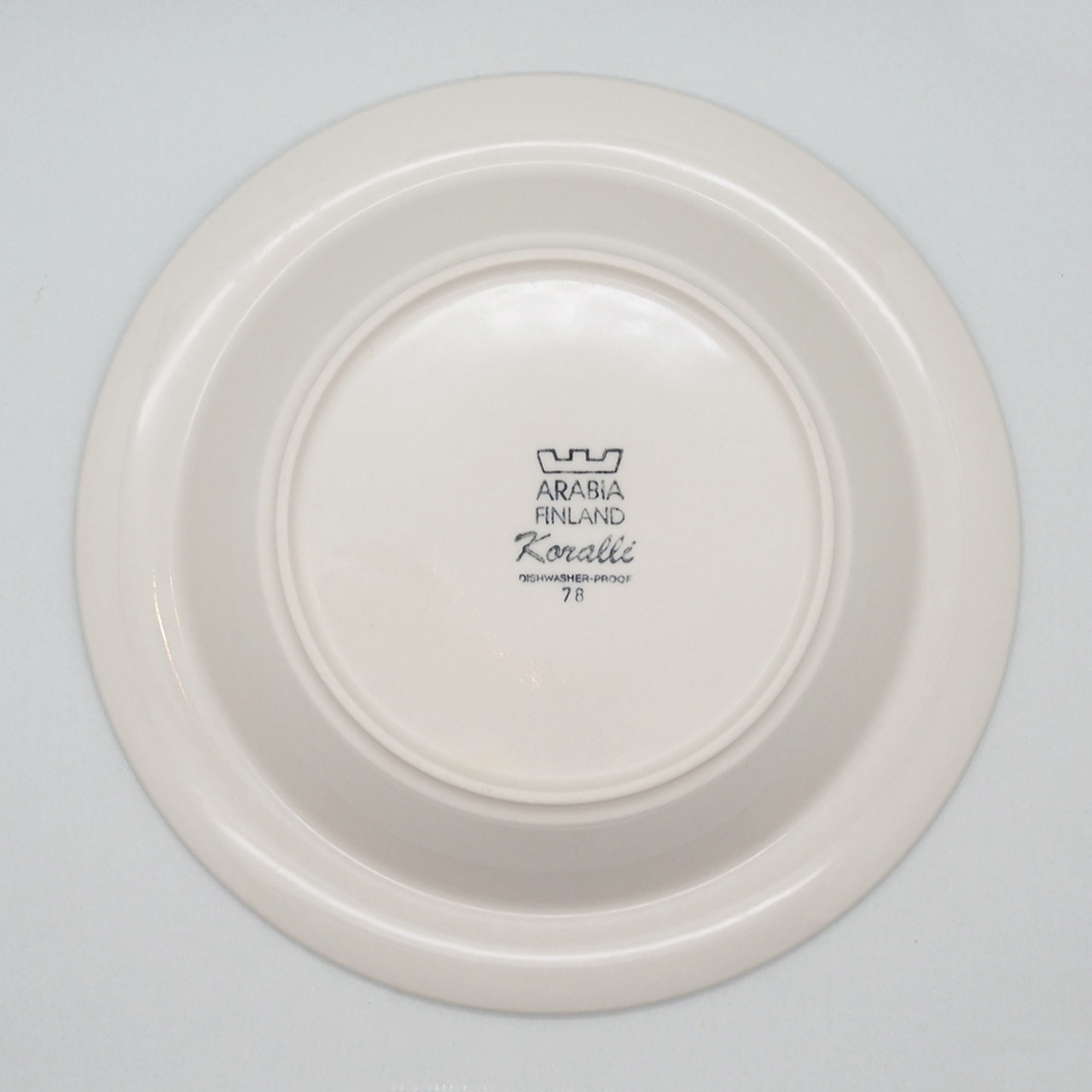 フィンランド語で「珊瑚」を意味する「Koralli(コラーリ)」シリーズのスーププレートです。ミルクティーのようなまろやかなピンクベージュとブラウンのラインが描かれています。やわらかいミルク色とのコントラストも美しく、スモーキーで温かくやさしい雰囲気です。製造数が少ないのと近年の人気爆発で、かなりの高騰を見せる希少なコレクターアイテムとなってしまいました。