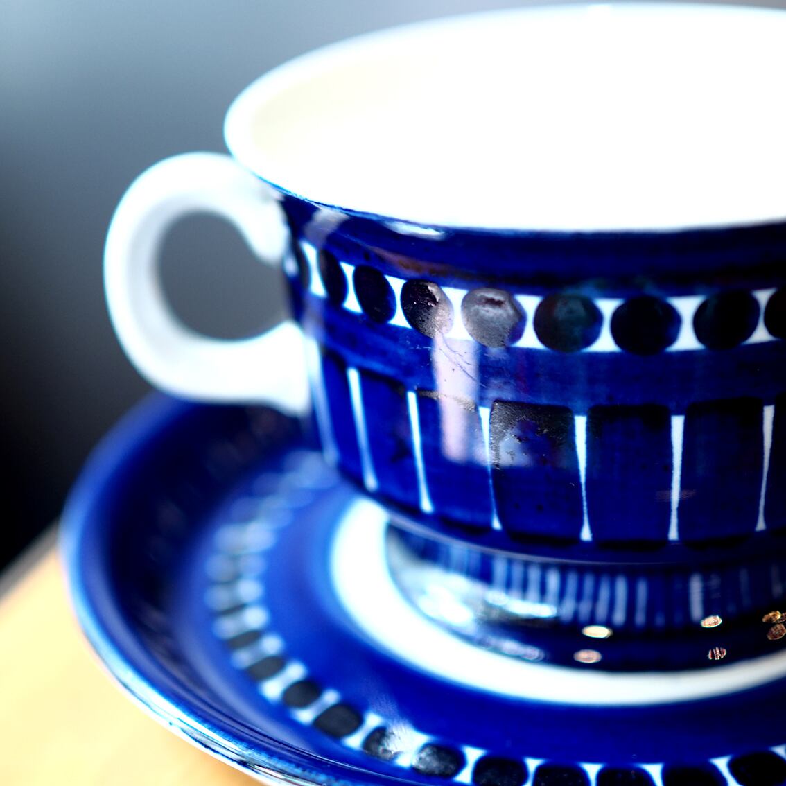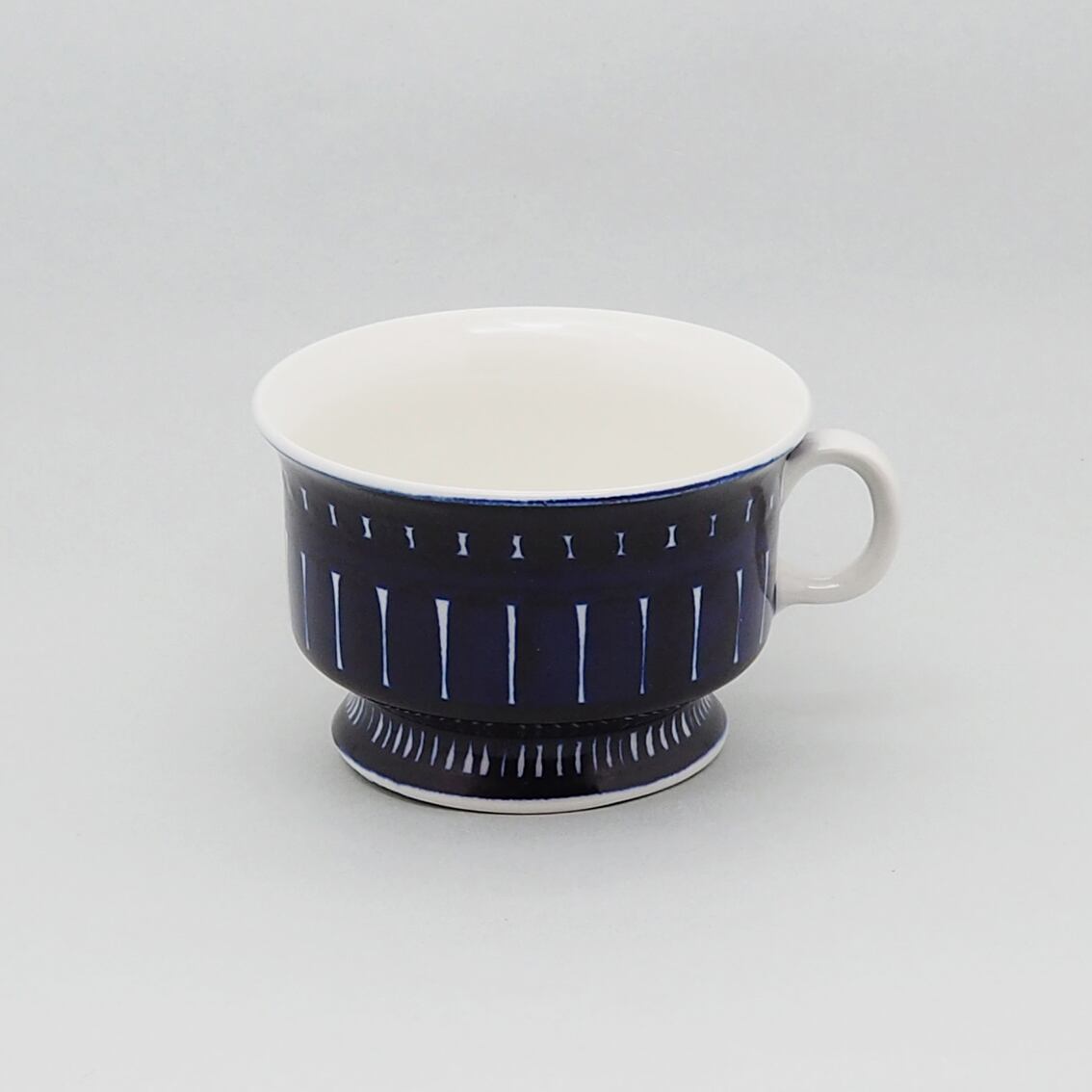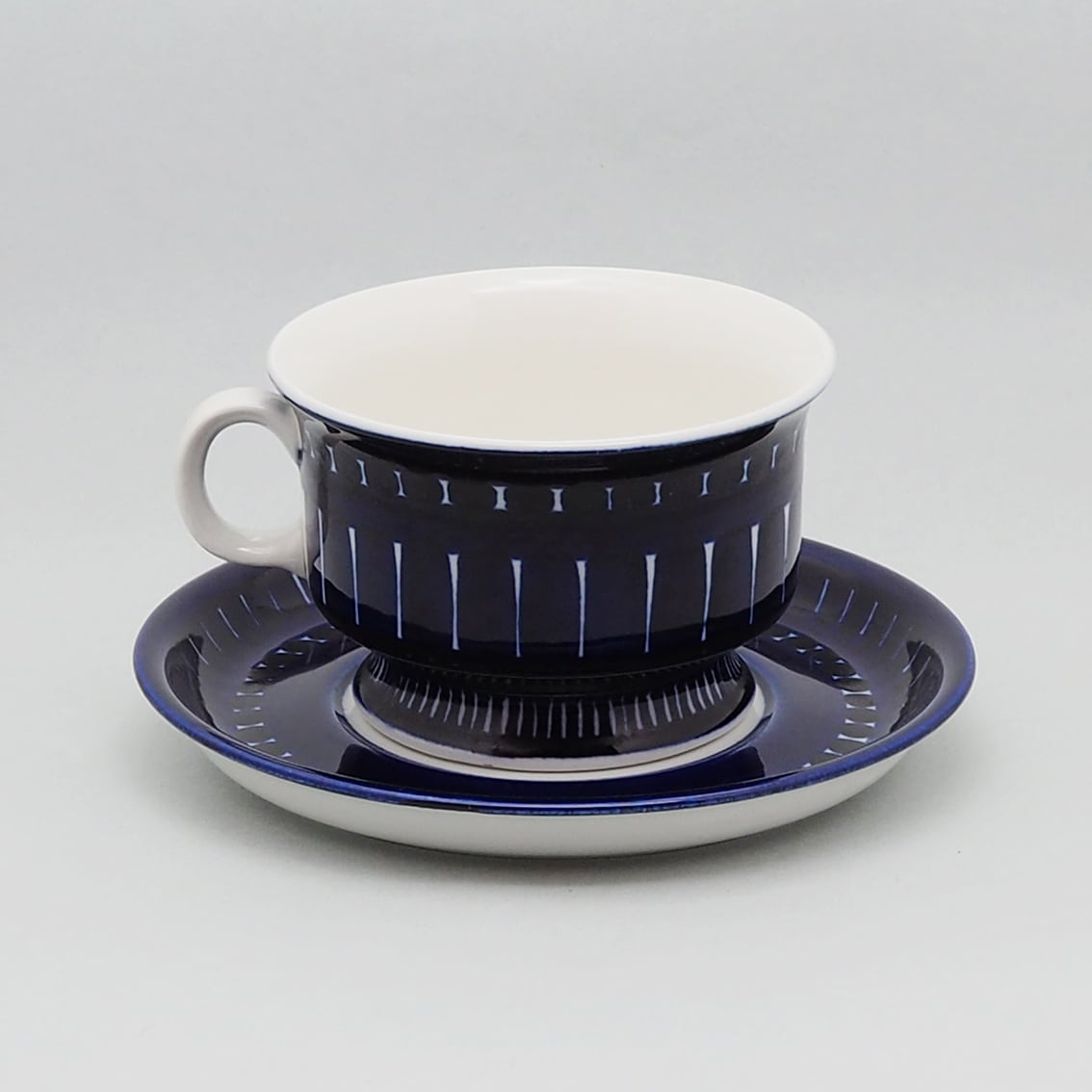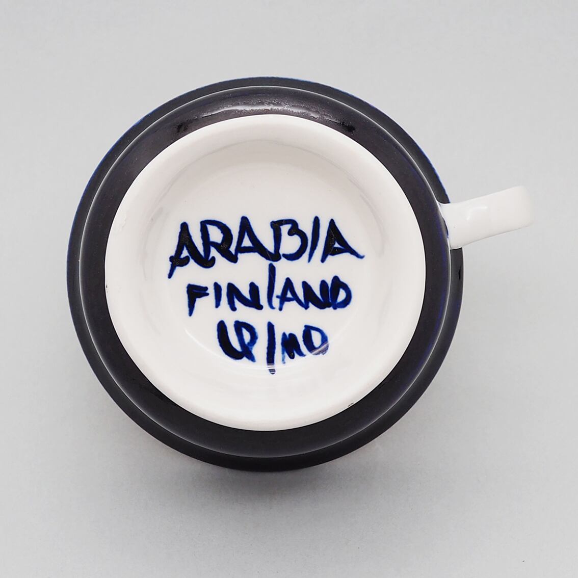 アラビア社を代表するデザイナー、ウラ・プロコッペがデザインしたシリーズの中でも人気が高くコレクターが多いValencia(バレンシア)シリーズ。はっとするくらい美しいコバルトブルーの絵柄はすべてフリーハンドで描かれたもので、全く同じものはひとつもありません。また、裏面のハンドペイントサインは、1960年代初期にフィンランド国内販売用に製作されたものにしか見ることができない貴重なものです。「バレンシア」とはスペインの州都の名で、若い頃を南欧で過ごした彼女がスペインの影響を受けてデザインしたと言われています。のびのびと大胆に描かれたハンドペイントは、南欧の明るい太陽やおおらかな空気を表現したのでしょうか。こちらは中でも出会うのが難しい大きなティーカップ&ソーサー。コンディションも良好でレアなアイテムですが、ぜひ普段使いとして毎日の暮らしに取り入れていただきたい名作です。