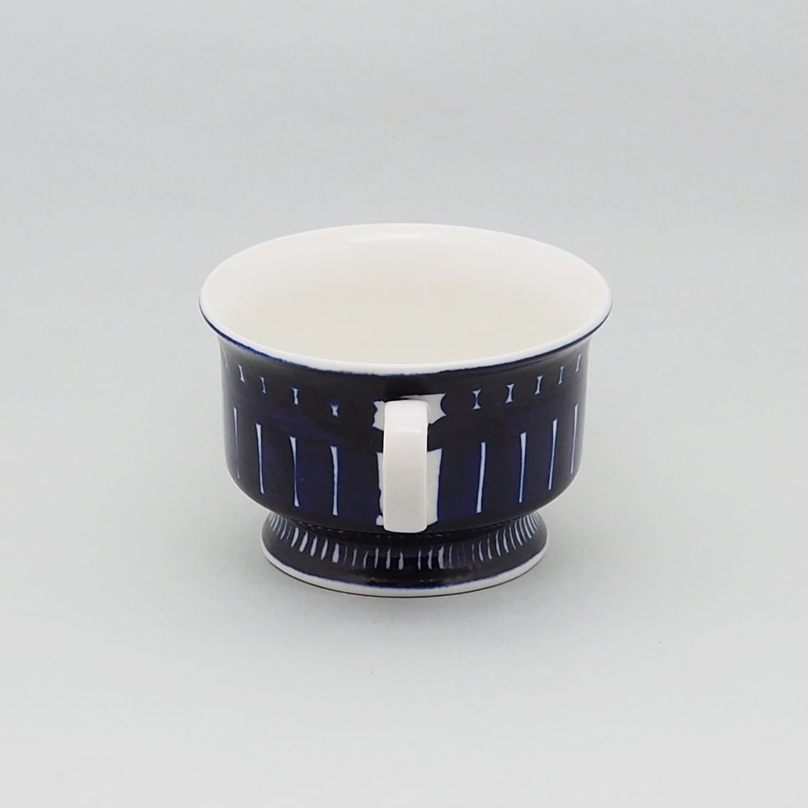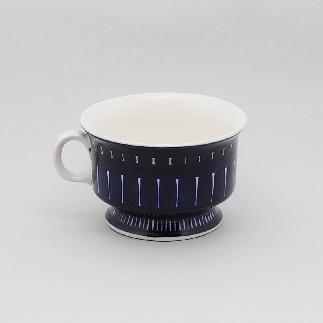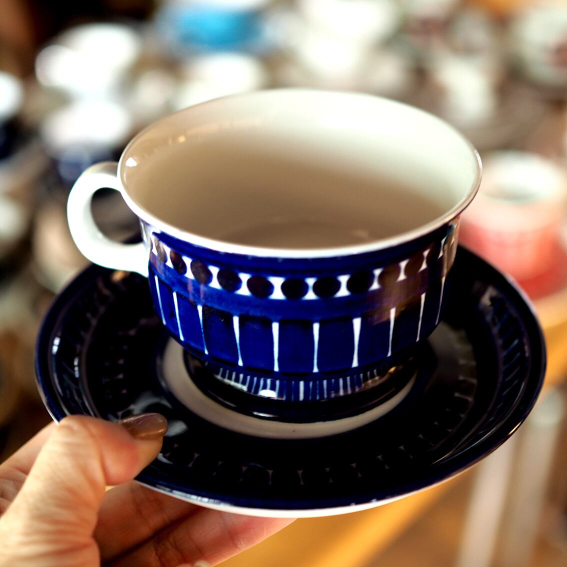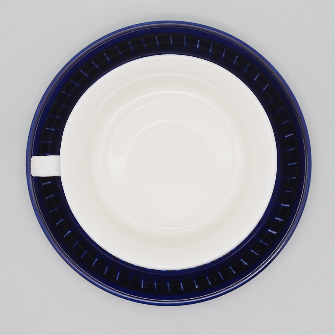 アラビア社を代表するデザイナー、ウラ・プロコッペがデザインしたシリーズの中でも人気が高くコレクターが多いValencia(バレンシア)シリーズ。はっとするくらい美しいコバルトブルーの絵柄はすべてフリーハンドで描かれたもので、全く同じものはひとつもありません。また、裏面のハンドペイントサインは、1960年代初期にフィンランド国内販売用に製作されたものにしか見ることができない貴重なものです。「バレンシア」とはスペインの州都の名で、若い頃を南欧で過ごした彼女がスペインの影響を受けてデザインしたと言われています。のびのびと大胆に描かれたハンドペイントは、南欧の明るい太陽やおおらかな空気を表現したのでしょうか。こちらは中でも出会うのが難しい大きなティーカップ&ソーサー。コンディションも良好でレアなアイテムですが、ぜひ普段使いとして毎日の暮らしに取り入れていただきたい名作です。