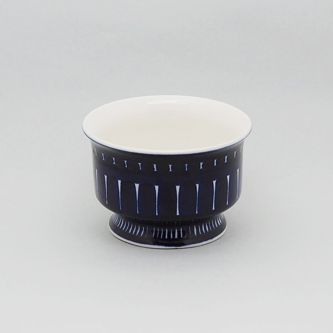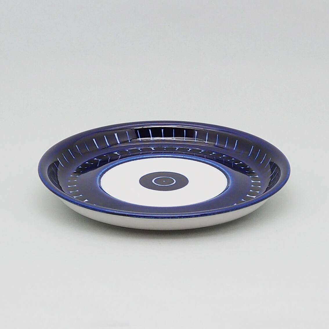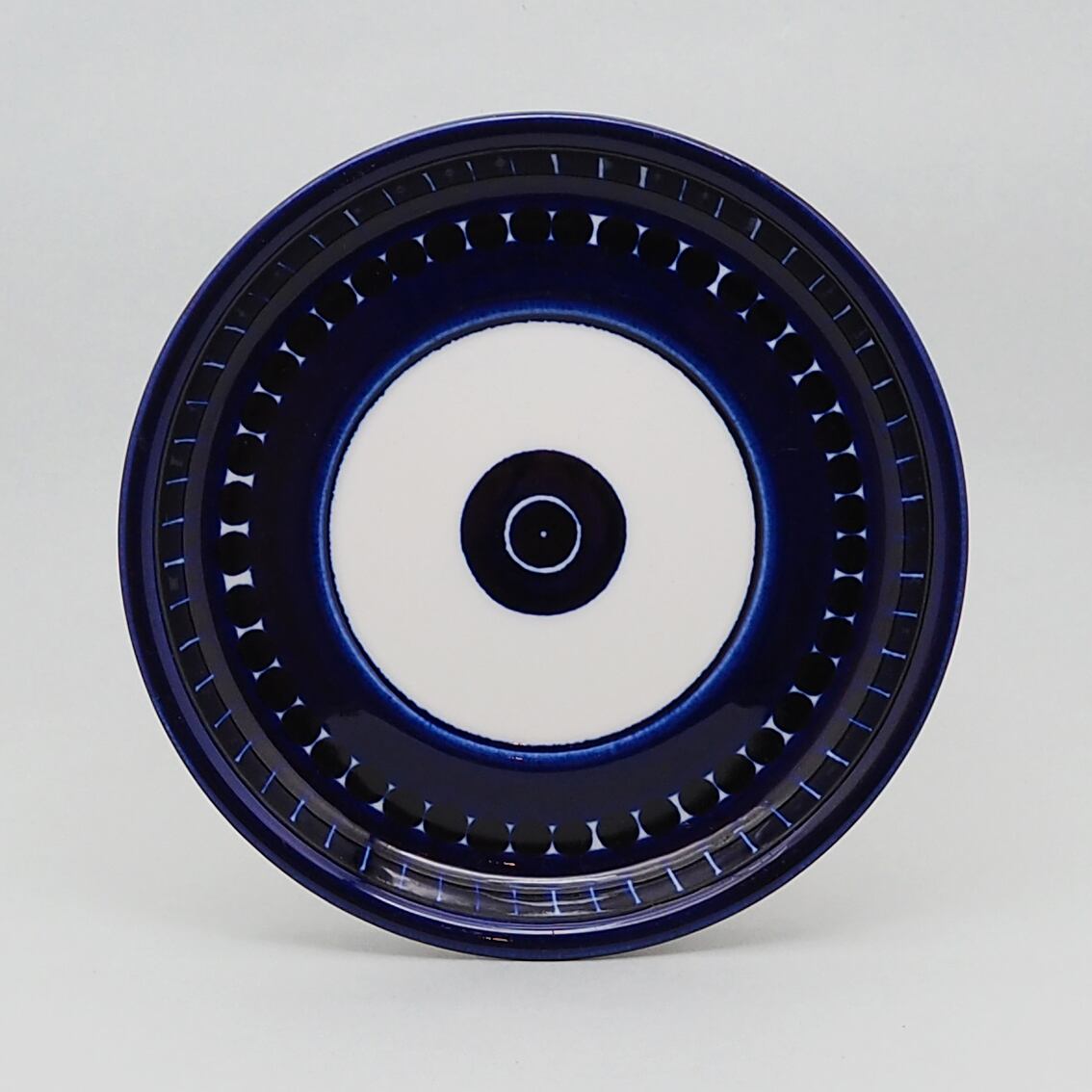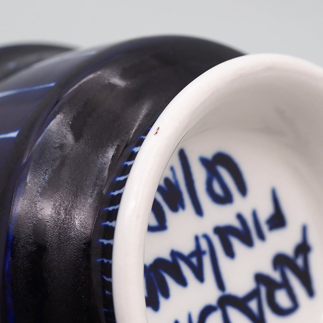 アラビア社を代表するデザイナー、ウラ・プロコッペがデザインしたシリーズの中でも人気が高くコレクターが多いValencia(バレンシア)シリーズ。はっとするくらい美しいコバルトブルーの絵柄はすべてフリーハンドで描かれたもので、全く同じものはひとつもありません。また、裏面のハンドペイントサインは、1960年代初期にフィンランド国内販売用に製作されたものにしか見ることができない貴重なものです。「バレンシア」とはスペインの州都の名で、若い頃を南欧で過ごした彼女がスペインの影響を受けてデザインしたと言われています。のびのびと大胆に描かれたハンドペイントは、南欧の明るい太陽やおおらかな空気を表現したのでしょうか。こちらは中でも出会うのが難しい大きなティーカップ&ソーサー。コンディションも良好でレアなアイテムですが、ぜひ普段使いとして毎日の暮らしに取り入れていただきたい名作です。