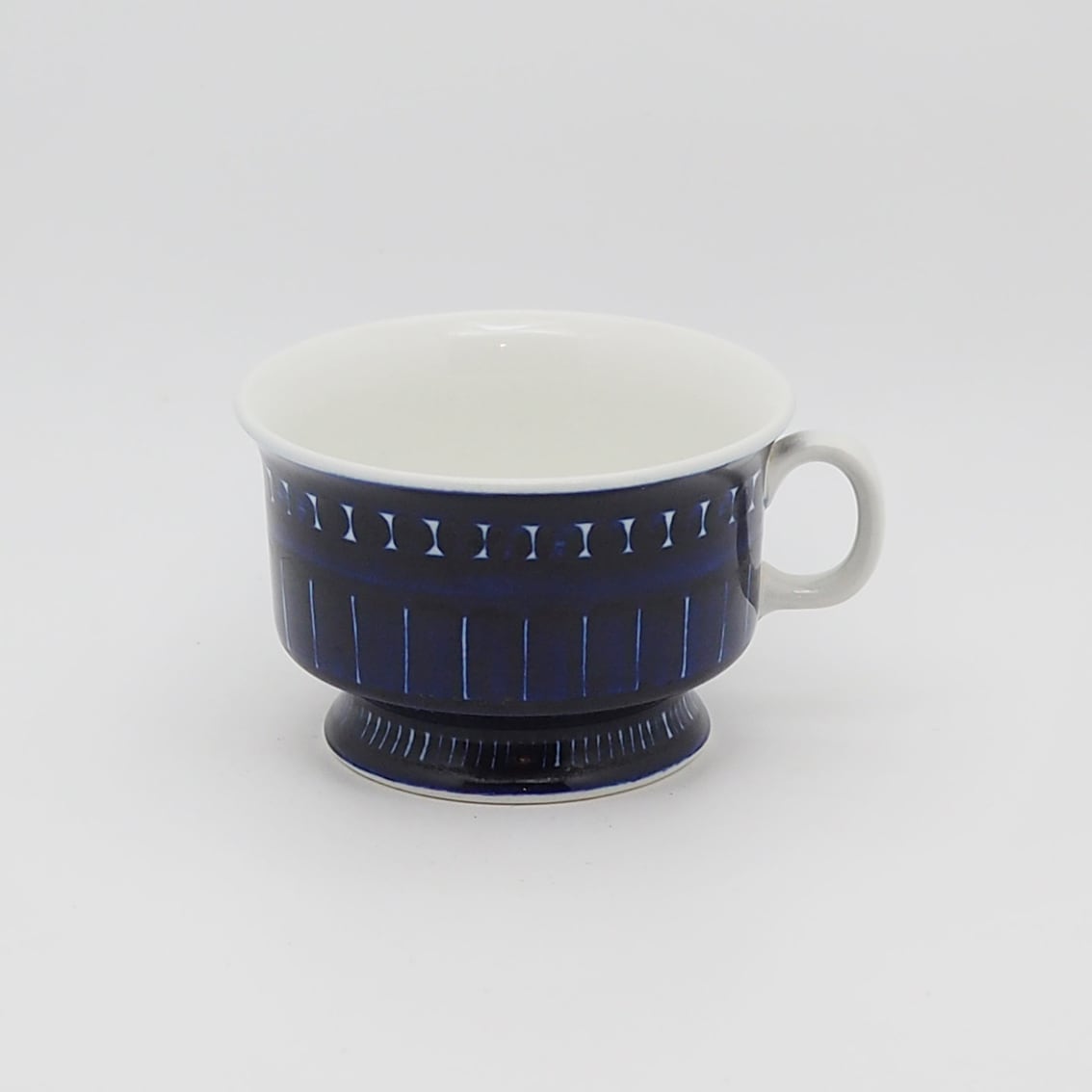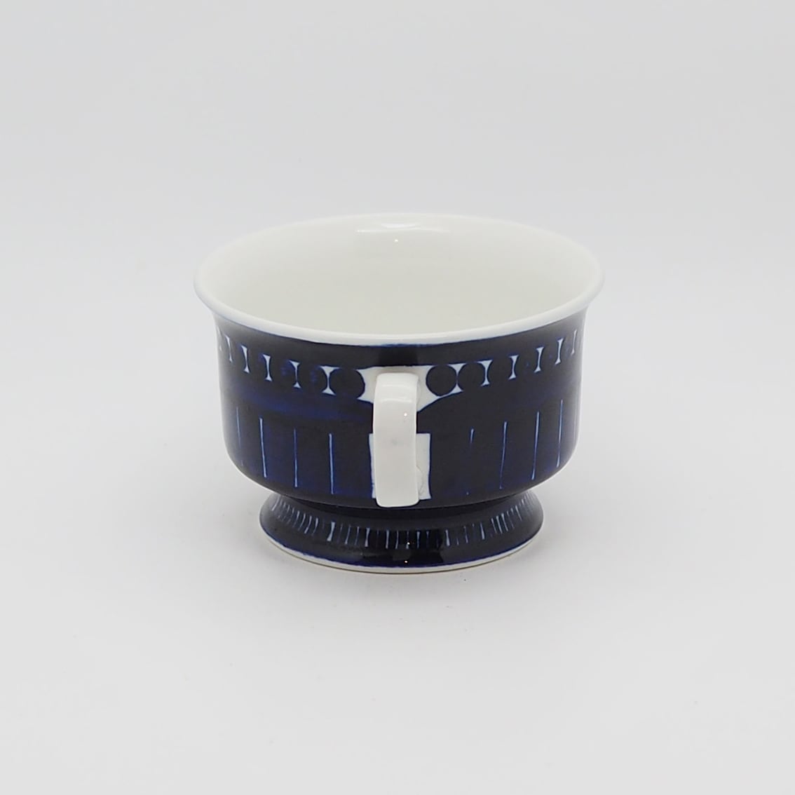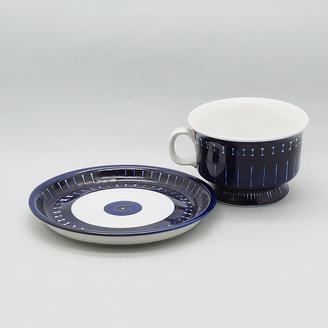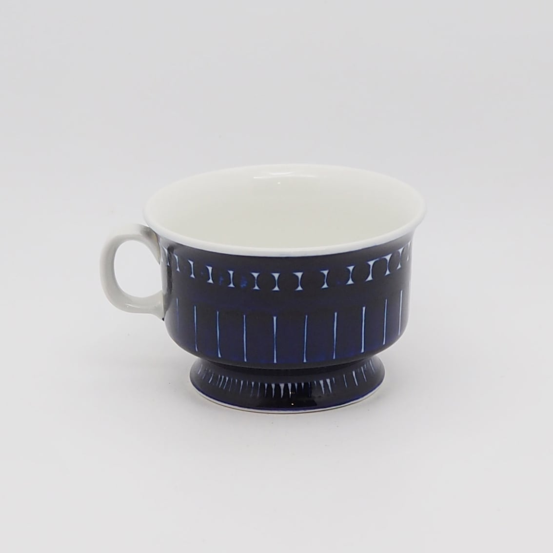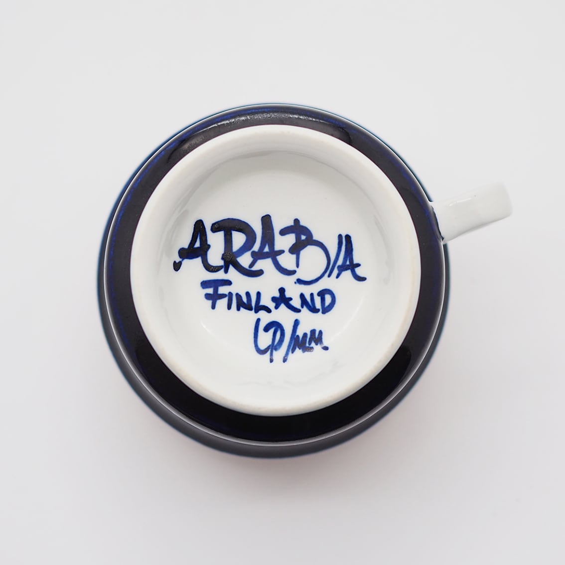 アラビア社を代表するデザイナー、ウラ・プロコッペがデザインしたシリーズの中でも人気が高くコレクターが多いValencia(バレンシア)シリーズ。はっとするくらい美しいコバルトブルーの絵柄はすべてフリーハンドで描かれたもので、全く同じものはひとつもありません。また、裏面のハンドペイントサインは、1960年代初期にフィンランド国内販売用に製作されたものにしか見ることができない貴重なものです。「バレンシア」とはスペインの州都の名で、若い頃を南欧で過ごした彼女がスペインの影響を受けてデザインしたと言われています。のびのびと大胆に描かれたハンドペイントは、南欧の明るい太陽やおおらかな空気を表現したのでしょうか。こちらは中でも出会うのが難しい大きなティーカップ&ソーサー。コンディションも良好でレアなアイテムですが、ぜひ普段使いとして毎日の暮らしに取り入れていただきたい名作です。