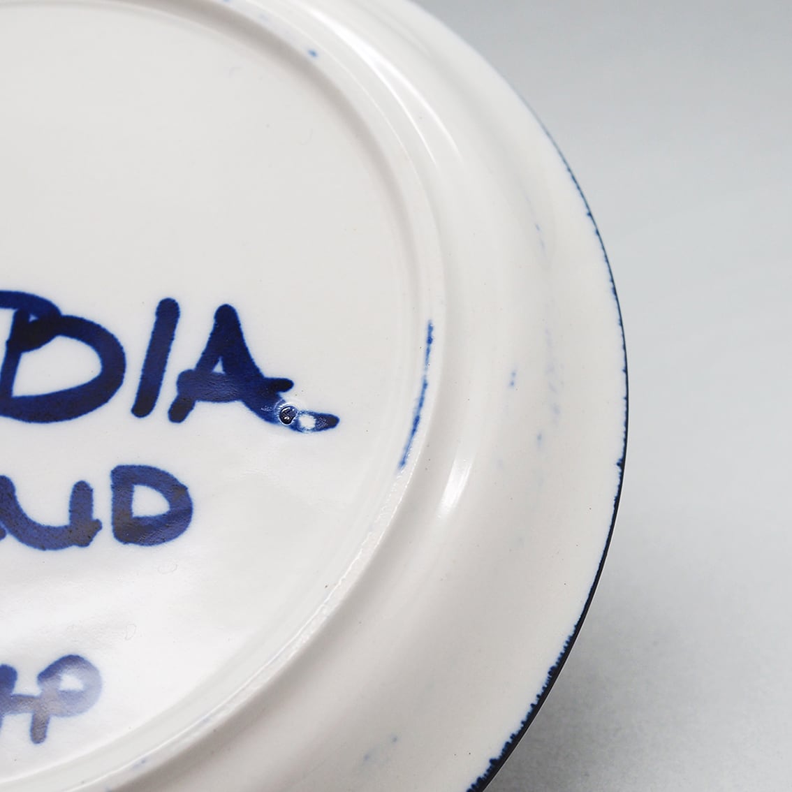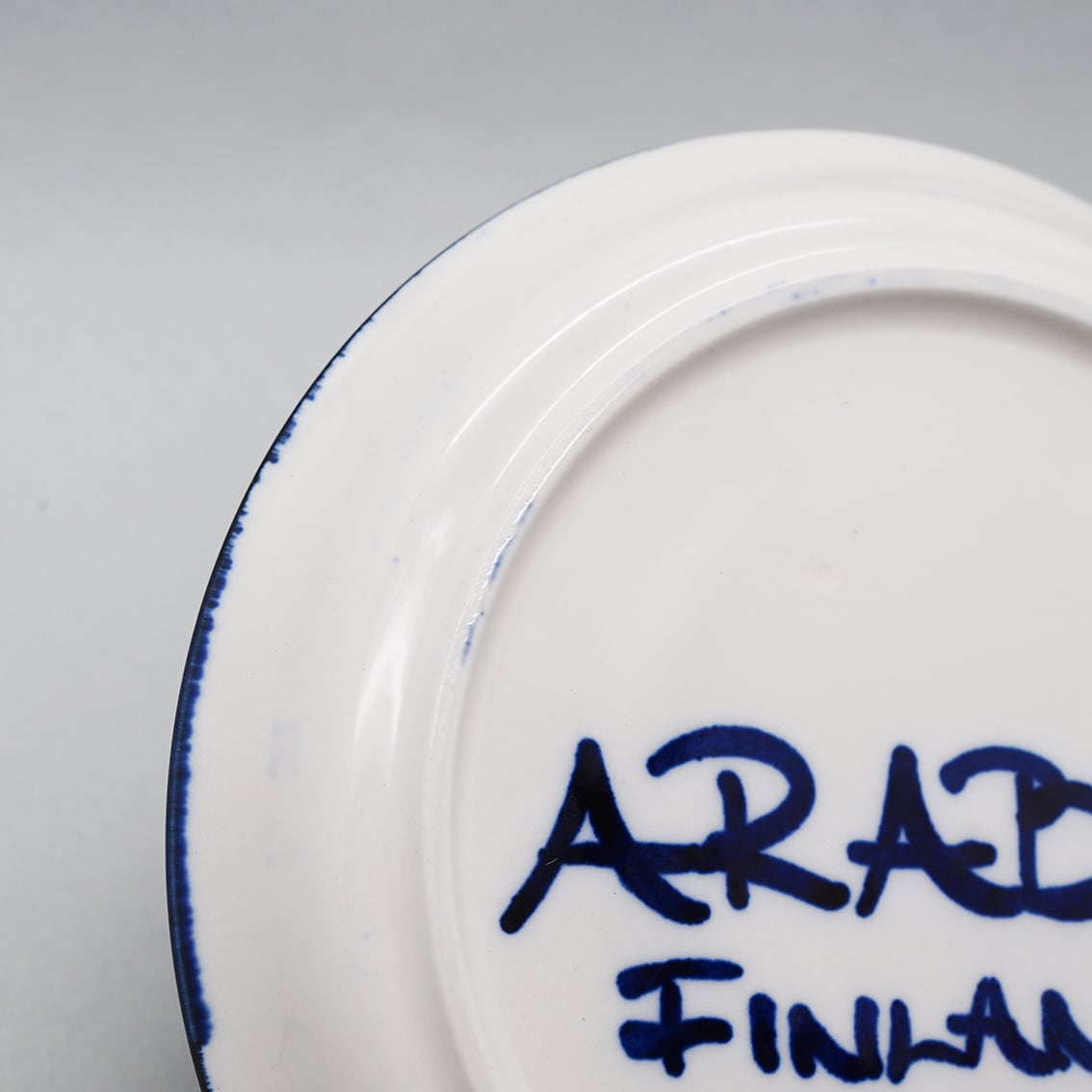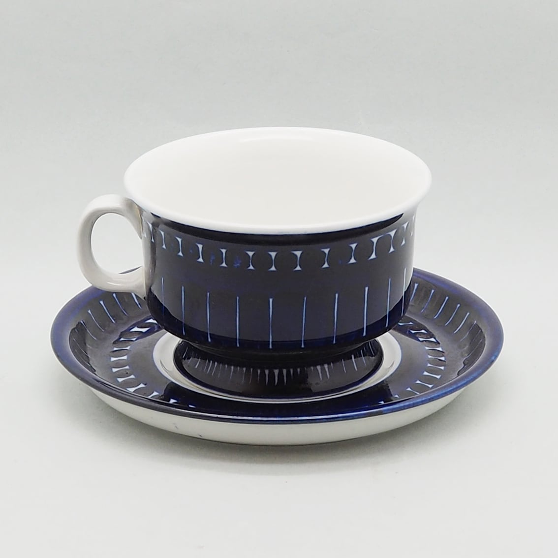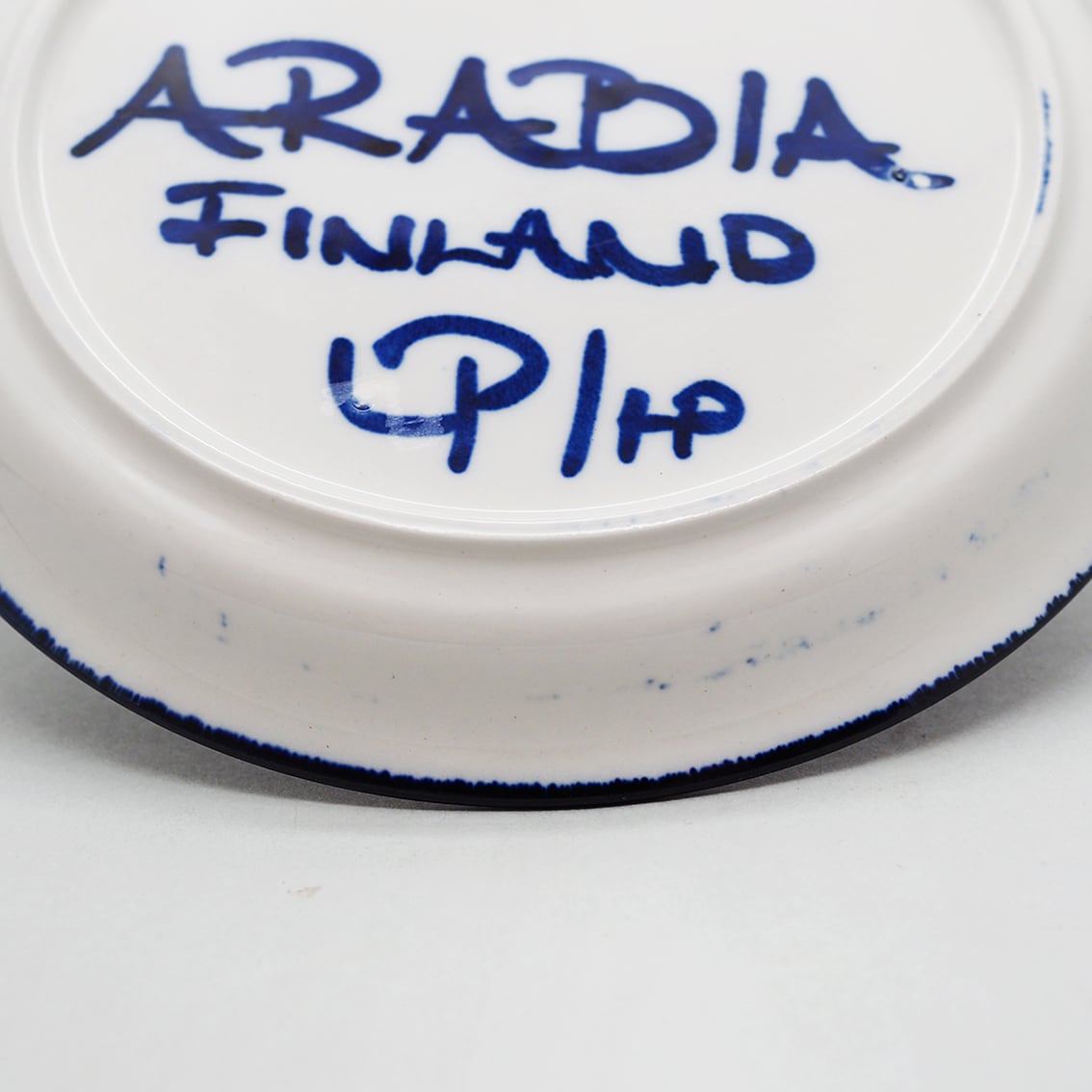 アラビア社を代表するデザイナー、ウラ・プロコッペがデザインしたシリーズの中でも人気が高くコレクターが多いValencia(バレンシア)シリーズ。はっとするくらい美しいコバルトブルーの絵柄はすべてフリーハンドで描かれたもので、全く同じものはひとつもありません。また、裏面のハンドペイントサインは、1960年代初期にフィンランド国内販売用に製作されたものにしか見ることができない貴重なものです。「バレンシア」とはスペインの州都の名で、若い頃を南欧で過ごした彼女がスペインの影響を受けてデザインしたと言われています。のびのびと大胆に描かれたハンドペイントは、南欧の明るい太陽やおおらかな空気を表現したのでしょうか。こちらは中でも出会うのが難しい大きなティーカップ&ソーサー。コンディションも良好でレアなアイテムですが、ぜひ普段使いとして毎日の暮らしに取り入れていただきたい名作です。