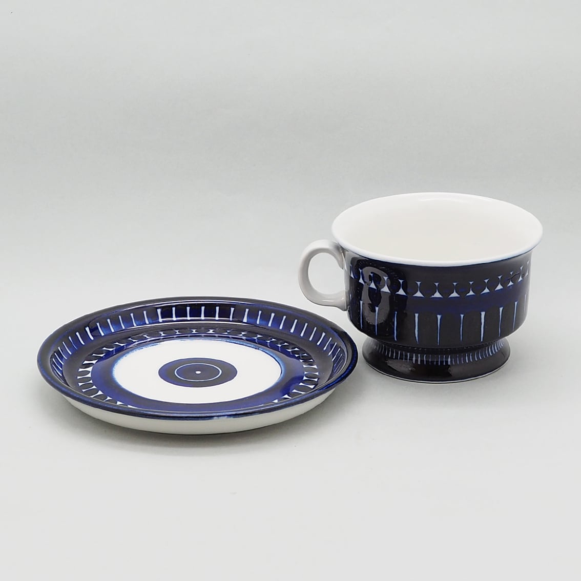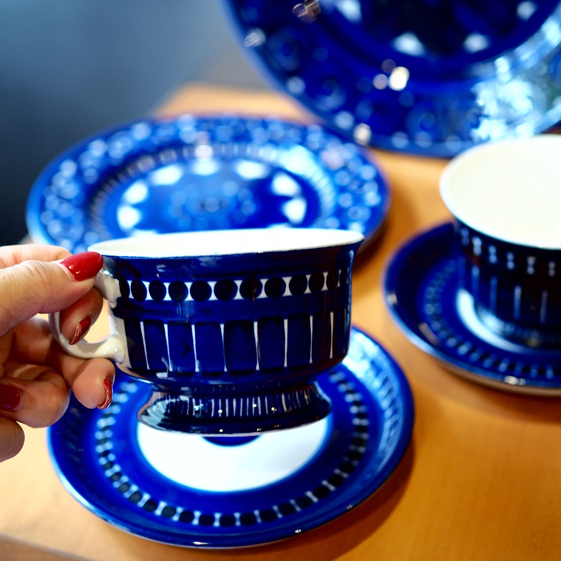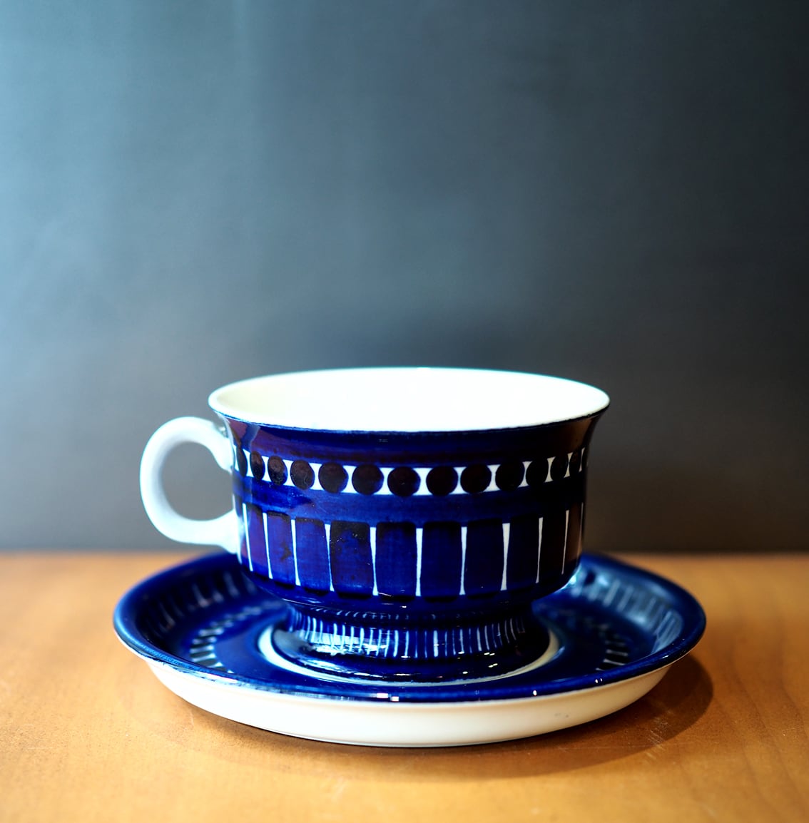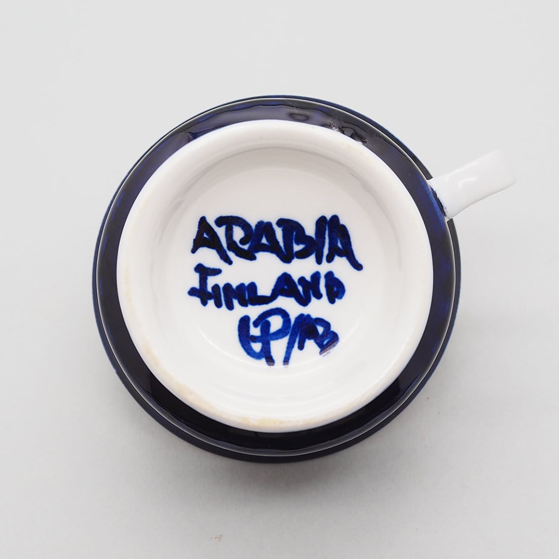 アラビア社を代表するデザイナー、ウラ・プロコッペがデザインしたシリーズの中でも人気が高くコレクターが多いValencia(バレンシア)シリーズ。はっとするくらい美しいコバルトブルーの絵柄はすべてフリーハンドで描かれたもので、全く同じものはひとつもありません。また、裏面のハンドペイントサインは、1960年代初期にフィンランド国内販売用に製作されたものにしか見ることができない貴重なものです。「バレンシア」とはスペインの州都の名で、若い頃を南欧で過ごした彼女がスペインの影響を受けてデザインしたと言われています。のびのびと大胆に描かれたハンドペイントは、南欧の明るい太陽やおおらかな空気を表現したのでしょうか。こちらは中でも出会うのが難しい大きなティーカップ&ソーサー。コンディションも良好でレアなアイテムですが、ぜひ普段使いとして毎日の暮らしに取り入れていただきたい名作です。