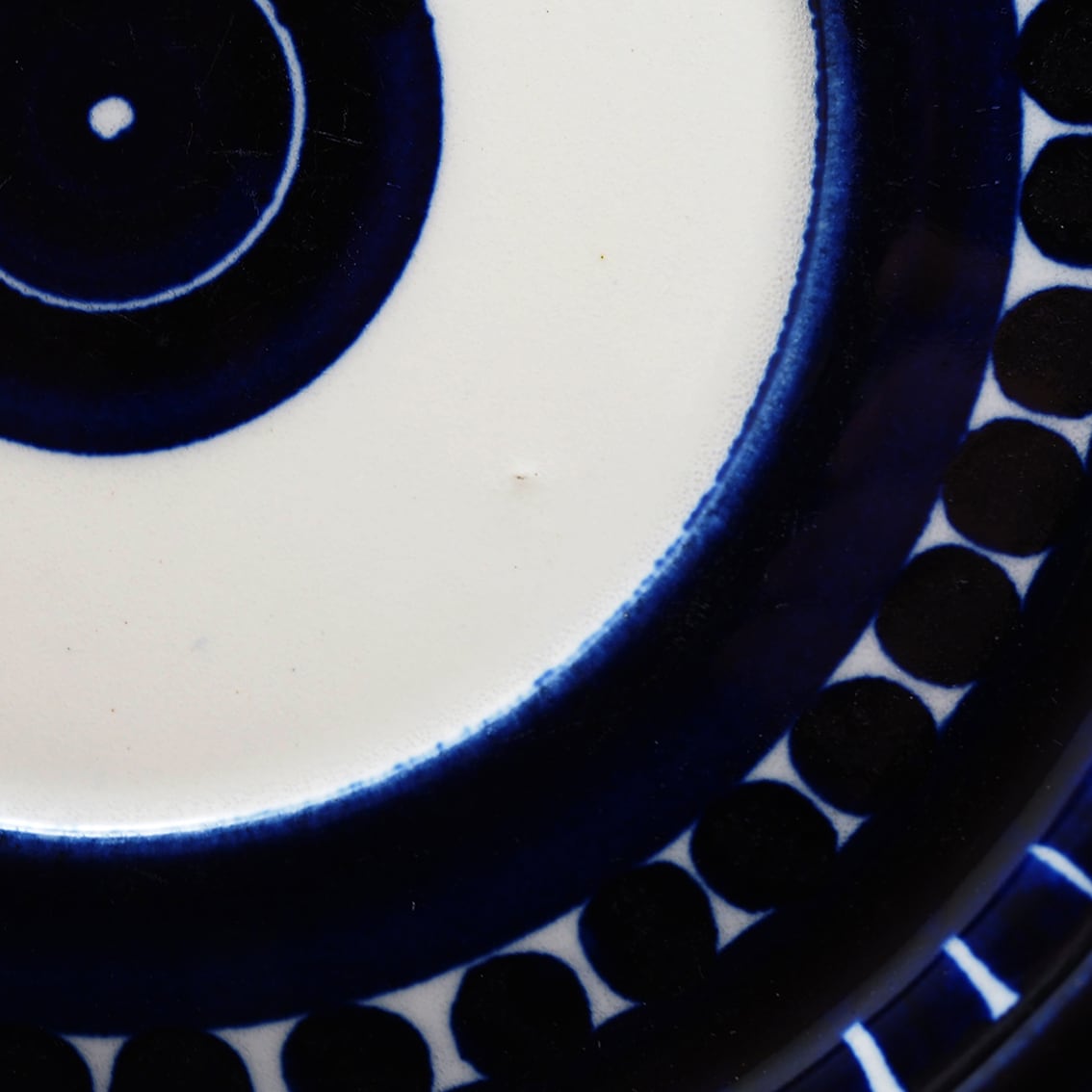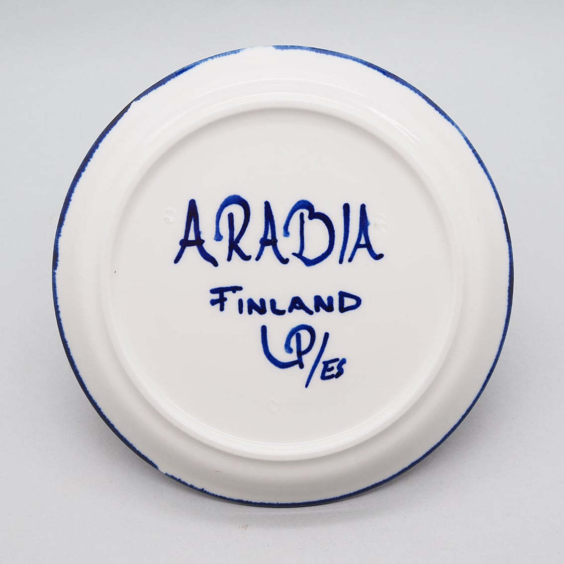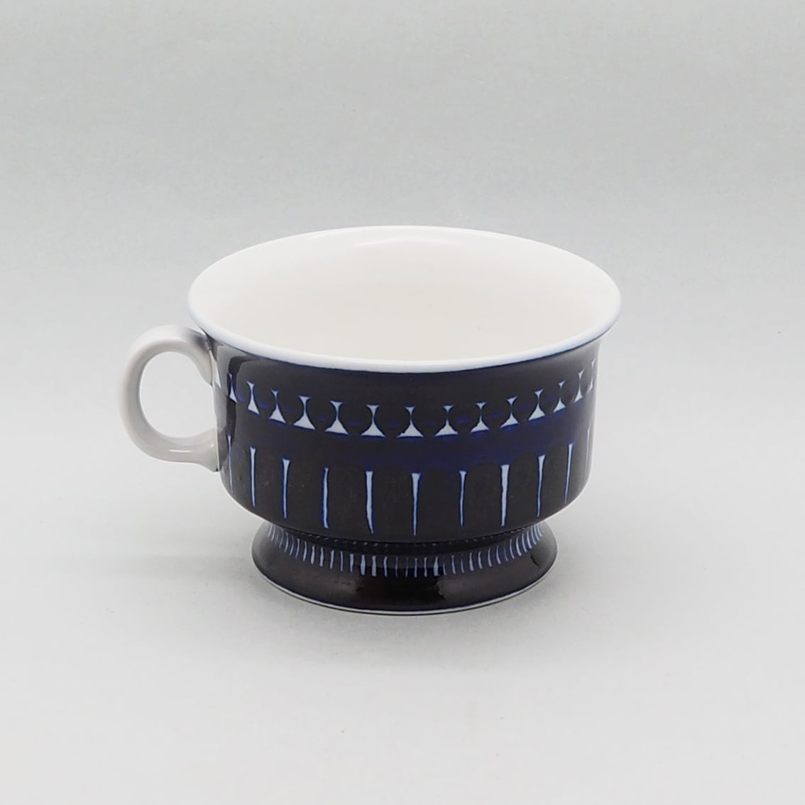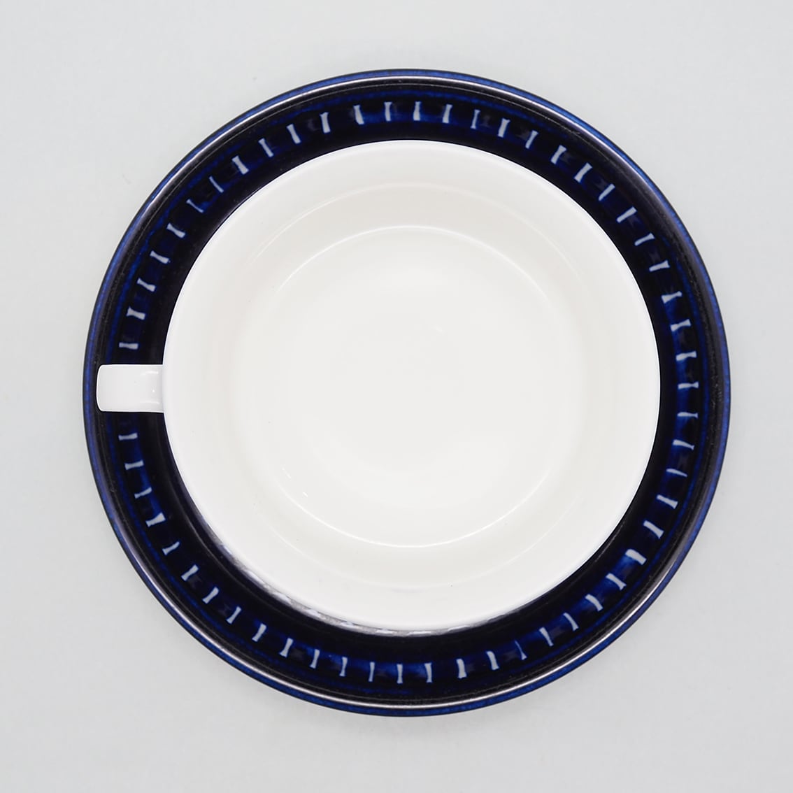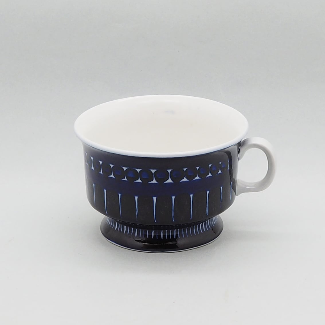 アラビア社を代表するデザイナー、ウラ・プロコッペがデザインしたシリーズの中でも人気が高くコレクターが多いValencia(バレンシア)シリーズ。はっとするくらい美しいコバルトブルーの絵柄はすべてフリーハンドで描かれたもので、全く同じものはひとつもありません。また、裏面のハンドペイントサインは、1960年代初期にフィンランド国内販売用に製作されたものにしか見ることができない貴重なものです。「バレンシア」とはスペインの州都の名で、若い頃を南欧で過ごした彼女がスペインの影響を受けてデザインしたと言われています。のびのびと大胆に描かれたハンドペイントは、南欧の明るい太陽やおおらかな空気を表現したのでしょうか。こちらは中でも出会うのが難しい大きなティーカップ&ソーサー。コンディションも良好でレアなアイテムですが、ぜひ普段使いとして毎日の暮らしに取り入れていただきたい名作です。