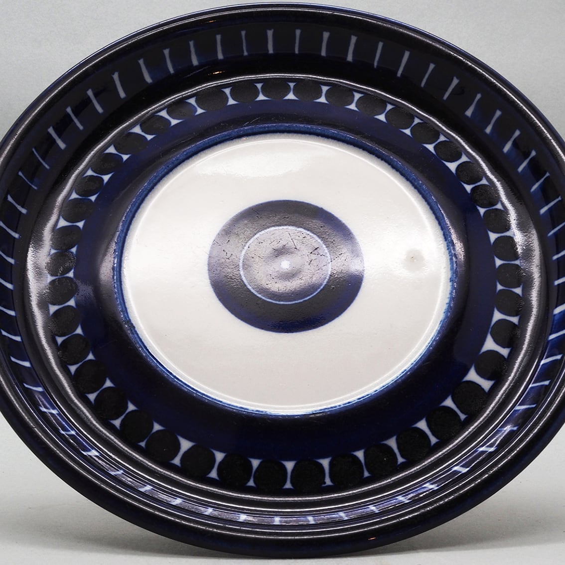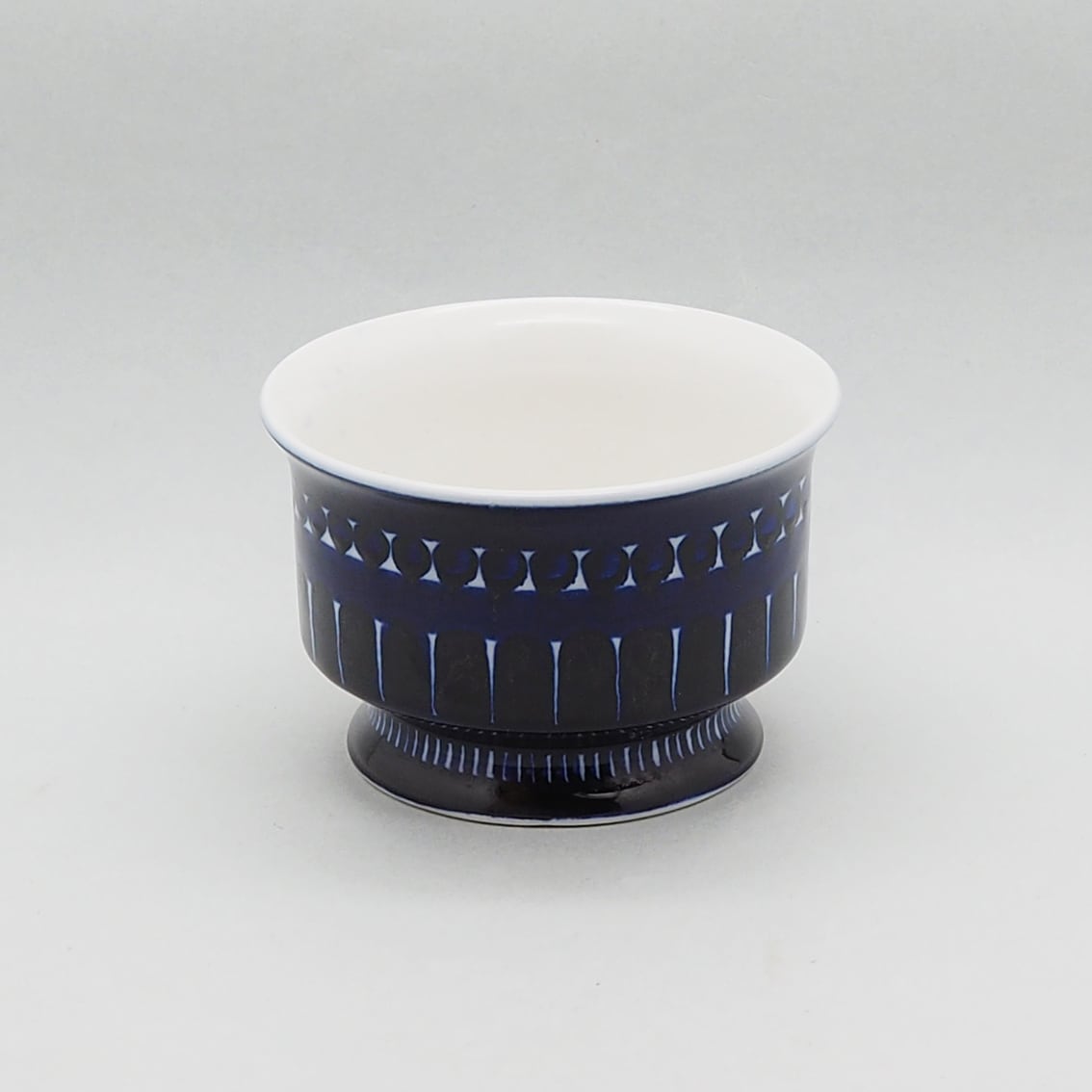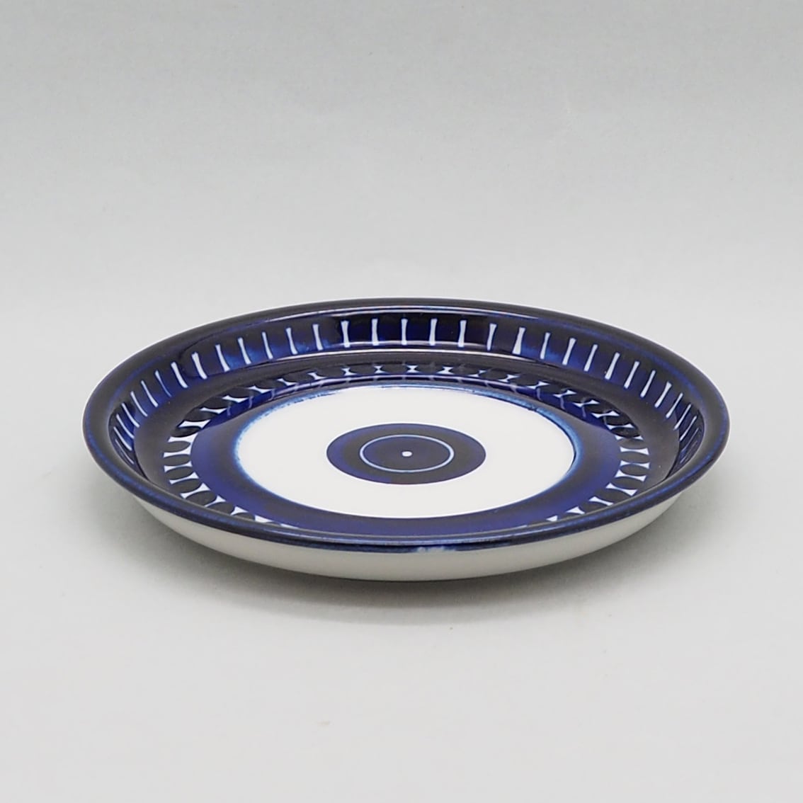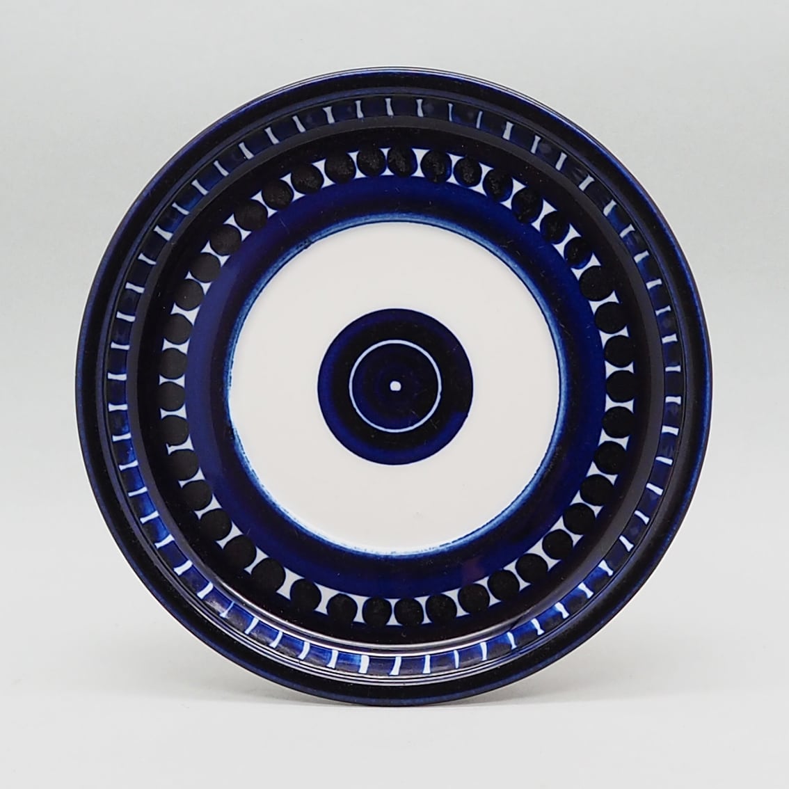 アラビア社を代表するデザイナー、ウラ・プロコッペがデザインしたシリーズの中でも人気が高くコレクターが多いValencia(バレンシア)シリーズ。はっとするくらい美しいコバルトブルーの絵柄はすべてフリーハンドで描かれたもので、全く同じものはひとつもありません。また、裏面のハンドペイントサインは、1960年代初期にフィンランド国内販売用に製作されたものにしか見ることができない貴重なものです。「バレンシア」とはスペインの州都の名で、若い頃を南欧で過ごした彼女がスペインの影響を受けてデザインしたと言われています。のびのびと大胆に描かれたハンドペイントは、南欧の明るい太陽やおおらかな空気を表現したのでしょうか。こちらは中でも出会うのが難しい大きなティーカップ&ソーサー。コンディションも良好でレアなアイテムですが、ぜひ普段使いとして毎日の暮らしに取り入れていただきたい名作です。
