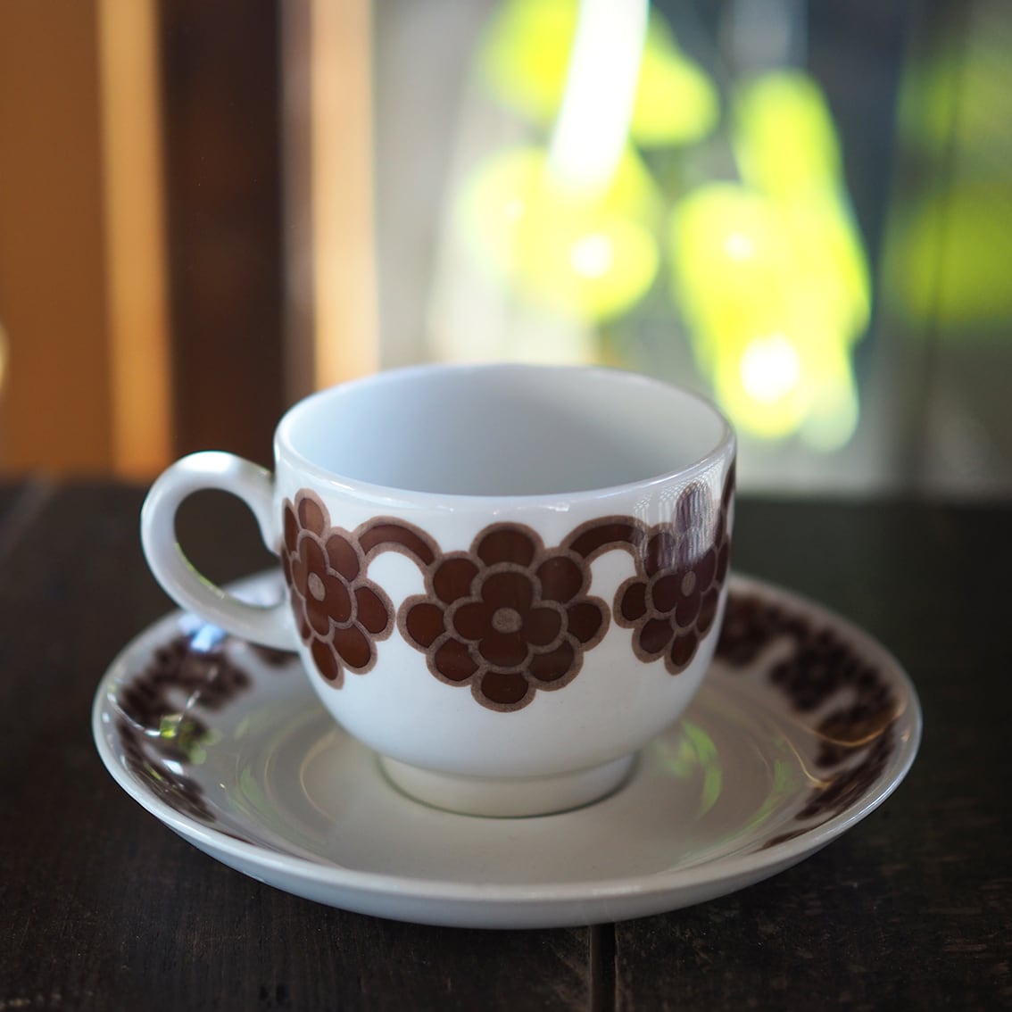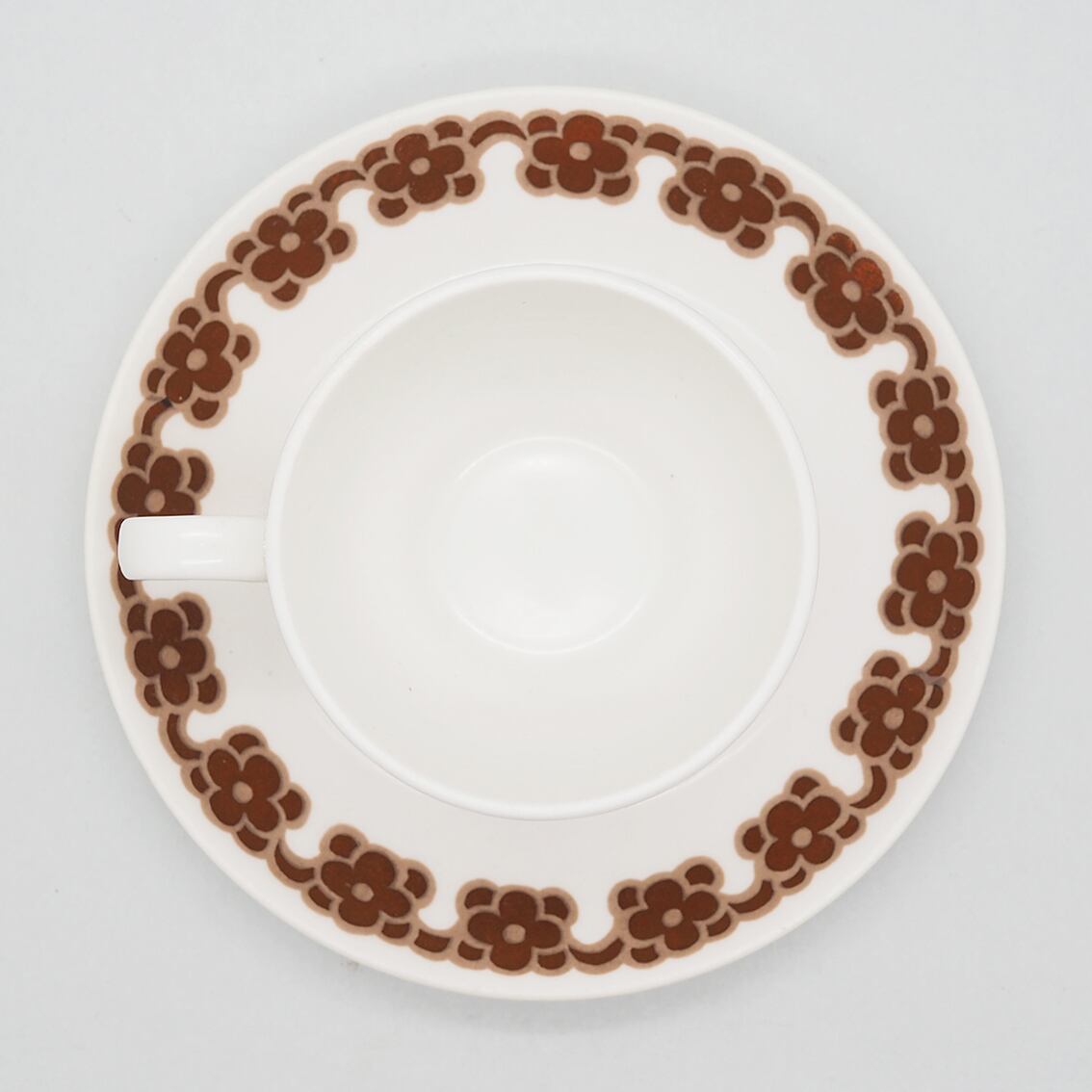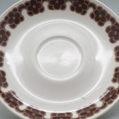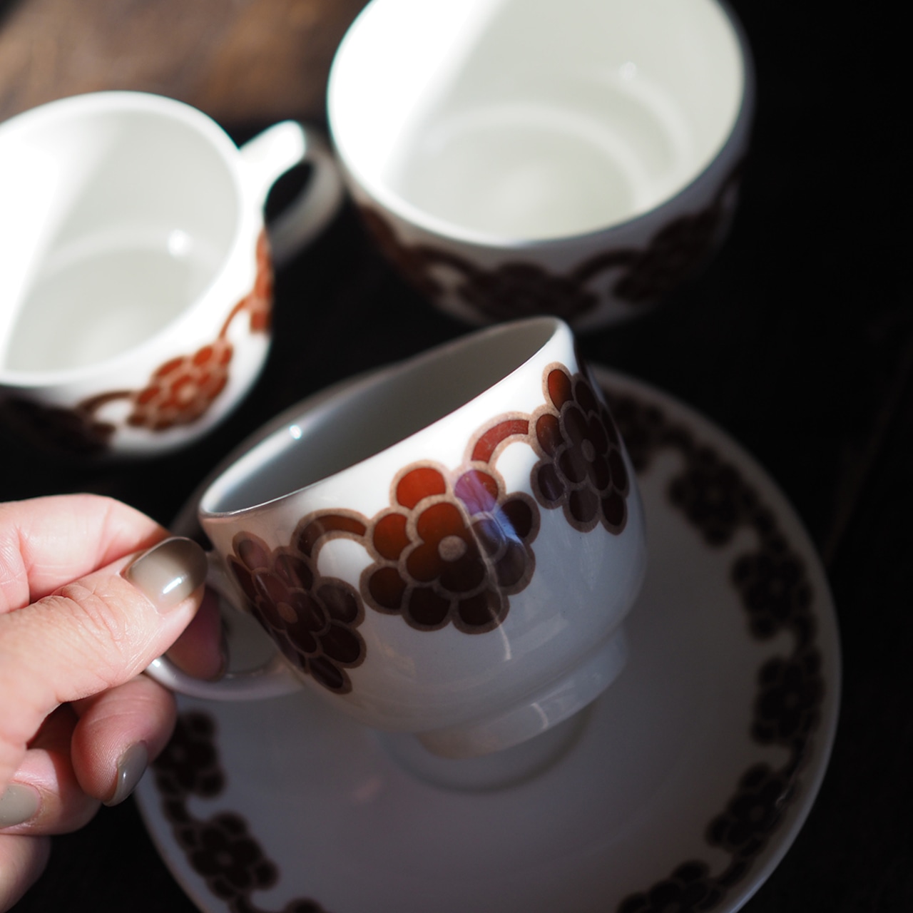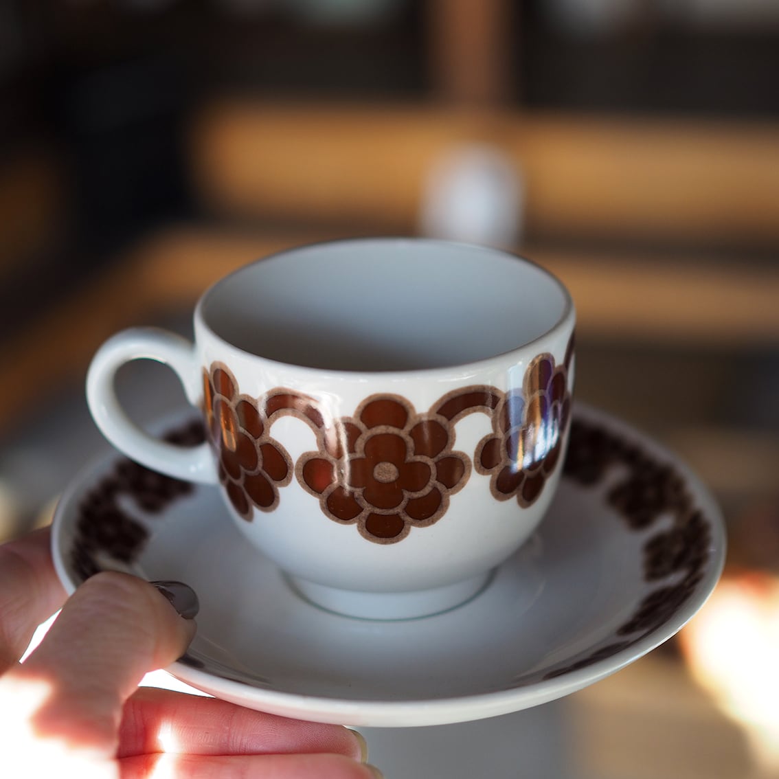 ゴラン・バックが手がけたKMモデルのぽってりと丸いフォルムに、ブラウンのレトロモダンな花柄がかわいいカップ&ソーサーです。「Suhina(スヒナ)」シリーズと双子といってもいいくらいよく似ていますが、こちらはさらに珍しく、シリーズ名が分からないマニアックな存在。クリーマーやボウルなども「Suhina(スヒナ)」と同じ展開がされているので、同時期に別バージョンとして製造されたのかもしれません。現地でもめったに出会えないレアなアイテムです。