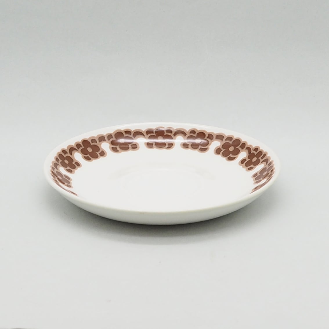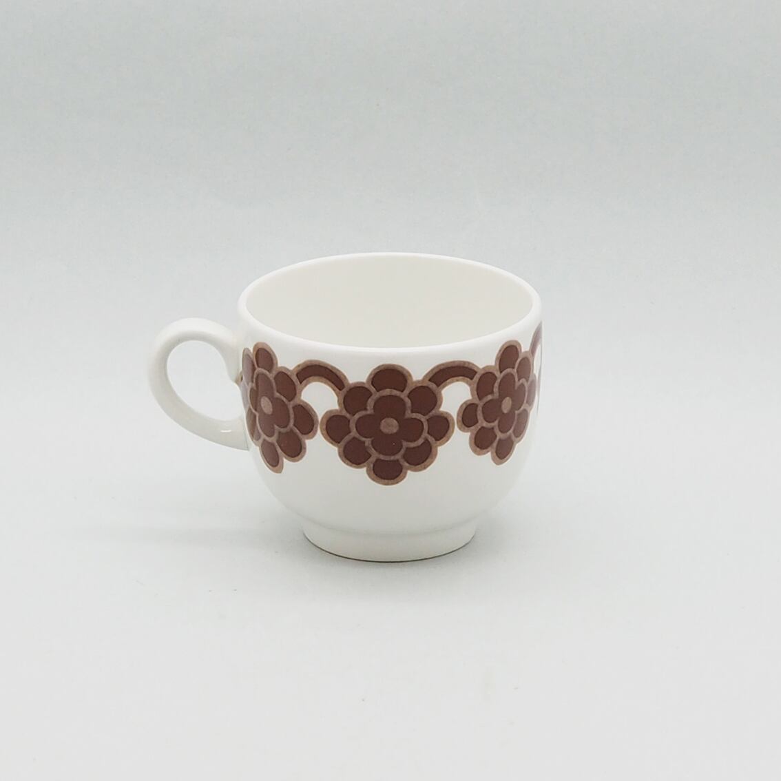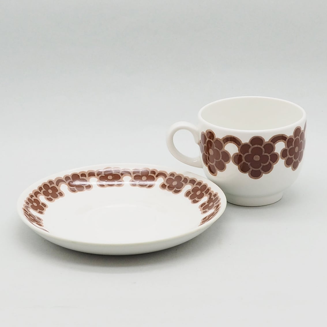 ゴラン・バックが手がけたKMモデルのぽってりと丸いフォルムに、ブラウンのレトロモダンな花柄がかわいいカップ&ソーサーです。「Suhina(スヒナ)」シリーズと双子といってもいいくらいよく似ていますが、こちらはさらに珍しく、シリーズ名が分からないマニアックな存在。クリーマーやボウルなども「Suhina(スヒナ)」と同じ展開がされているので、同時期に別バージョンとして製造されたのかもしれません。現地でもめったに出会えないレアなアイテムです。