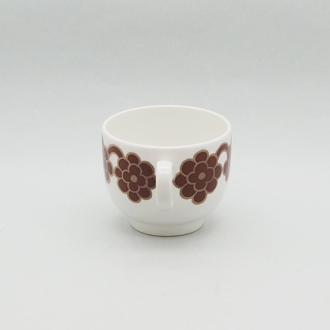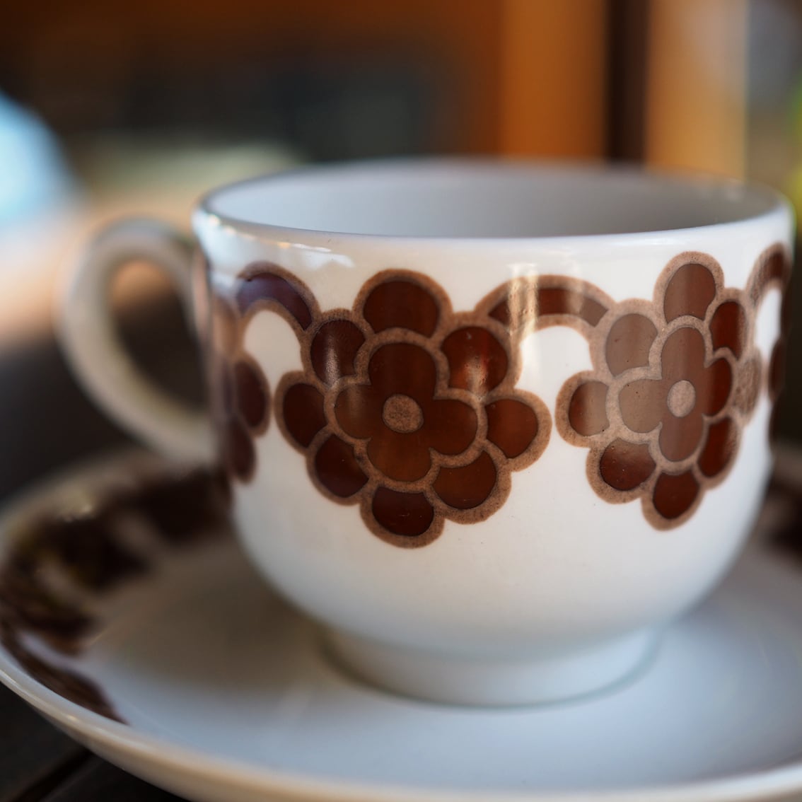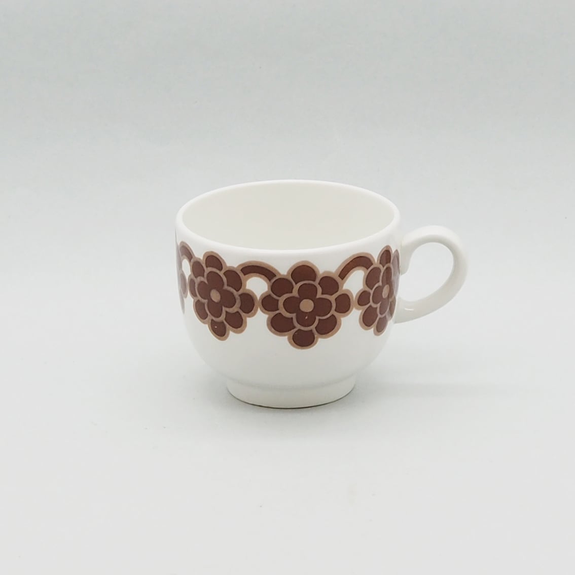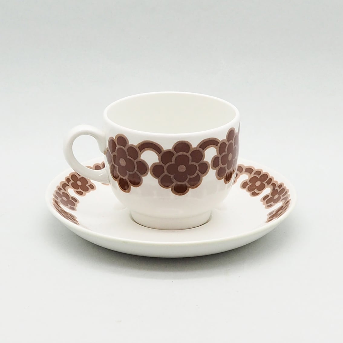 ゴラン・バックが手がけたKMモデルのぽってりと丸いフォルムに、ブラウンのレトロモダンな花柄がかわいいカップ&ソーサーです。「Suhina(スヒナ)」シリーズと双子といってもいいくらいよく似ていますが、こちらはさらに珍しく、シリーズ名が分からないマニアックな存在。クリーマーやボウルなども「Suhina(スヒナ)」と同じ展開がされているので、同時期に別バージョンとして製造されたのかもしれません。現地でもめったに出会えないレアなアイテムです。
