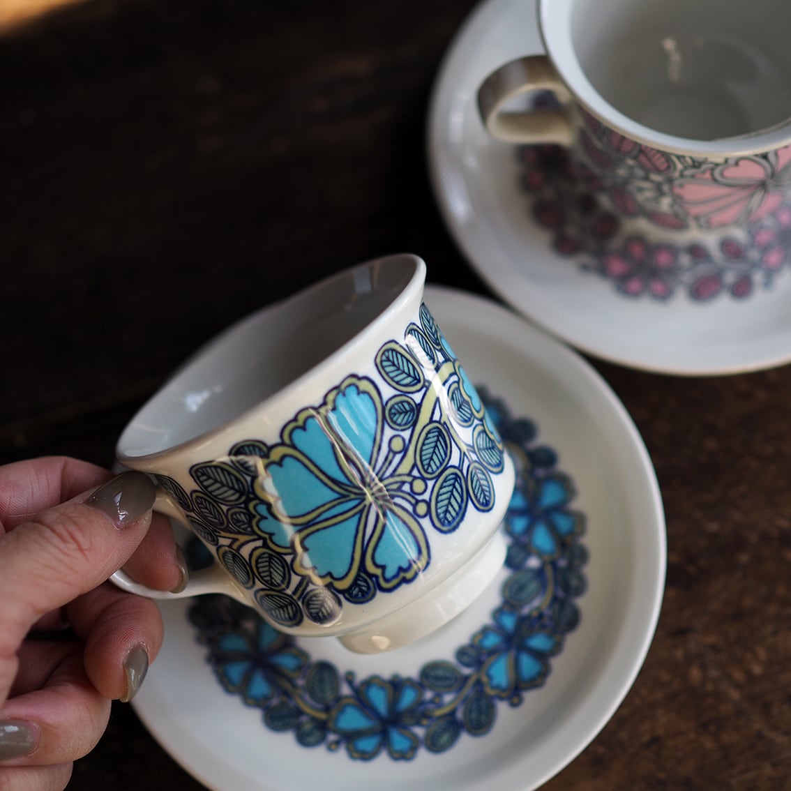 ウラ・プロコッペによるNEモデルに、ふちどりされたレトロモダンな草花が大胆に描かれたこちらのシリーズ。ピンク版のバックスタンプには「Esteri(エステリ)」という表記があり、エステリ・トムラが自身のファーストネームを冠したシリーズと思われるのですが、ブルーの方には表記がなく、さらに年代も少し違うという、ちょっぴり謎めいた存在。