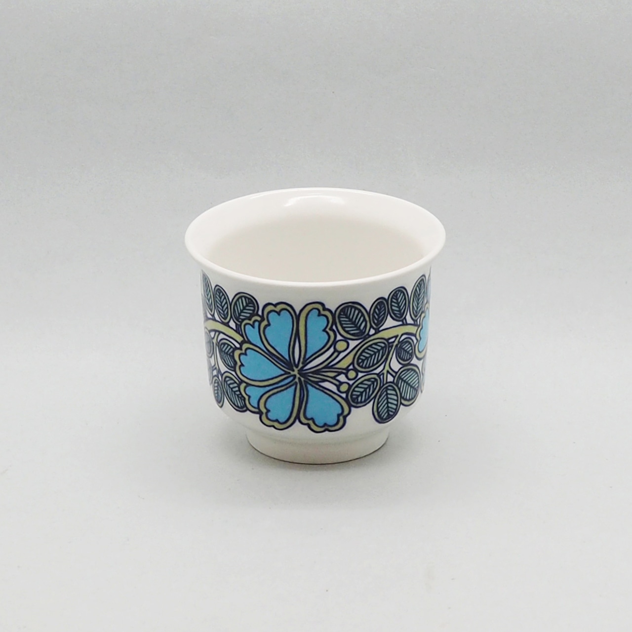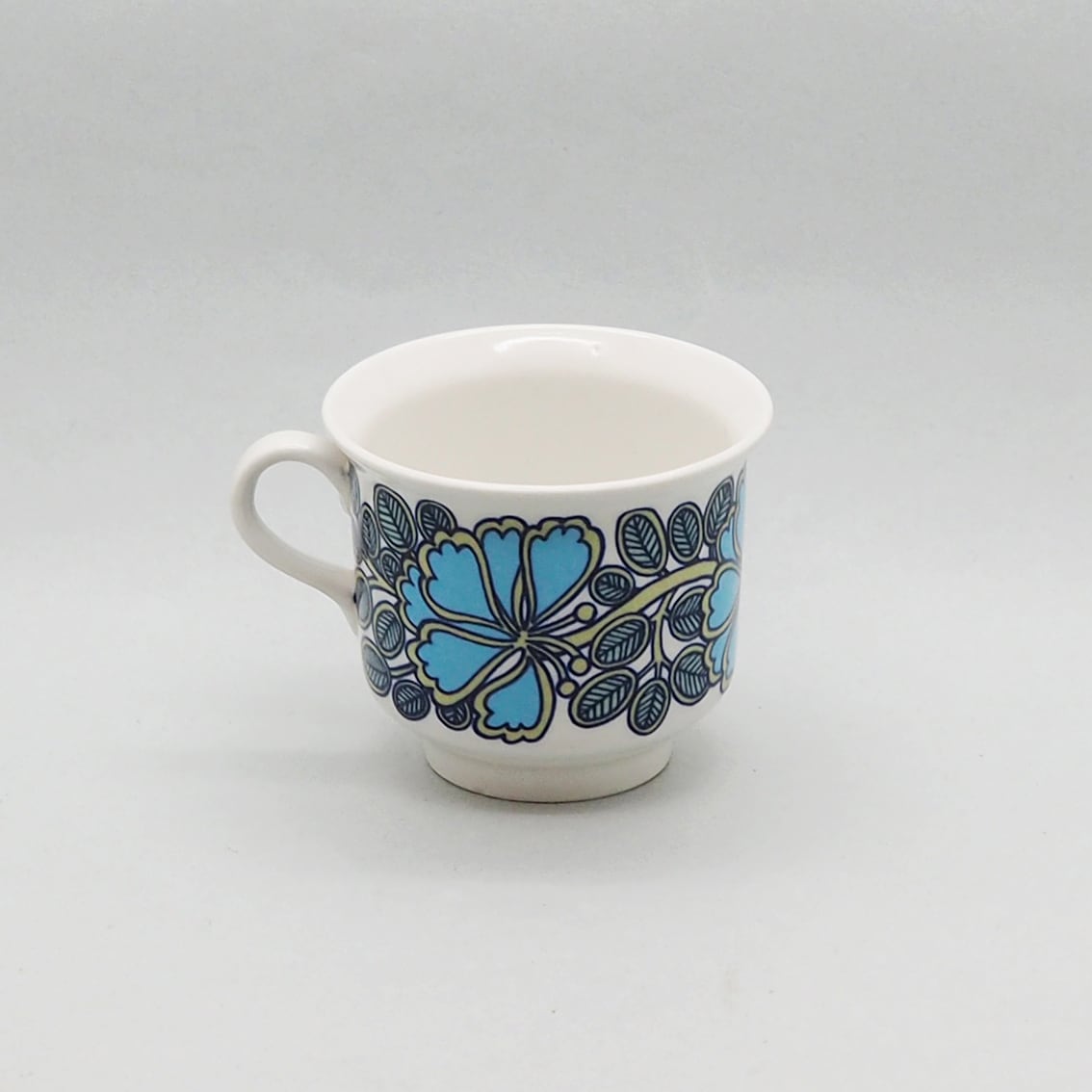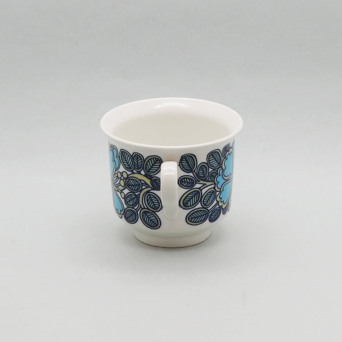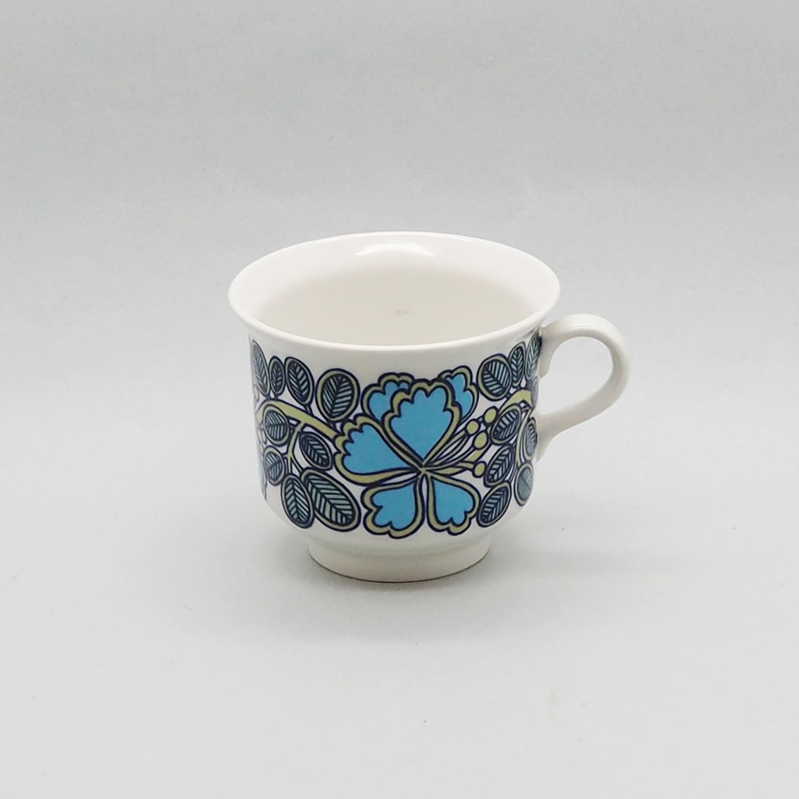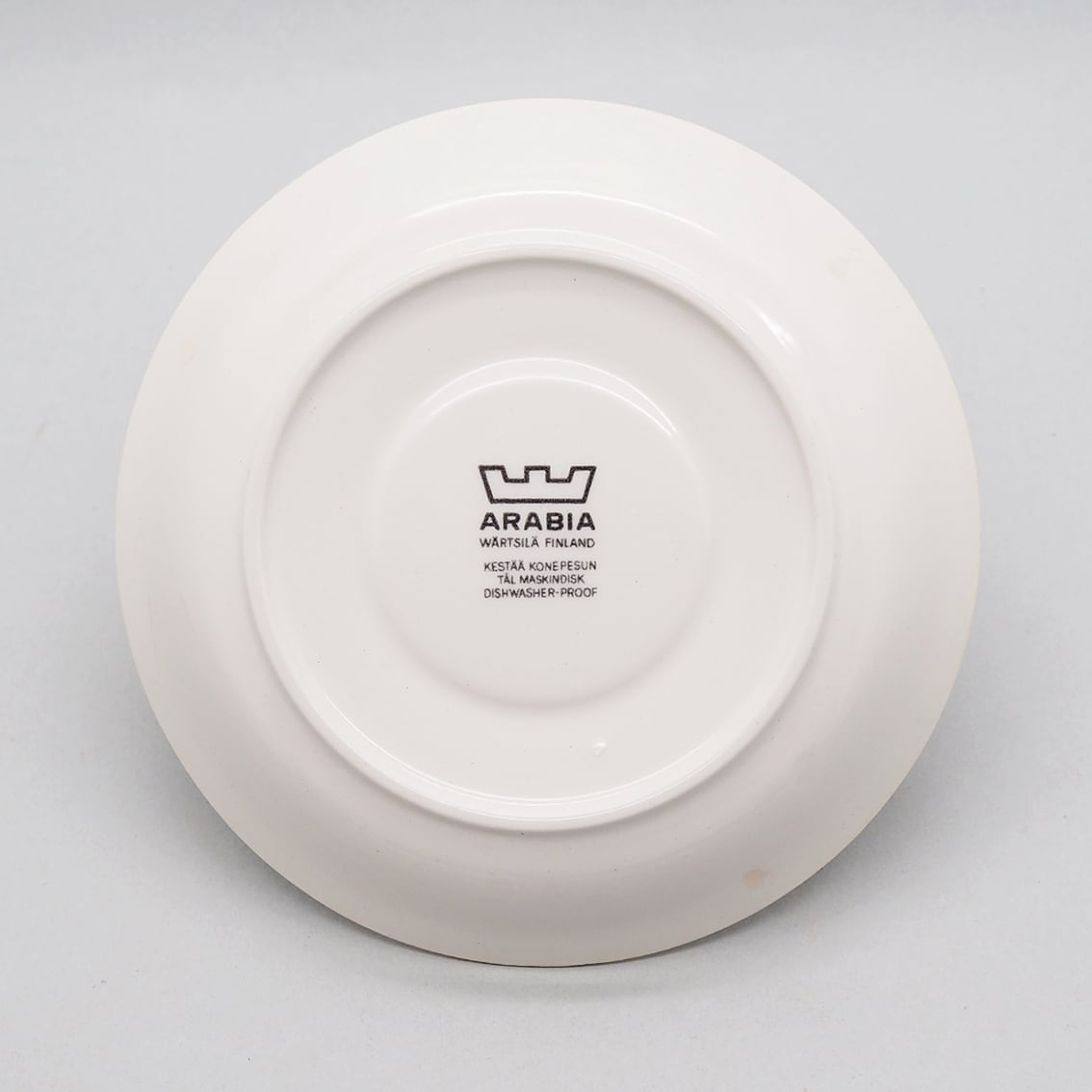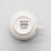 いずれにせよ、ゆるやかに広がった飲み口と高めの高台、少し立ち上がりのあるソーサーのバランスが素晴らしくチャーミングなフォルムと、独特のセンスが光るデコレーションが美しく、この年代のアラビアヴィンテーらしさを満喫できる希少なアイテムです。
