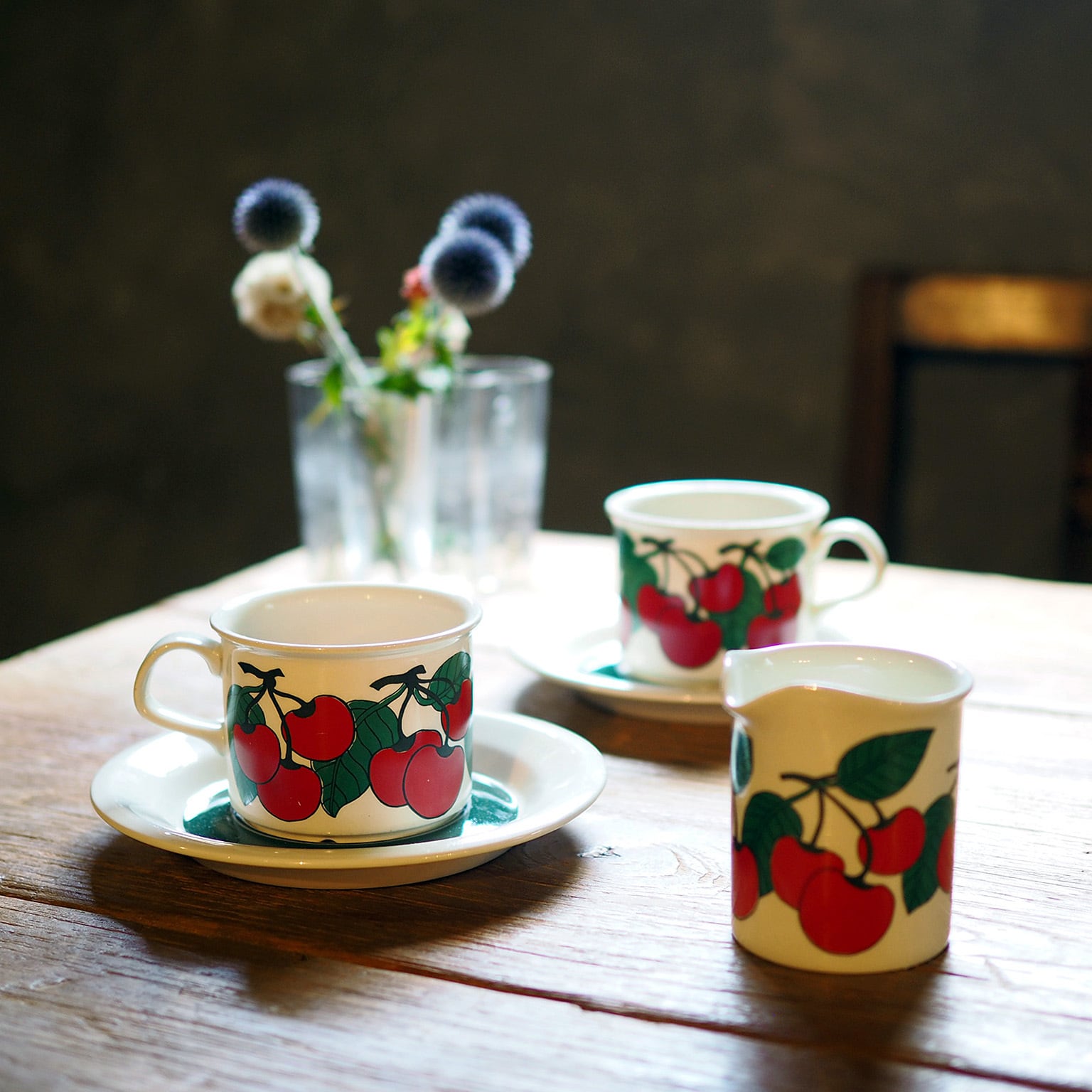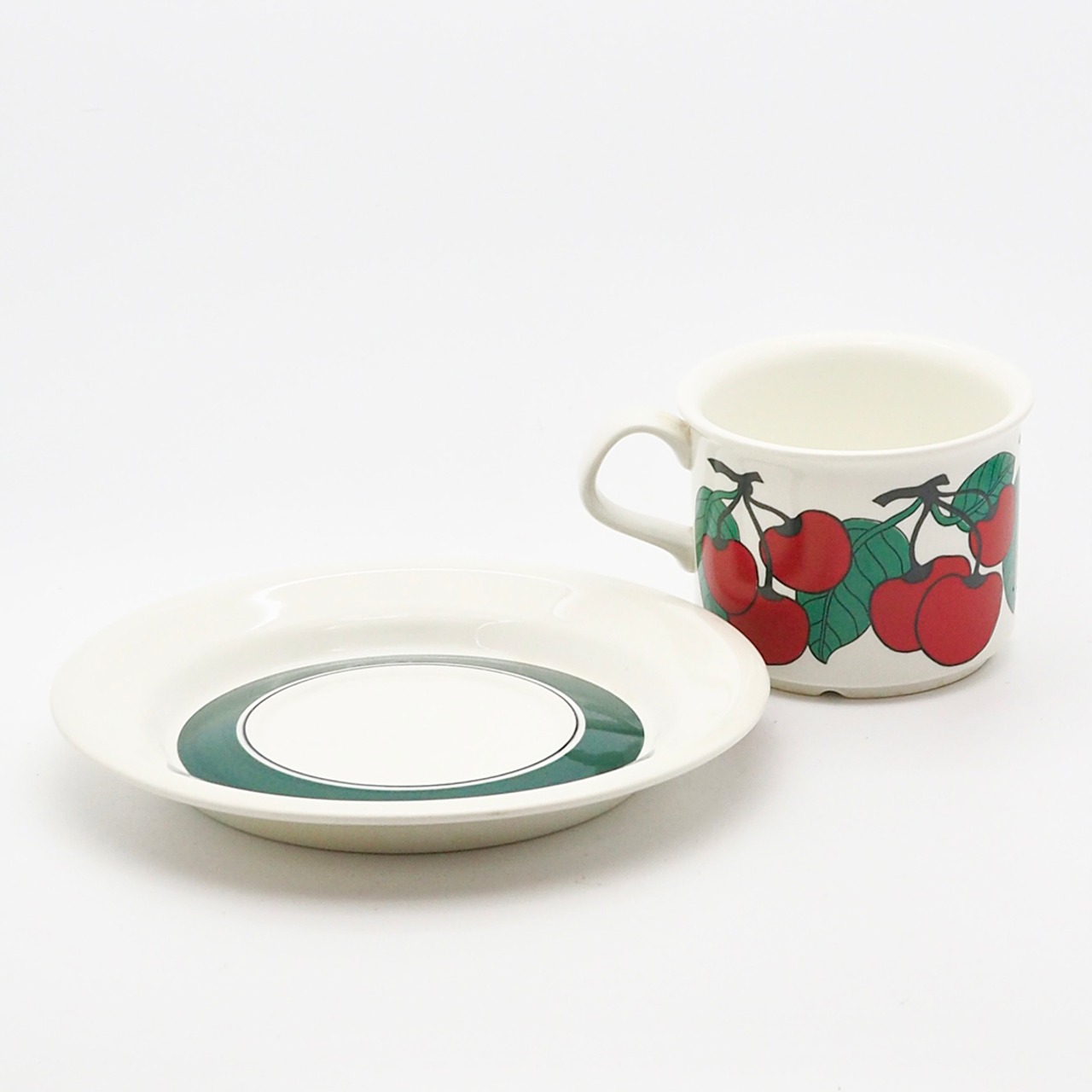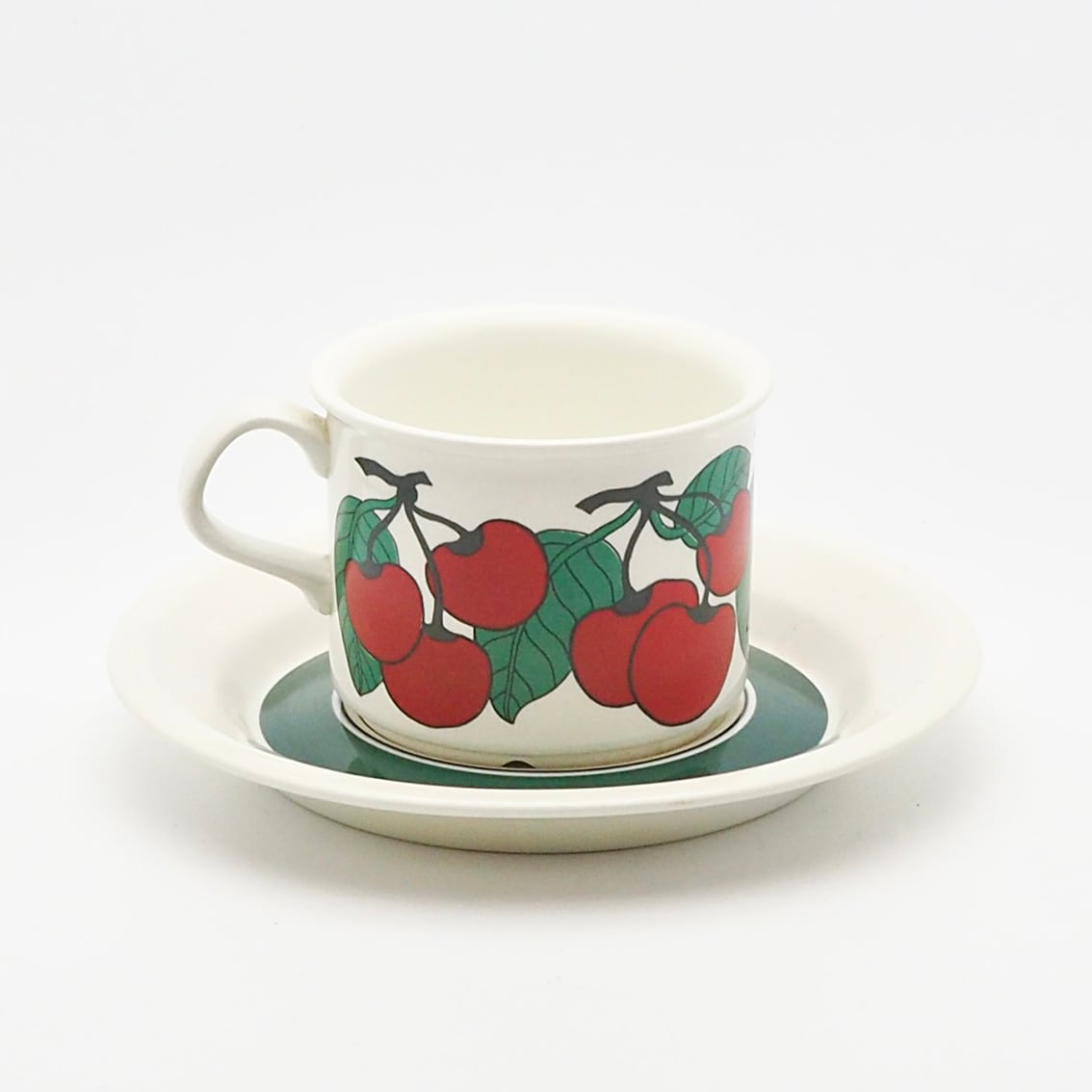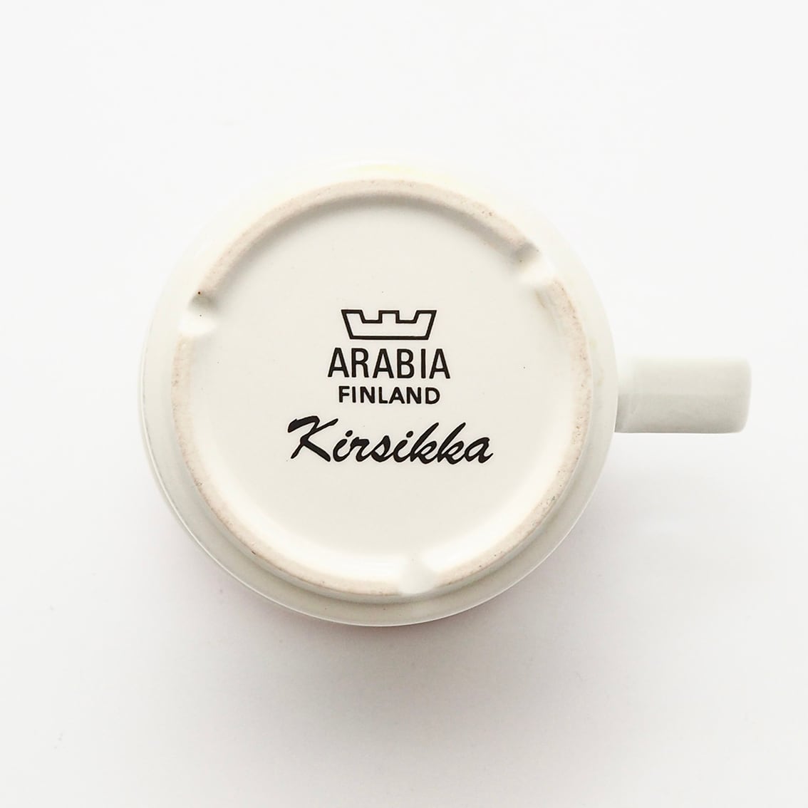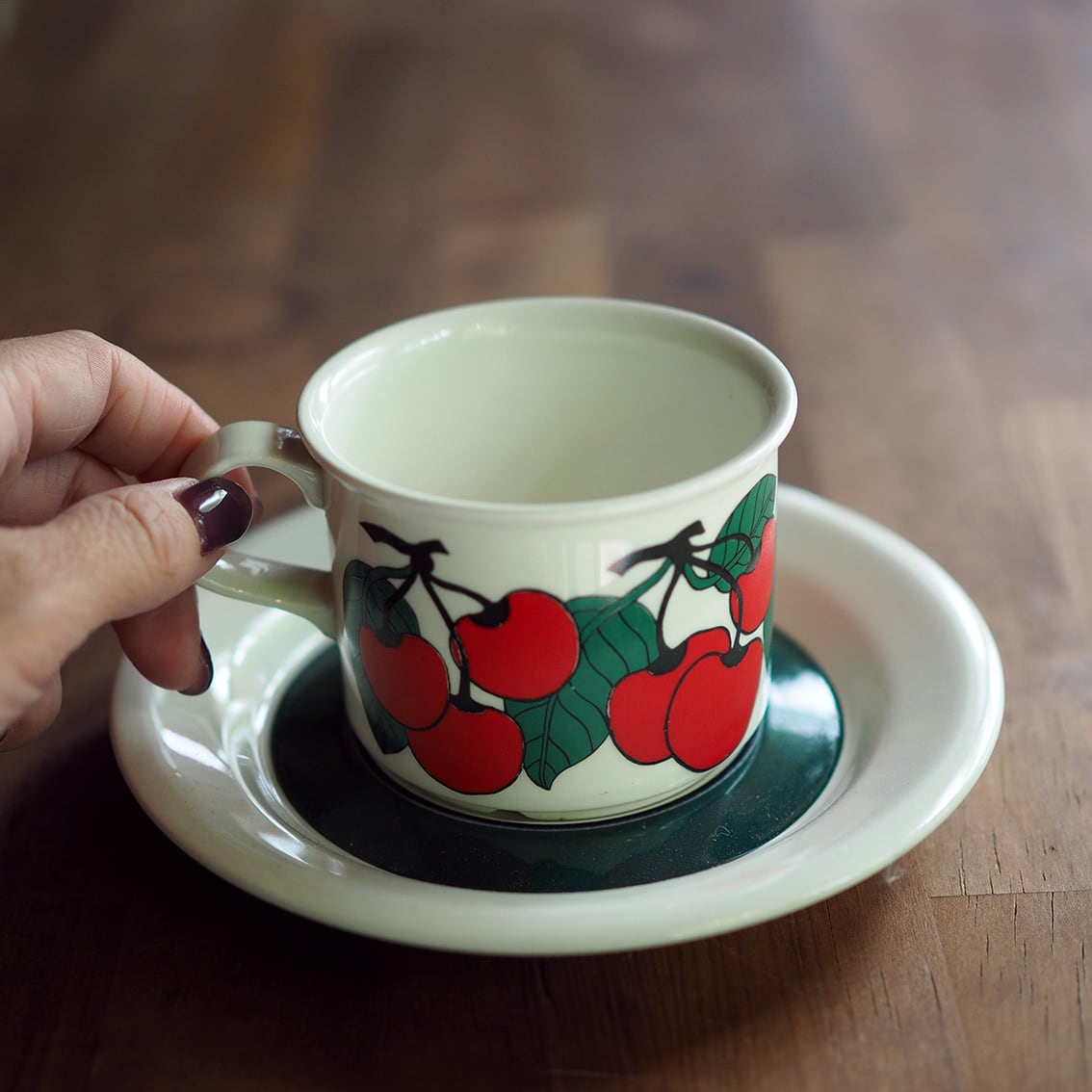 フィンランド語で「さくらんぼ」を意味する「キルシッカ」。その名のとおり、鮮やかな赤いさくらんぼと緑の葉がリズミカルに描かれたシリーズです。ソーサーには緑の太いラインと黒い細いラインがぐるりと描かれ、かわいらしい雰囲気を引き締めています。ミルク色の地に補色の赤と緑がくっきりと浮かび上がるレトロで楽しいデザインは、食卓をちょっと特別な時間にしてくれそうです。とても人気があるシリーズですが製造年数が短く、とくに絵柄がきれいに残っているものは入手困難になっています。
