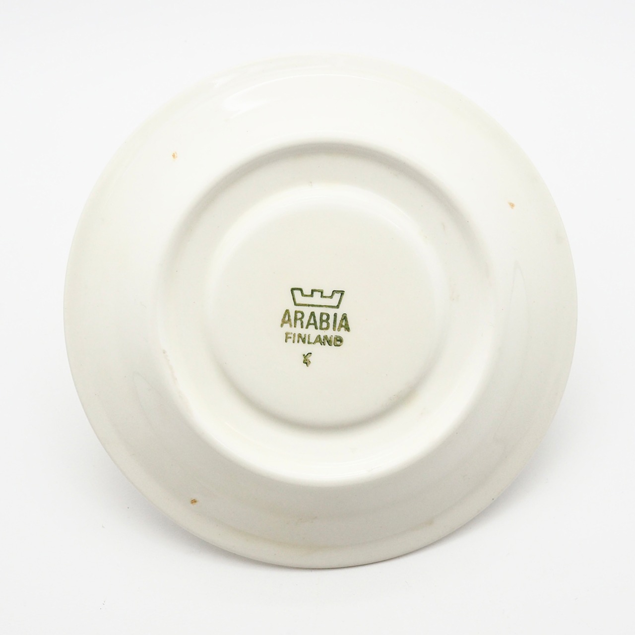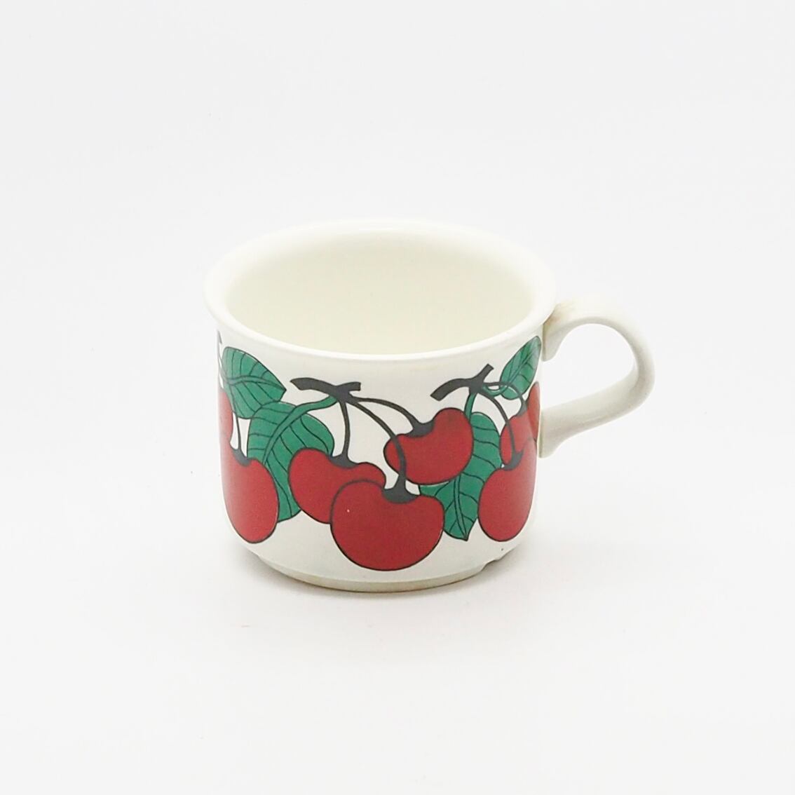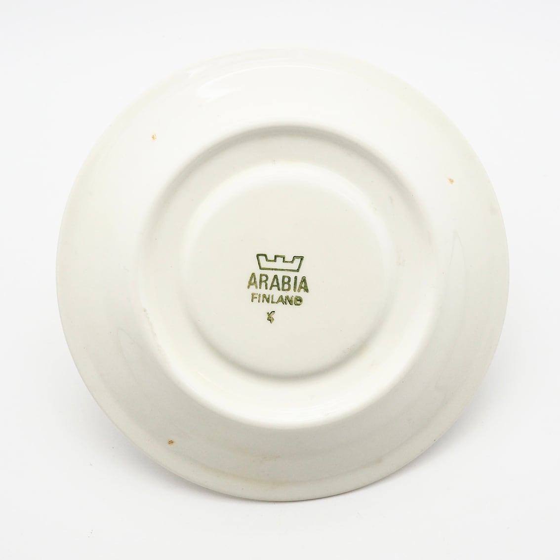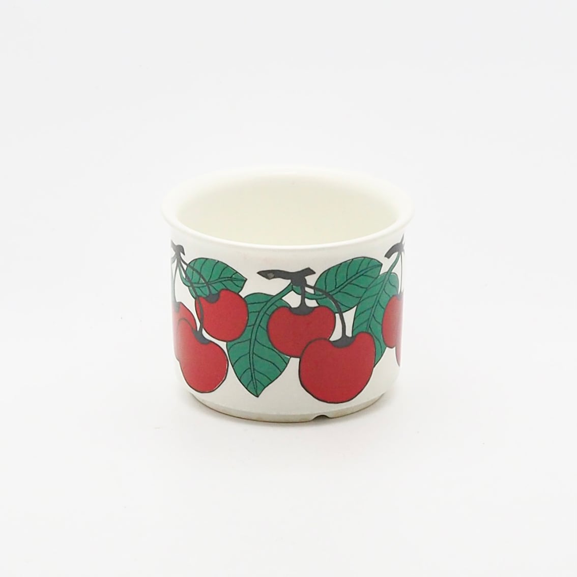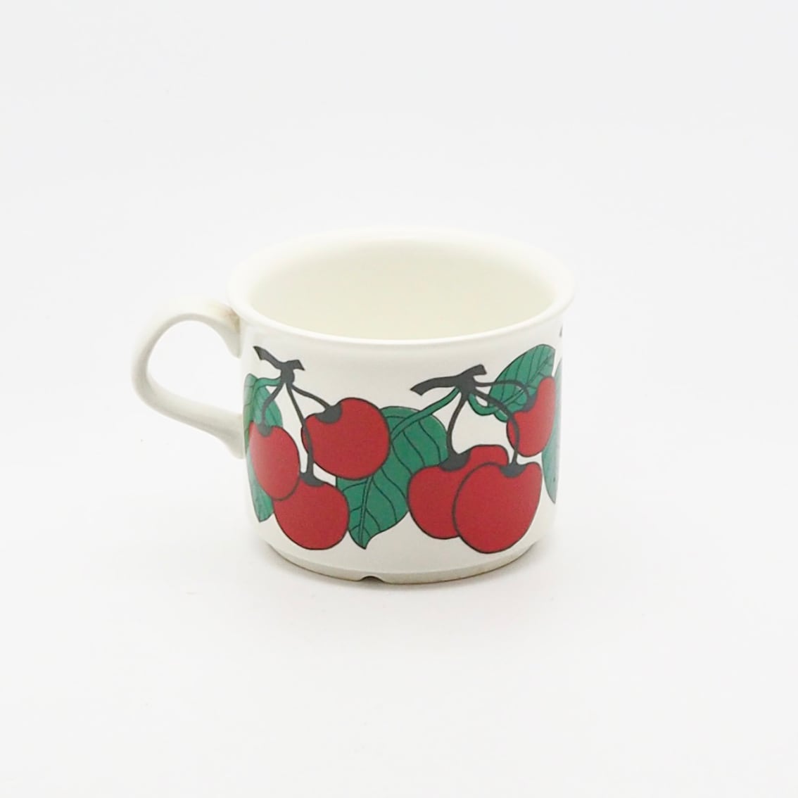 フィンランド語で「さくらんぼ」を意味する「キルシッカ」。その名のとおり、鮮やかな赤いさくらんぼと緑の葉がリズミカルに描かれたシリーズです。ソーサーには緑の太いラインと黒い細いラインがぐるりと描かれ、かわいらしい雰囲気を引き締めています。ミルク色の地に補色の赤と緑がくっきりと浮かび上がるレトロで楽しいデザインは、食卓をちょっと特別な時間にしてくれそうです。とても人気があるシリーズですが製造年数が短く、とくに絵柄がきれいに残っているものは入手困難になっています。