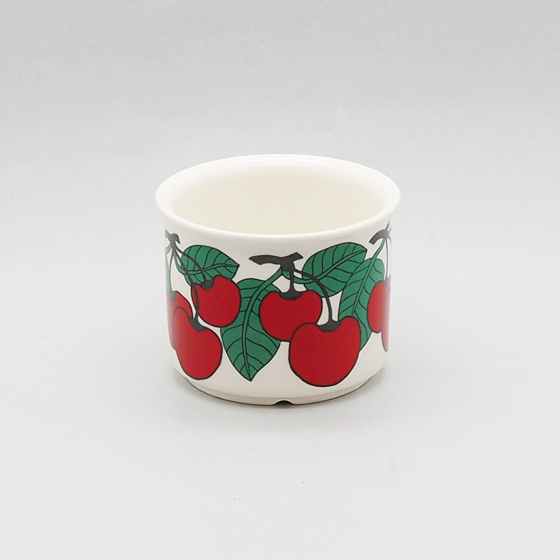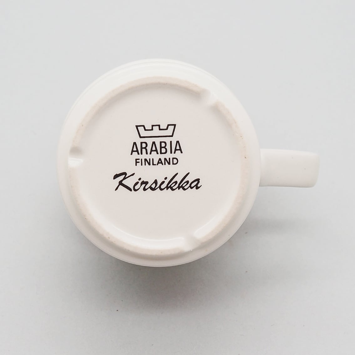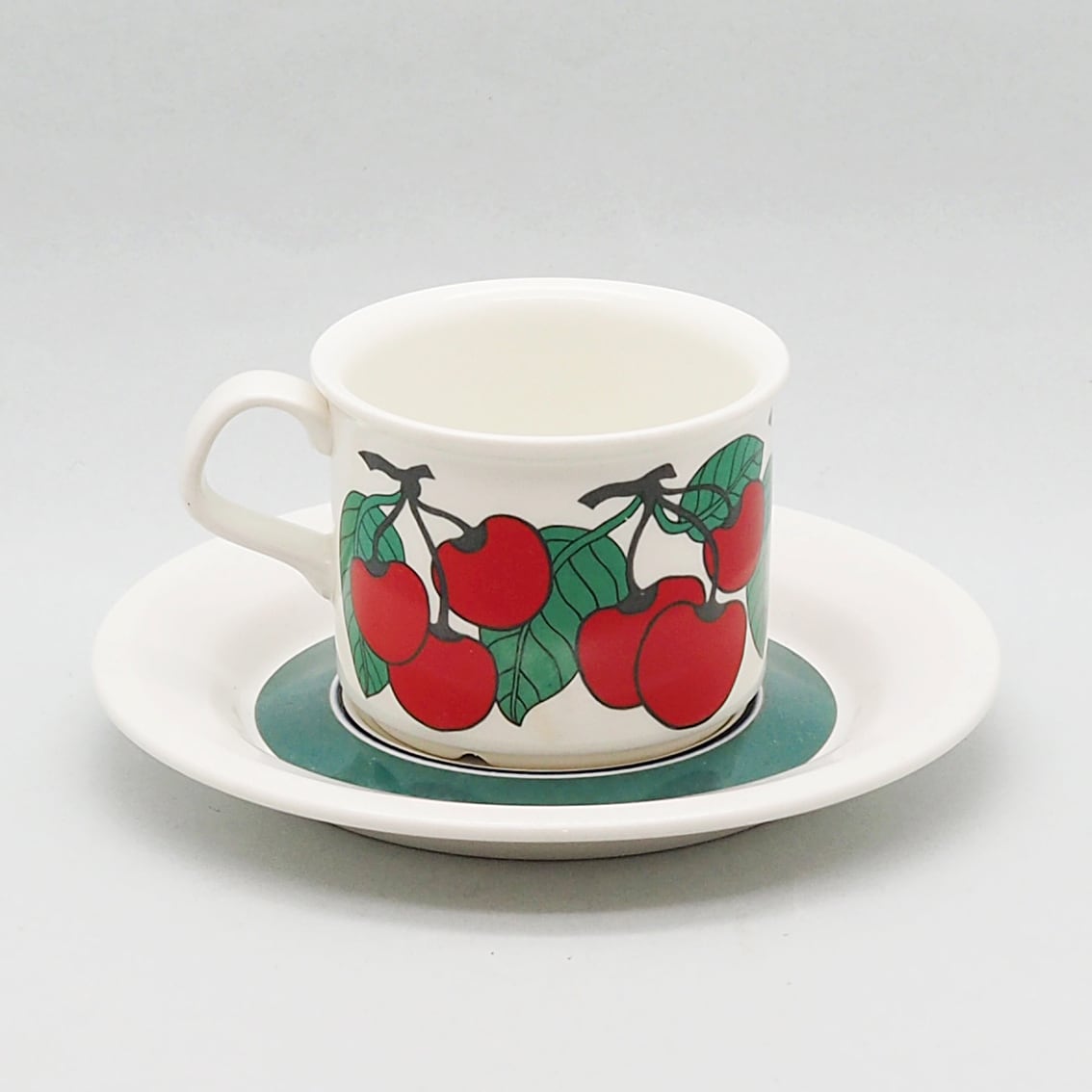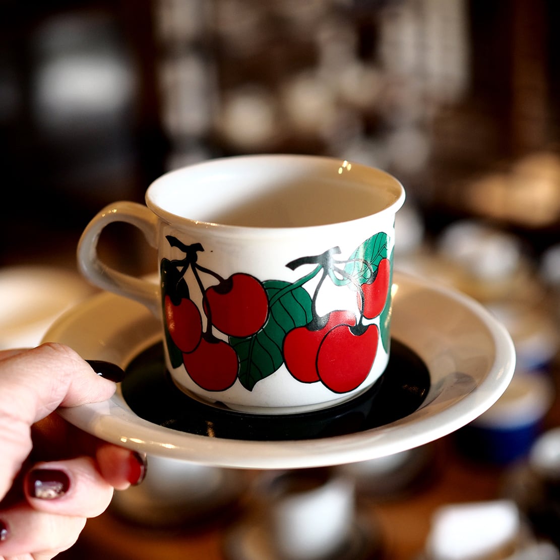 フィンランド語で「さくらんぼ」を意味する「キルシッカ」。その名のとおり、鮮やかな赤いさくらんぼと緑の葉がリズミカルに描かれたシリーズです。ソーサーには緑の太いラインと黒い細いラインがぐるりと描かれ、かわいらしい雰囲気を引き締めています。ミルク色の地に補色の赤と緑がくっきりと浮かび上がるレトロで楽しいデザインは、食卓をちょっと特別な時間にしてくれそうです。とても人気があるシリーズですが製造年数が短く、とくに絵柄がきれいに残っているものは入手困難になっています。