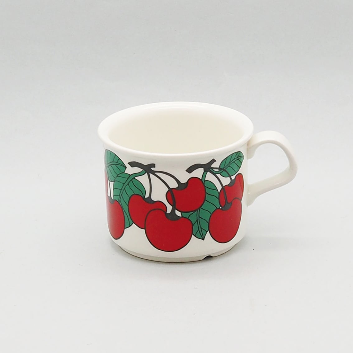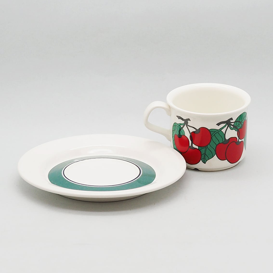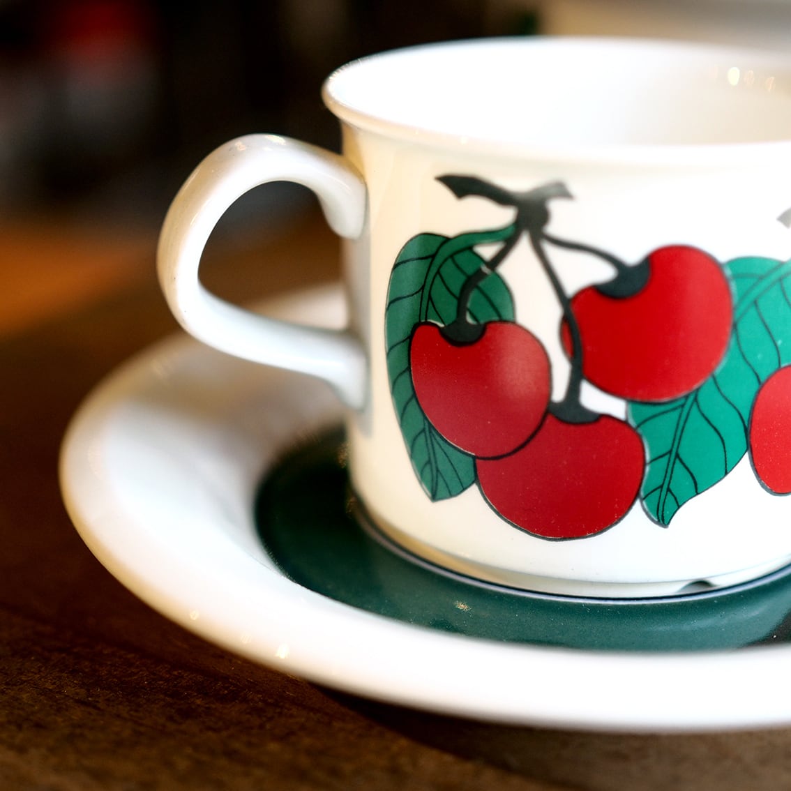 フィンランド語で「さくらんぼ」を意味する「キルシッカ」。その名のとおり、鮮やかな赤いさくらんぼと緑の葉がリズミカルに描かれたシリーズです。ソーサーには緑の太いラインと黒い細いラインがぐるりと描かれ、かわいらしい雰囲気を引き締めています。ミルク色の地に補色の赤と緑がくっきりと浮かび上がるレトロで楽しいデザインは、食卓をちょっと特別な時間にしてくれそうです。とても人気があるシリーズですが製造年数が短く、とくに絵柄がきれいに残っているものは入手困難になっています。