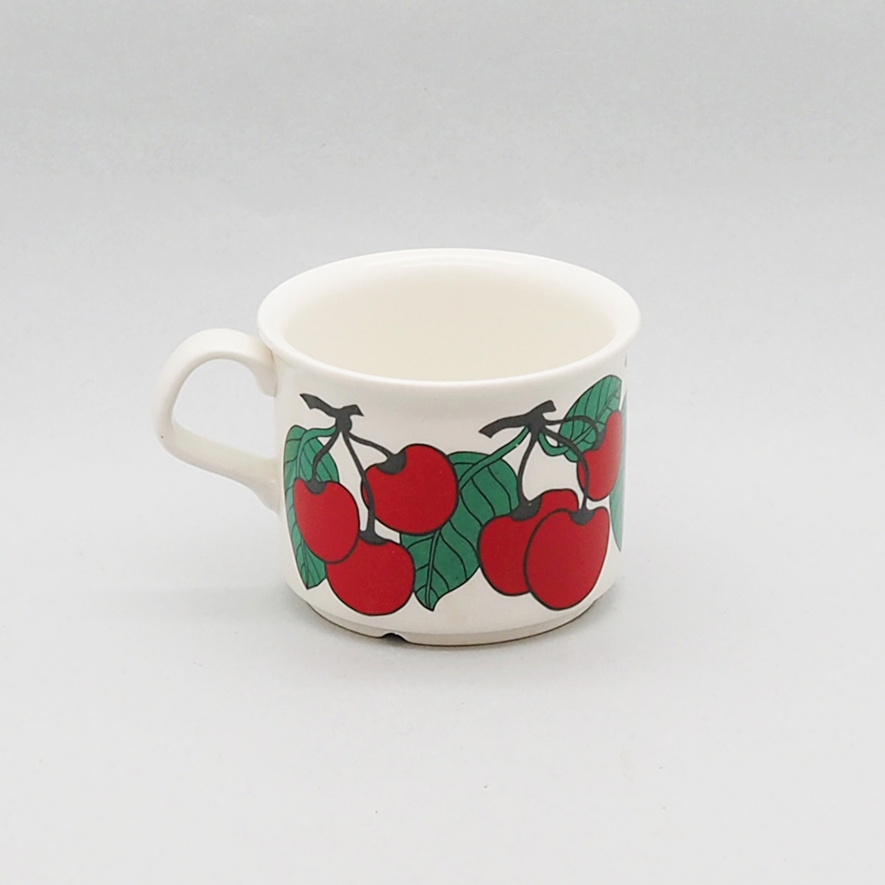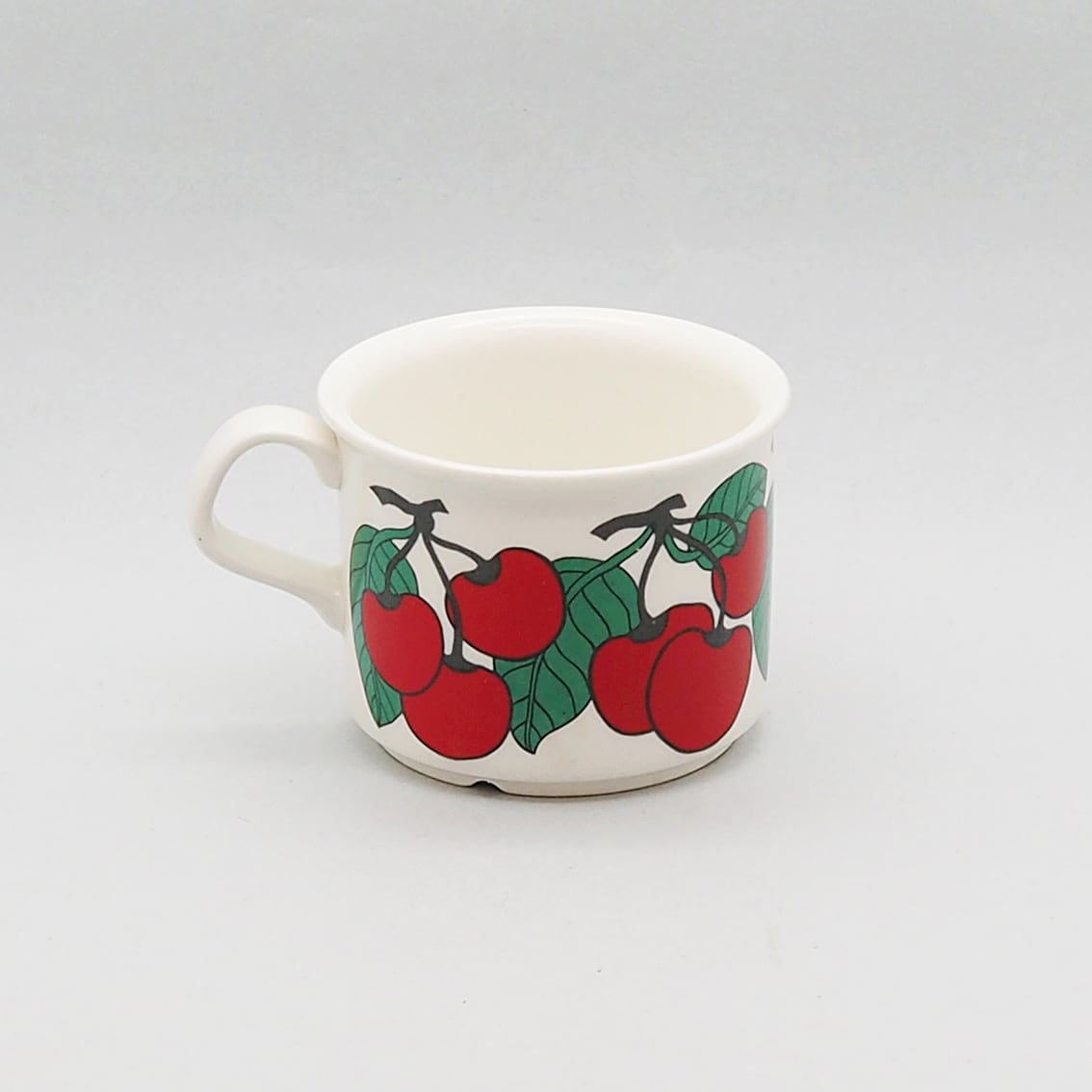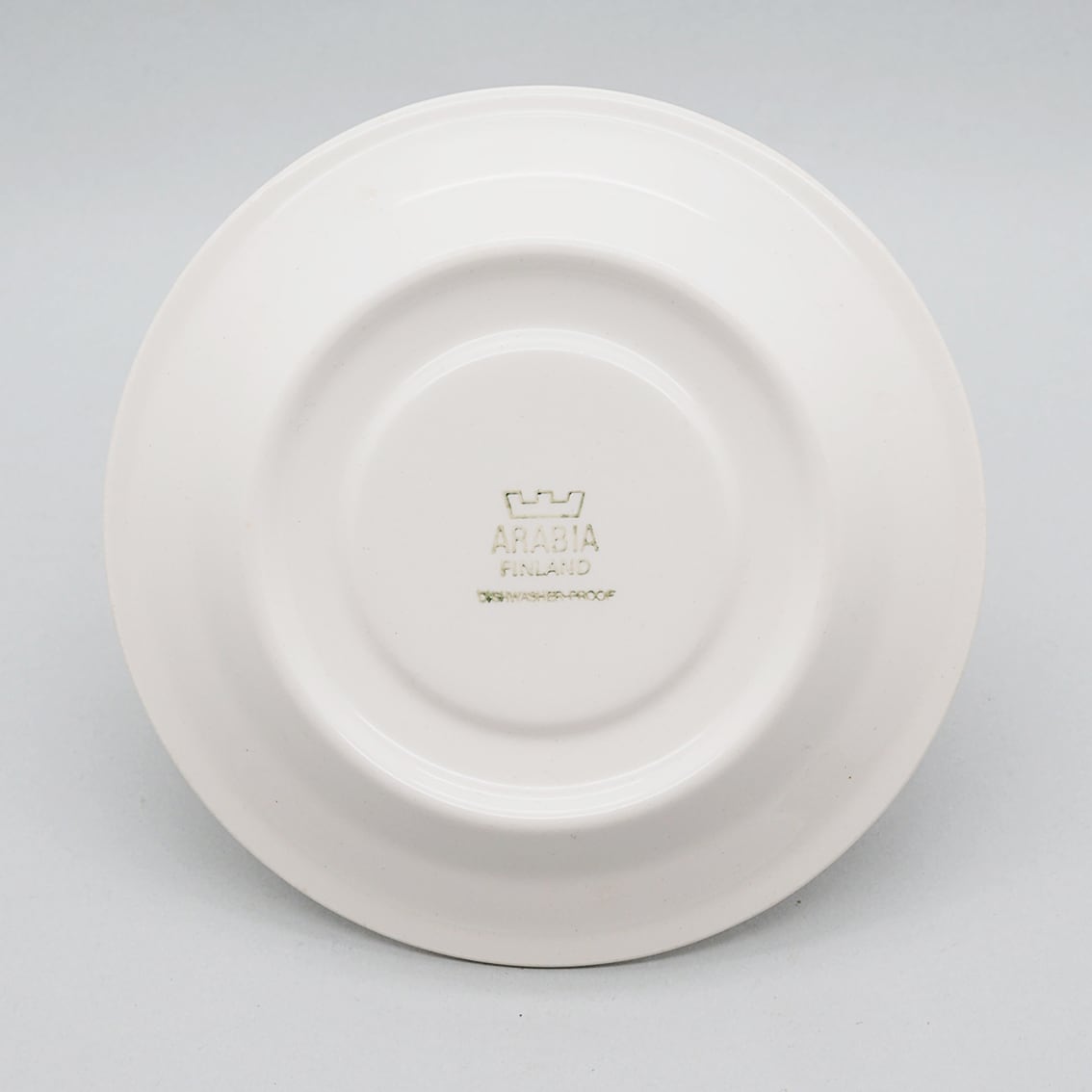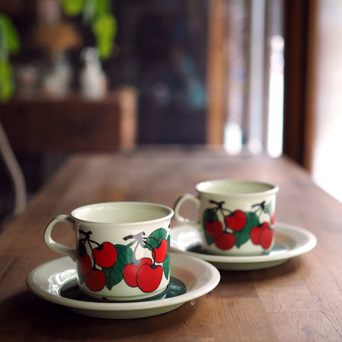 フィンランド語で「さくらんぼ」を意味する「キルシッカ」。その名のとおり、鮮やかな赤いさくらんぼと緑の葉がリズミカルに描かれたシリーズです。ソーサーには緑の太いラインと黒い細いラインがぐるりと描かれ、かわいらしい雰囲気を引き締めています。ミルク色の地に補色の赤と緑がくっきりと浮かび上がるレトロで楽しいデザインは、食卓をちょっと特別な時間にしてくれそうです。とても人気があるシリーズですが製造年数が短く、とくに絵柄がきれいに残っているものは入手困難になっています。
