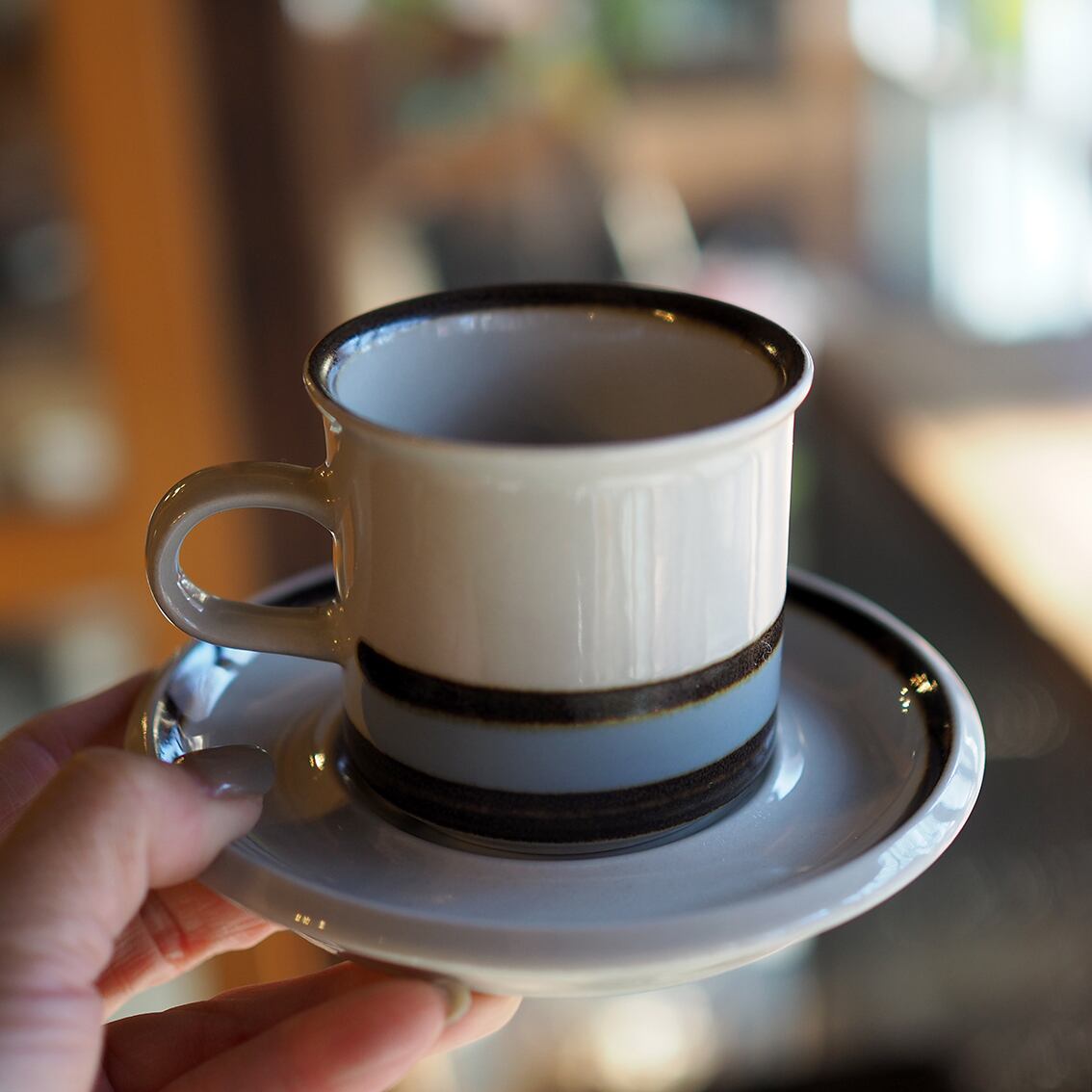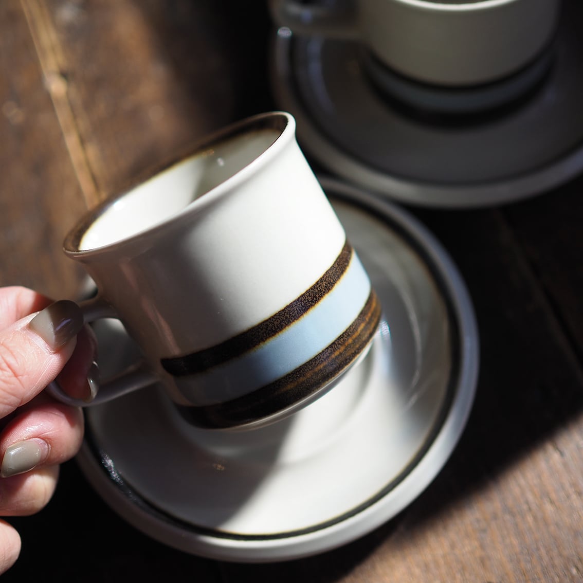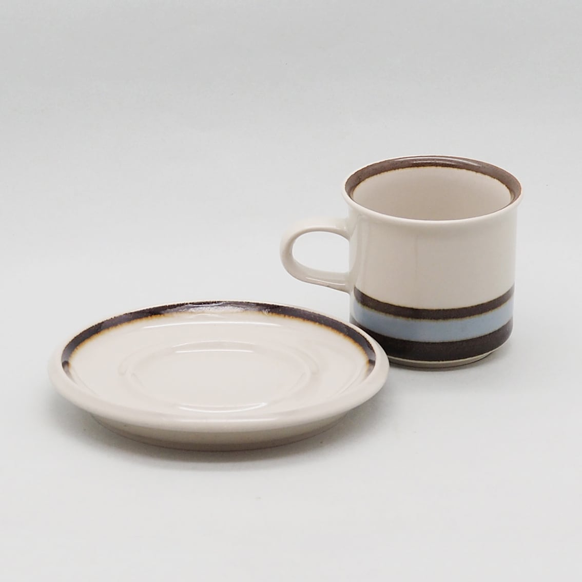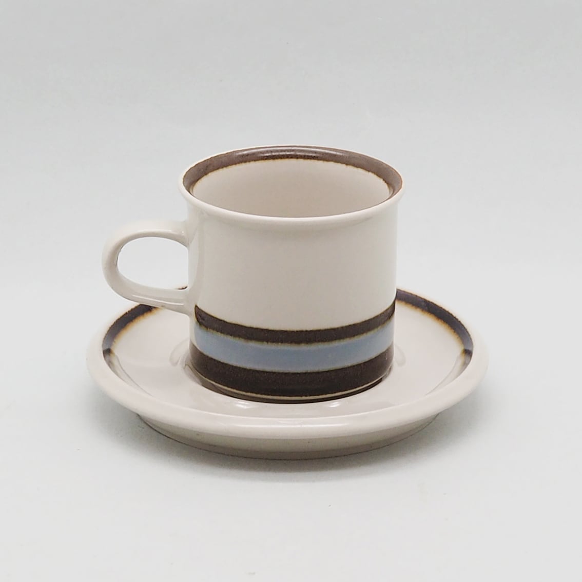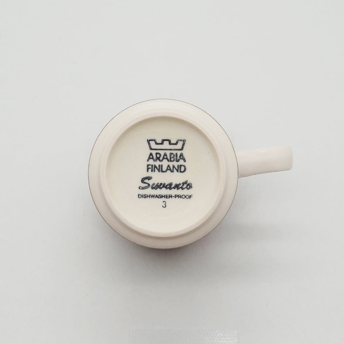 ARABIAを代表する名デザイナー、Ulla Procope(ウラ・プロコッペ)が生んだSモデルに、Raija Uosikkinen(ライヤ・ウオシッキネン)がデコレートデザインを手がけたSuvanto(スヴァント)シリーズ。フィンランド語で「静かな水の流れ」という意味を持つ名前のとおり、なんともいえない澄んだ水色と、岸や木々を思わせる深いブラウンのボーダーが美しく、ラインの境目のにじみ具合、手描きならではのかすれなど、絶妙な味わいがあります。シンプルであわせやすく、毎日使える飽きの来ないアイテムです。