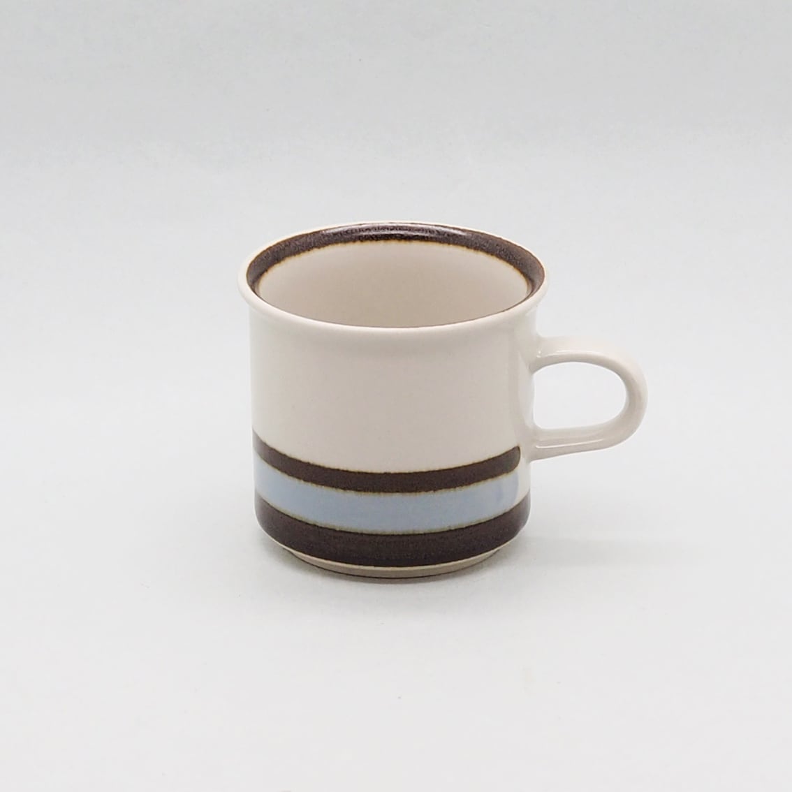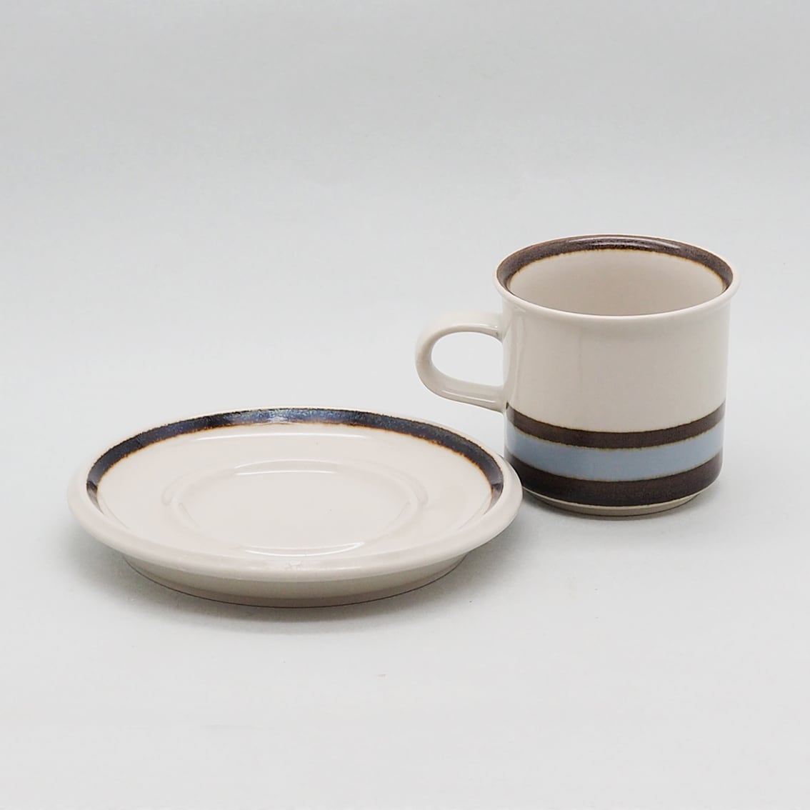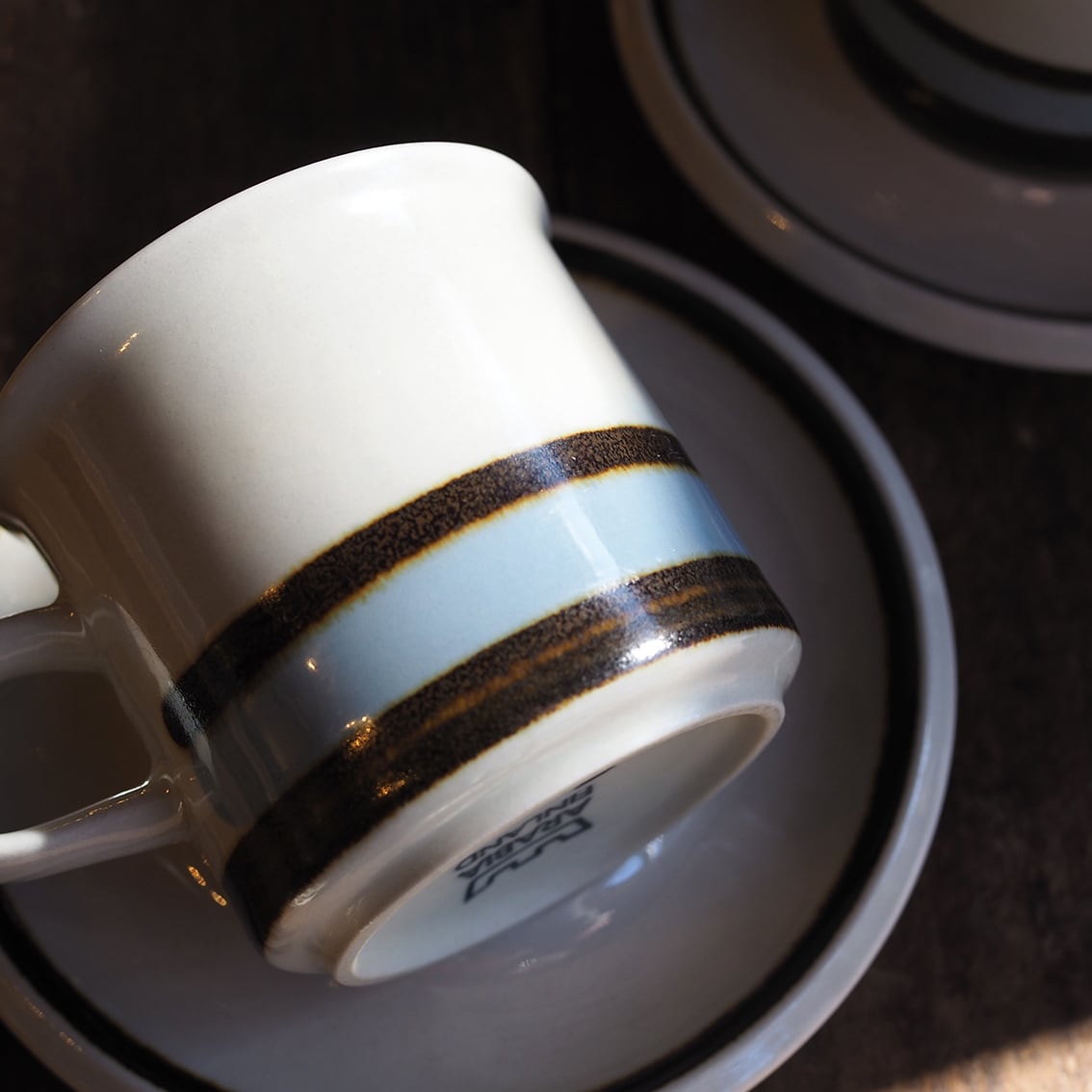 ARABIAを代表する名デザイナー、Ulla Procope(ウラ・プロコッペ)が生んだSモデルに、Raija Uosikkinen(ライヤ・ウオシッキネン)がデコレートデザインを手がけたSuvanto(スヴァント)シリーズ。フィンランド語で「静かな水の流れ」という意味を持つ名前のとおり、なんともいえない澄んだ水色と、岸や木々を思わせる深いブラウンのボーダーが美しく、ラインの境目のにじみ具合、手描きならではのかすれなど、絶妙な味わいがあります。シンプルであわせやすく、毎日使える飽きの来ないアイテムです。