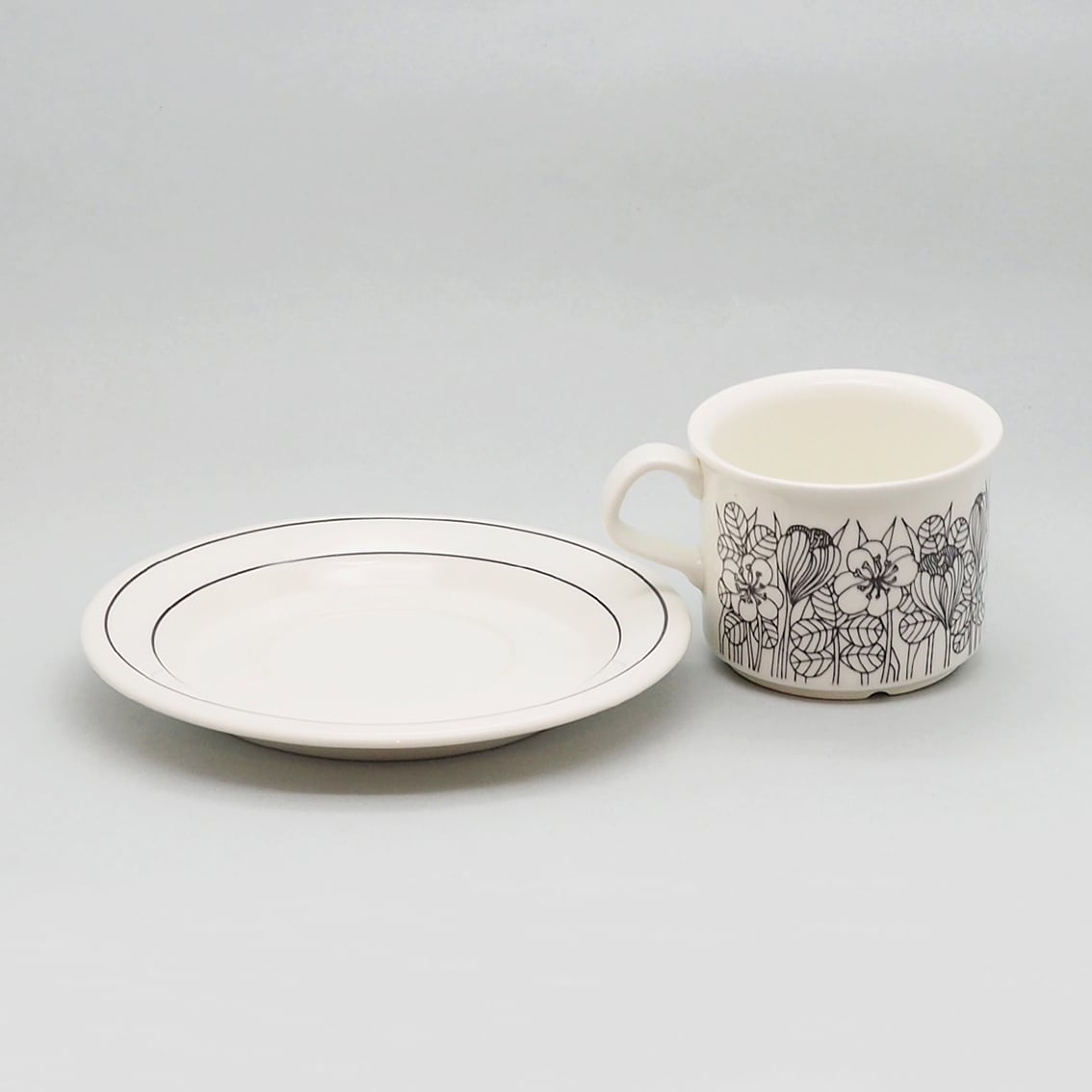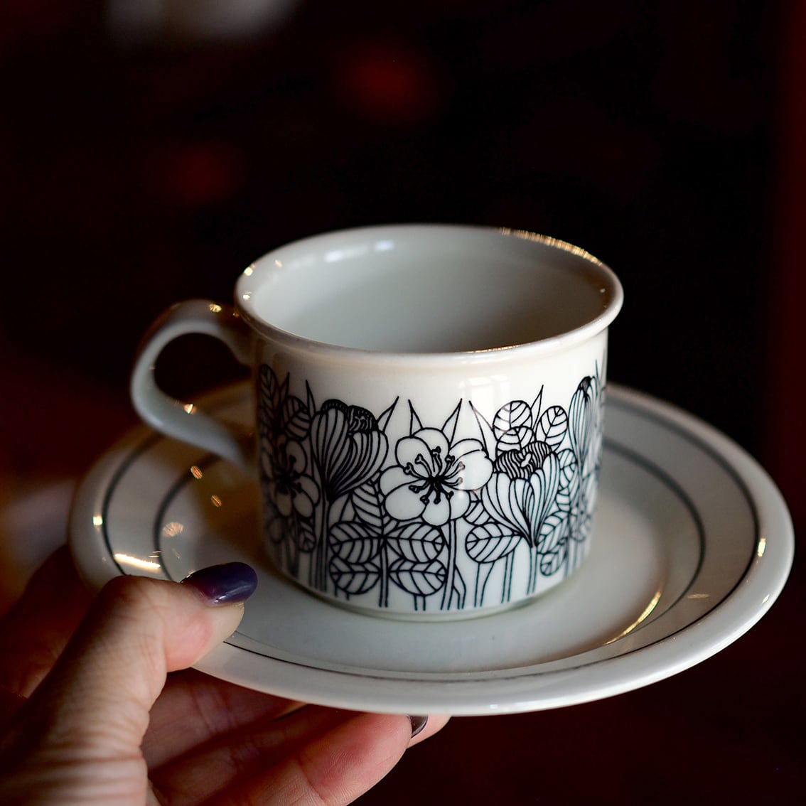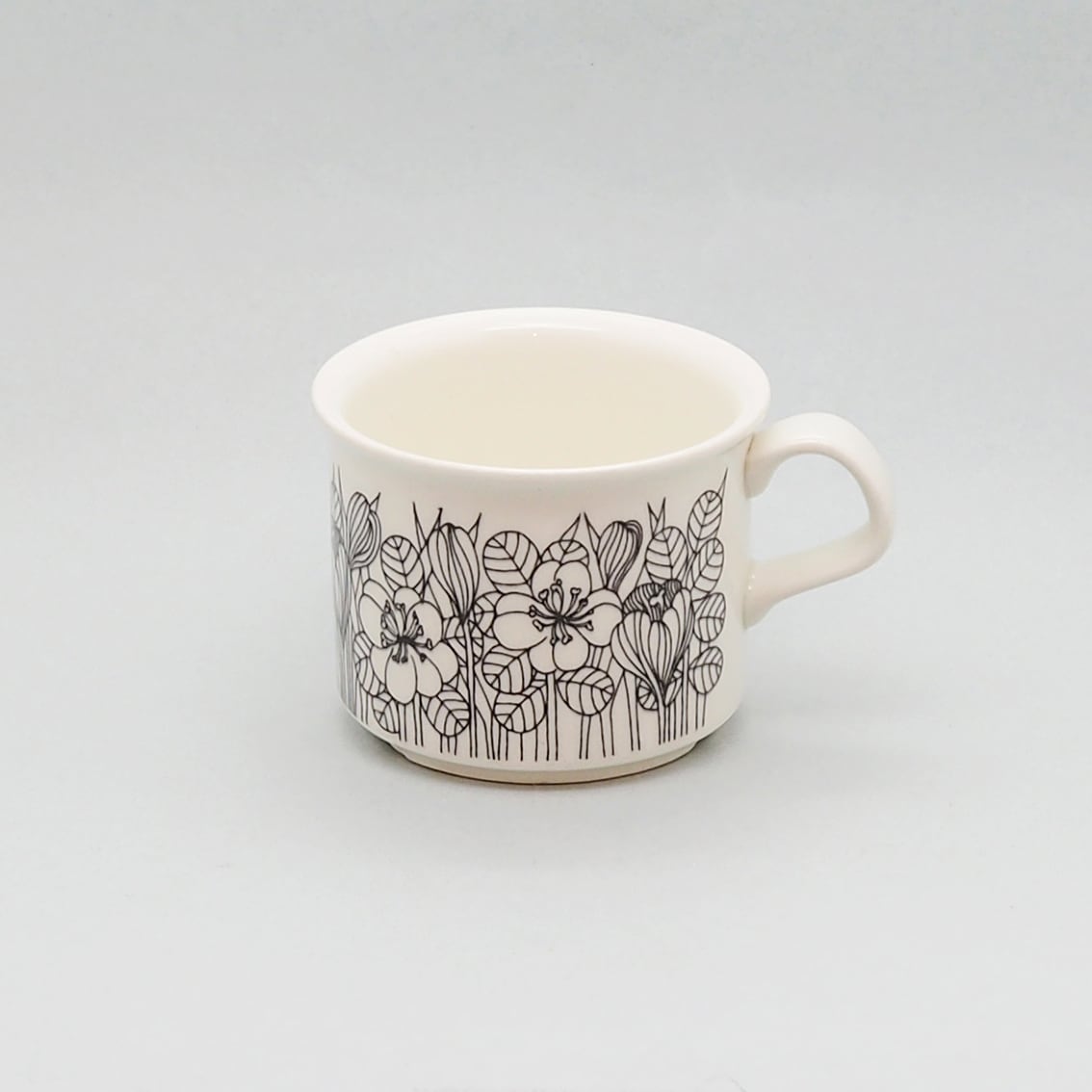 繊細かつ大胆な植物モチーフのデコレートを数多く手がけたエステリ・トムラの代表作のひとつ、「クロッカス」。北欧の春の訪れを告げるクロッカスの花が表情豊かに描かれ、長い冬を乗り越えたフィンランドの人々の喜びが伝わってくるようです。「クロッカス」は伝説ともいえる人気の高さから、現在マグやプレート類が復刻版として販売されていますが、カップ&ソーサーはヴィンテージのオリジナルだけ。こちらはシックな白黒版のコーヒーサイズで、1978年から2年間のみ製造された作品です。