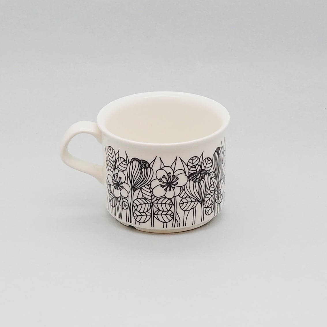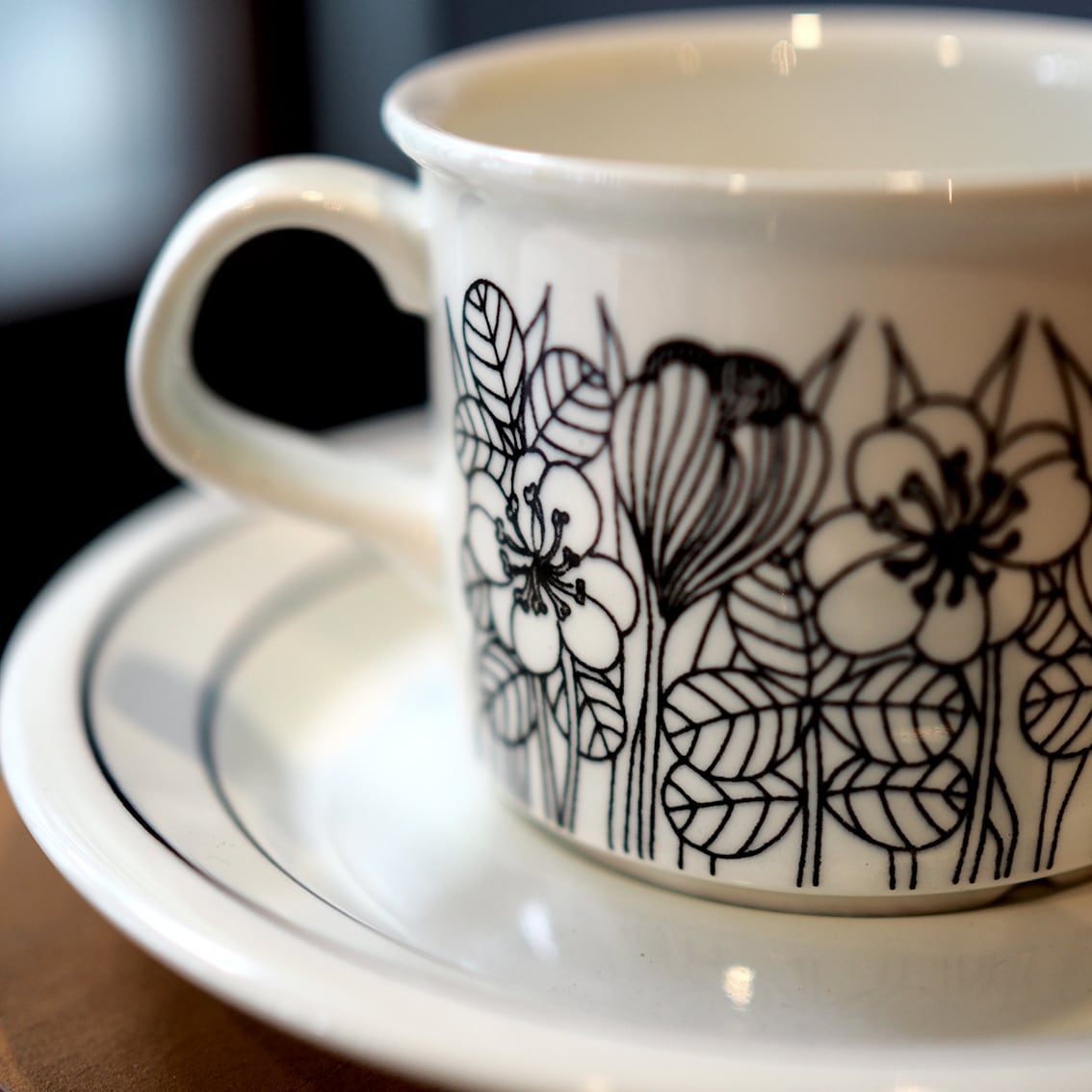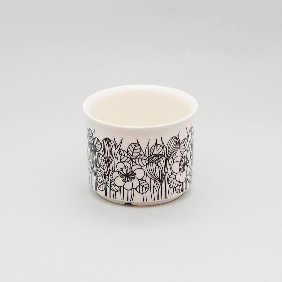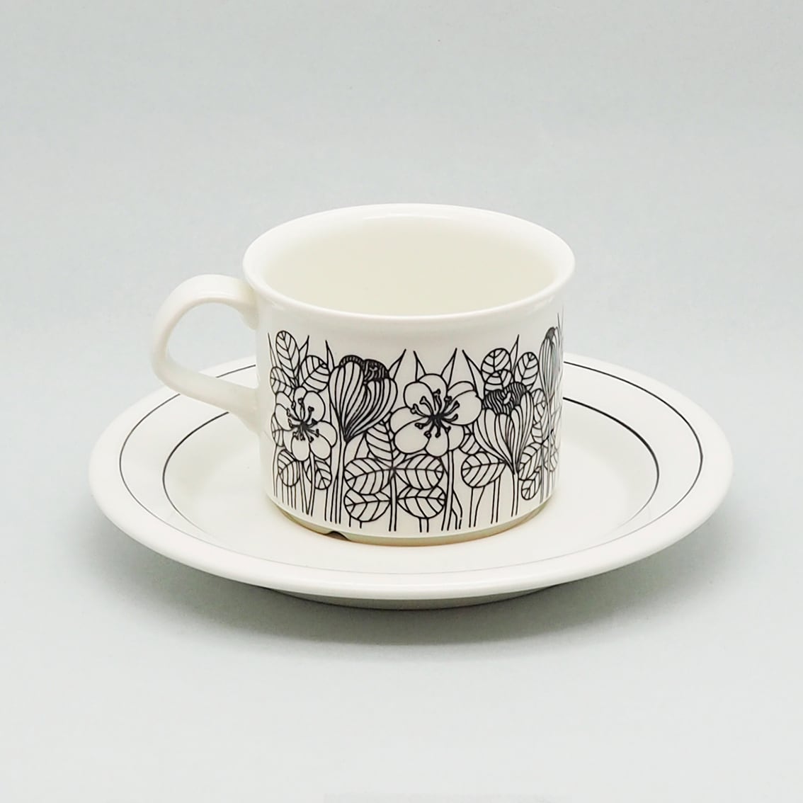 繊細かつ大胆な植物モチーフのデコレートを数多く手がけたエステリ・トムラの代表作のひとつ、「クロッカス」。北欧の春の訪れを告げるクロッカスの花が表情豊かに描かれ、長い冬を乗り越えたフィンランドの人々の喜びが伝わってくるようです。「クロッカス」は伝説ともいえる人気の高さから、現在マグやプレート類が復刻版として販売されていますが、カップ&ソーサーはヴィンテージのオリジナルだけ。こちらはシックな白黒版のコーヒーサイズで、1978年から2年間のみ製造された作品です。
