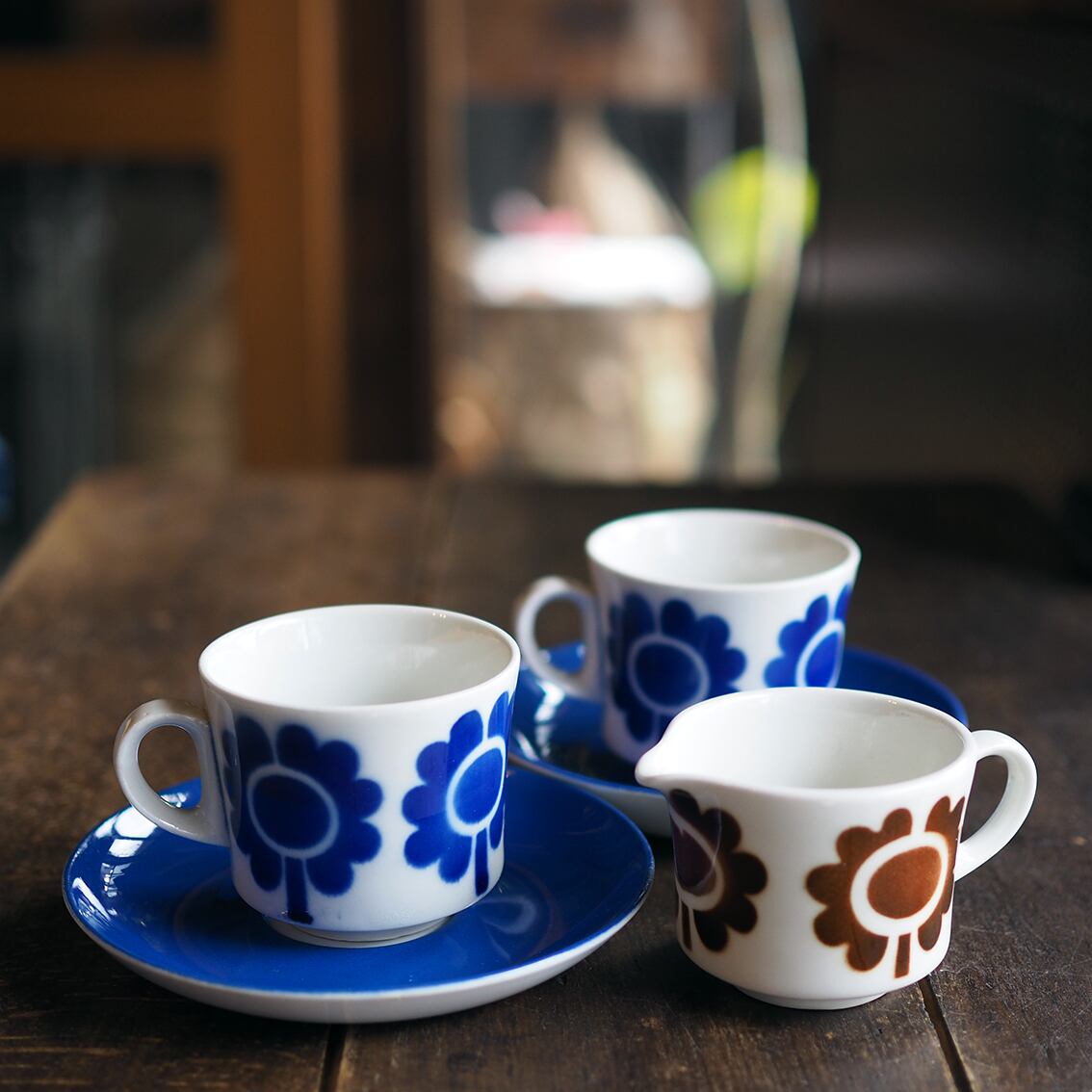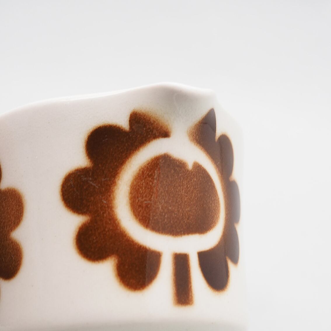 模様がくり抜かれた型をカップに装着し、スプレーで柄を吹き付ける〈ステンシル技法〉で作られたシリーズは、チャーミングな柄と、手仕事によるやわらかい表情が魅力です。さまざまなパターンや色が存在しますが、こちらはその中でも珍しくシリーズ名を持ち、いろいろなアイテムに展開された「ミランダ」。レトロモダンな花柄のかわいさと、ゴラン・バックが手がけた美しいフォルムのバランスが見事です。こちらは手のひらサイズのクリーマーで、ミルクはもちろん、ソースやドレッシングをサーブしたり、小花を挿してもすてきです。