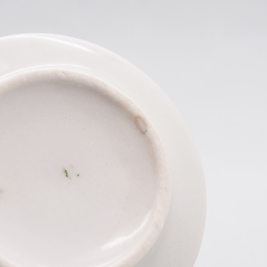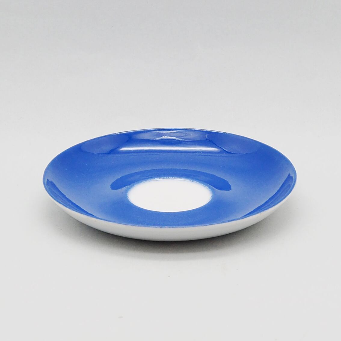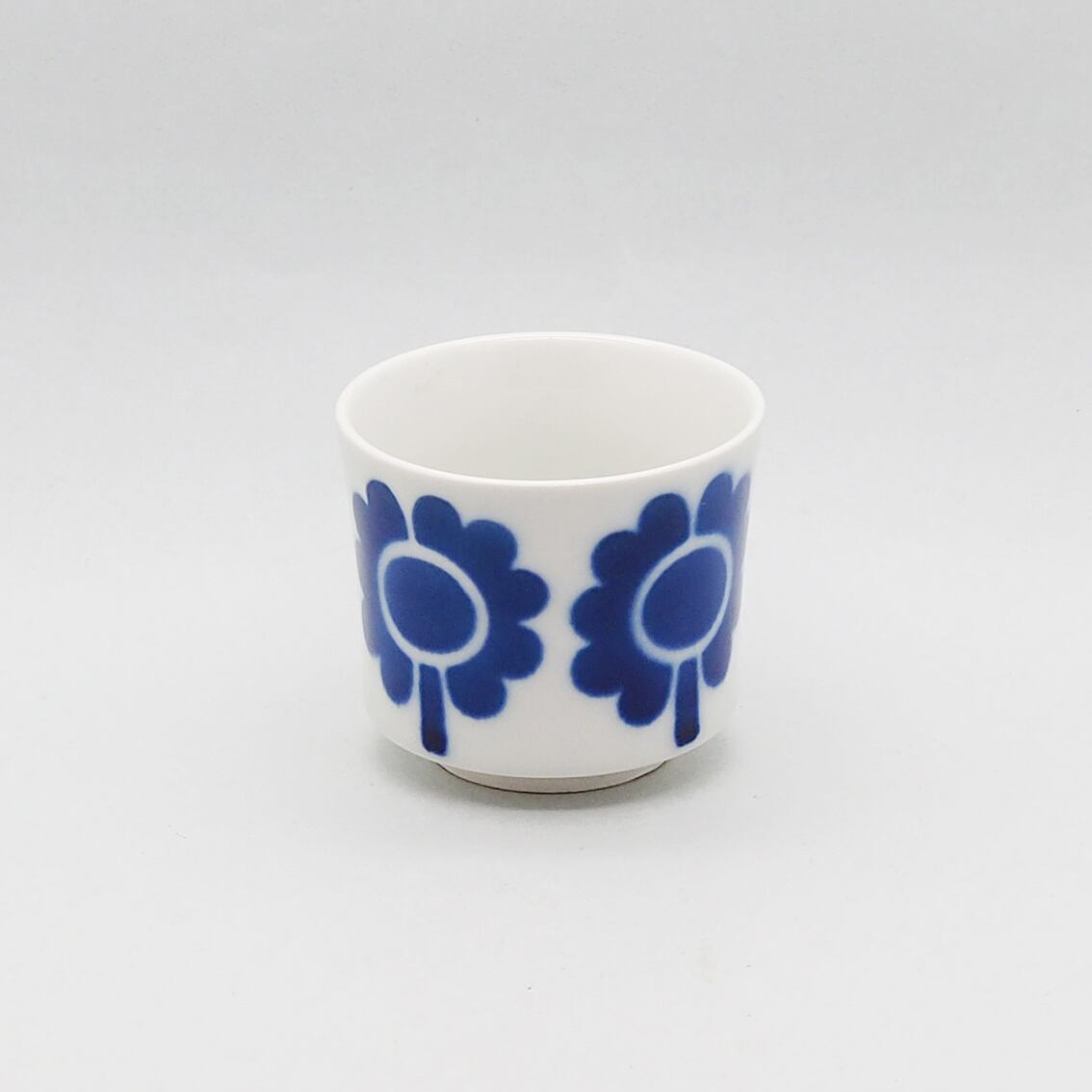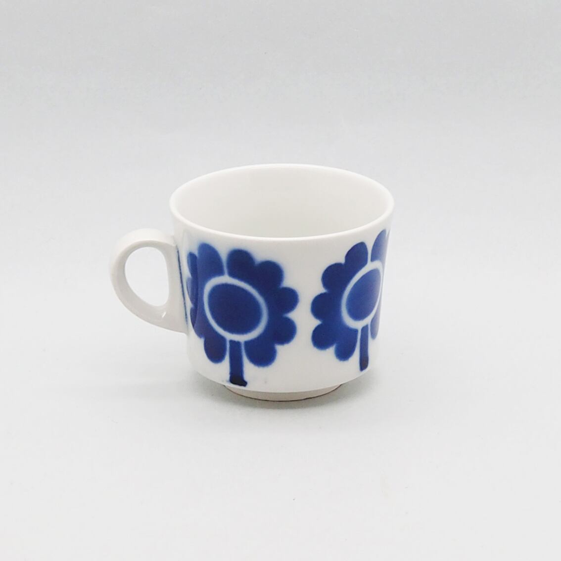 模様がくり抜かれた型をカップに装着し、スプレーで柄を吹き付ける〈ステンシル技法〉で作られたシリーズは、チャーミングな柄と、手仕事によるやわらかい表情が魅力です。さまざまなパターンや色が存在しますが、こちらはその中でも珍しくシリーズ名を持ち、いろいろなアイテムに展開された「ミランダ」。レトロモダンな花柄のかわいさと、ゴラン・バックが手がけた美しいフォルムのバランスが見事です。ソーサーの鮮やかなブルーも印象的で、70年代の洗練されたモダンが光ります。