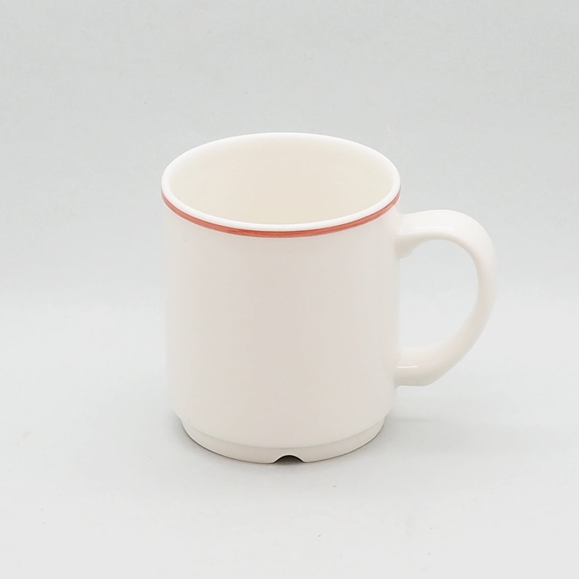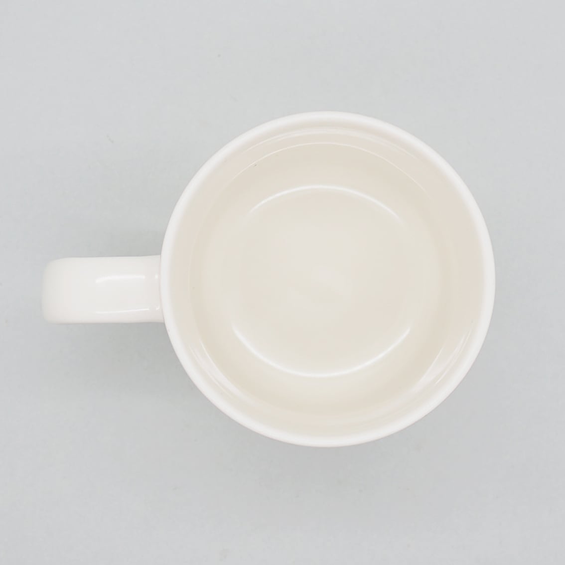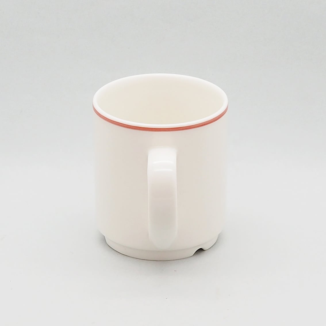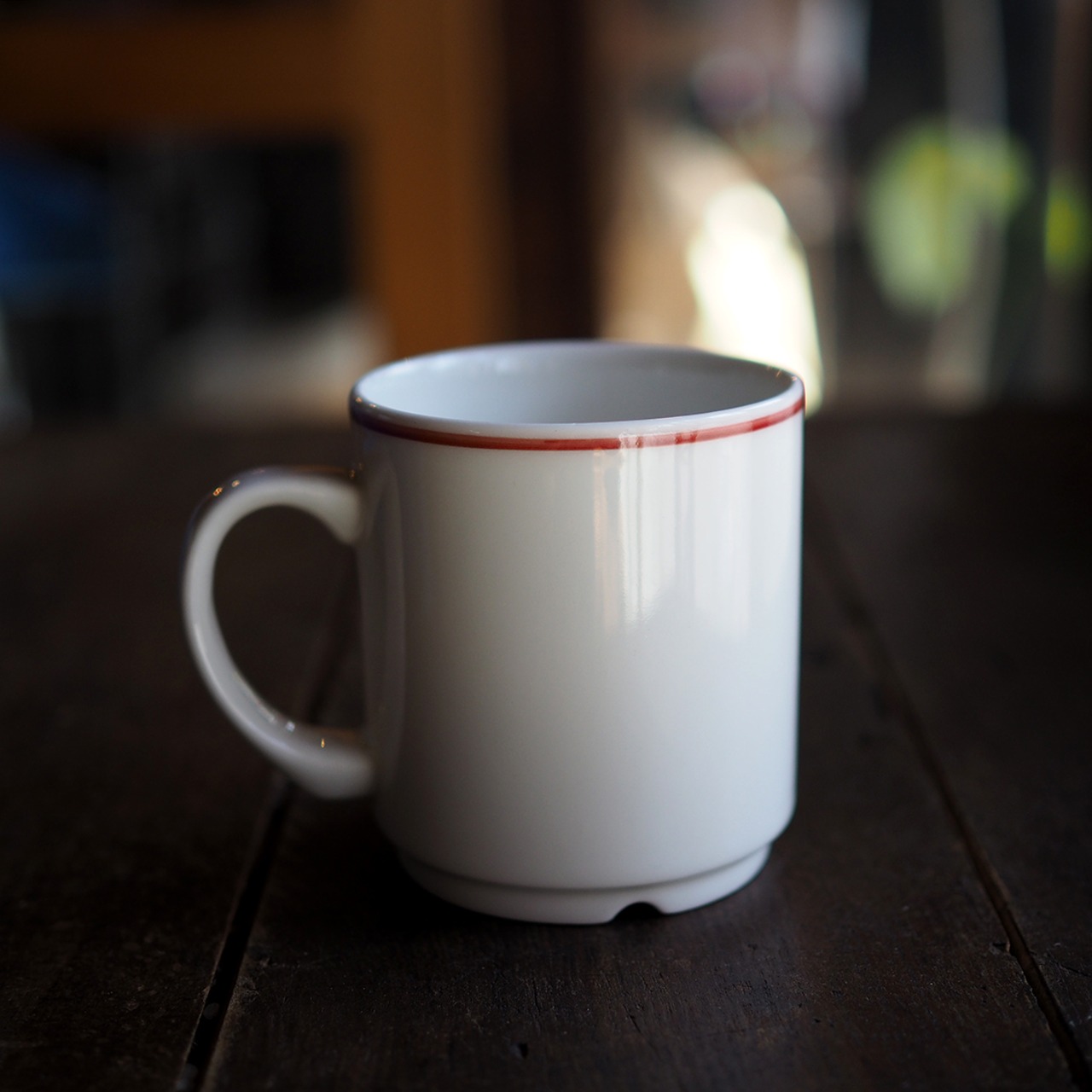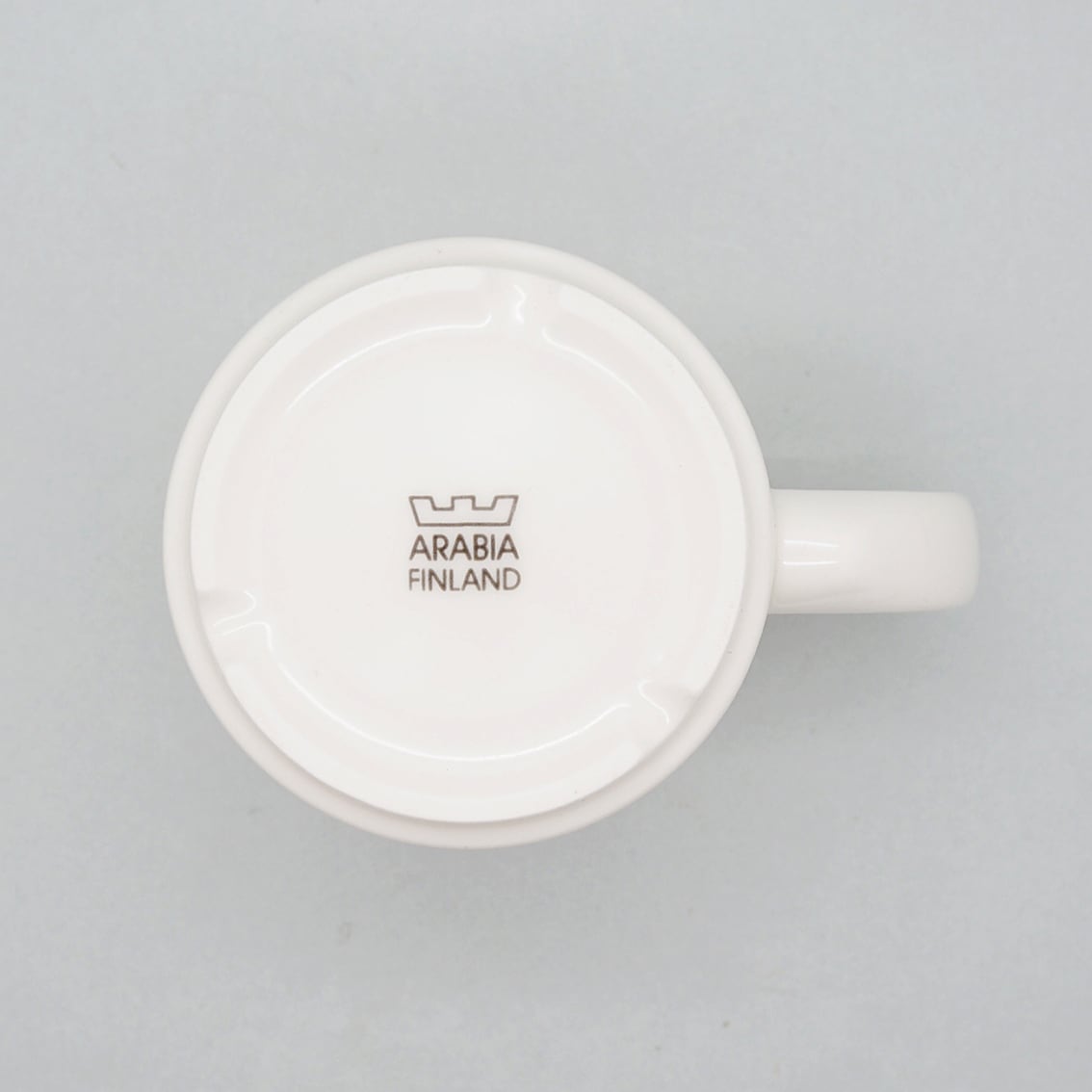 アラビア社で業務用として作られた「Forte」というフォルムをベースにしたマグです。ほとんど流通しておらず詳細は不明ですが、どこかの別注モデルとして製造されたアイテムだと思われます。プレーンな白にきりっと赤のラインが描かれているシンプルさがクールで、スタッキング可能な構造も魅力。丈夫で扱いやすく普段使いにおすすめです。