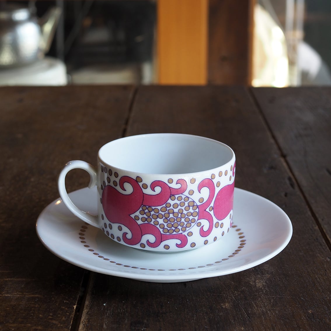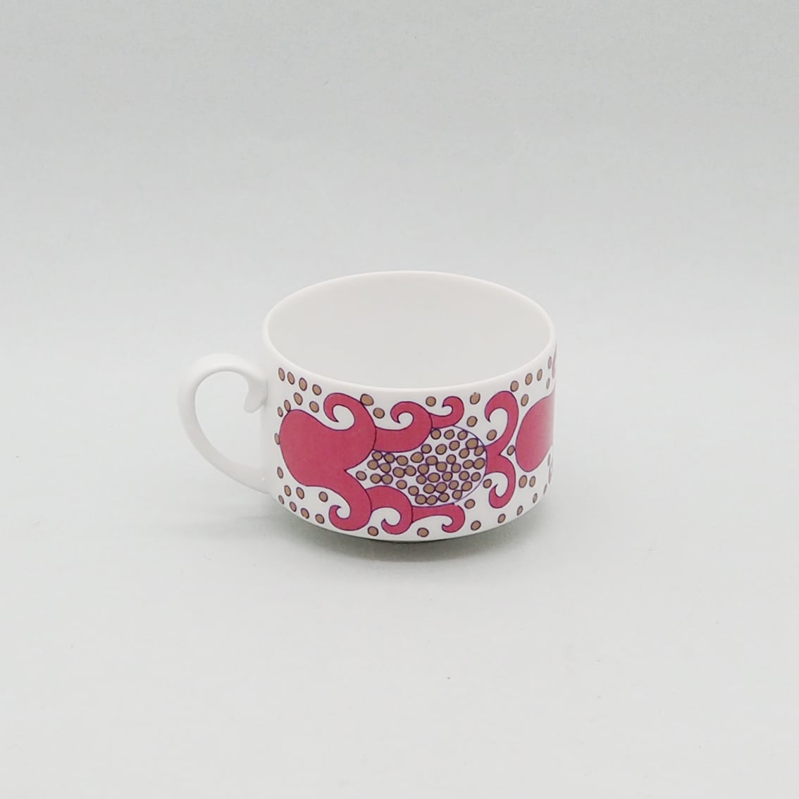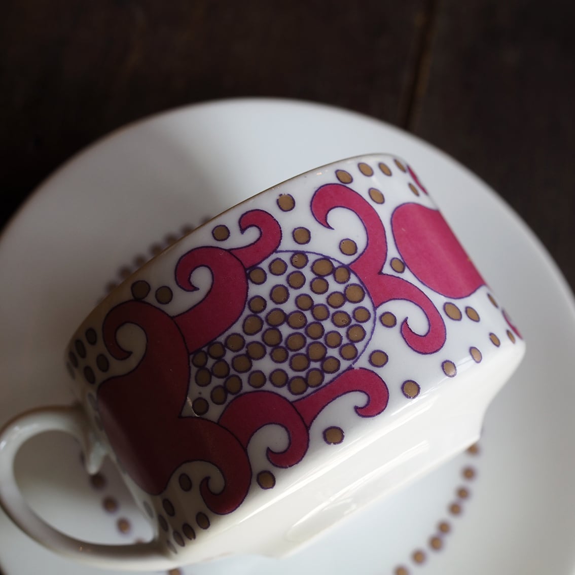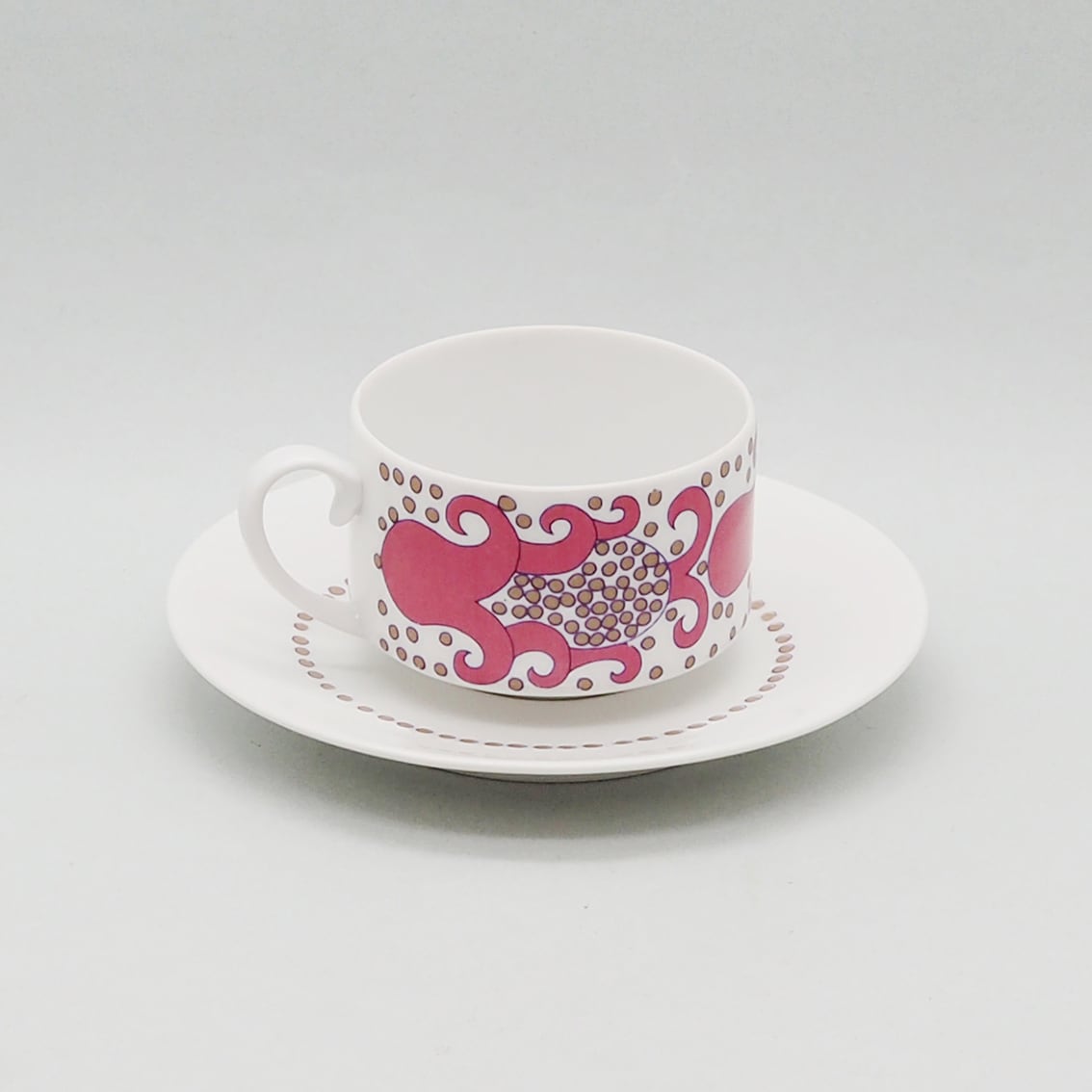 エキゾチックで不思議な柄が魅力の「Esmeralda(エスメラルダ)」の小さなカップ&ソーサーです。「Esmeralda」はスペイン語でエメラルドを意味し、宝石の輝きを散りばめたような表現なのではないでしょうか。一方、ざくろのような植物にも見え、いろいろな想像が広がる神秘的な意匠です。赤・青・緑のカラーバリエーションも存在しますが、こちらのピンクは初めて買い付けることができました。製造期間が3年と短いため、現地でも出会うのが難しくなりつつある存在です。