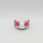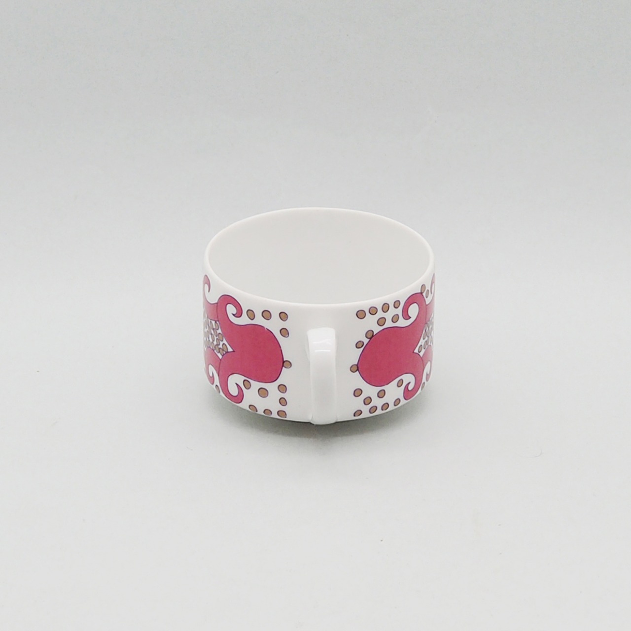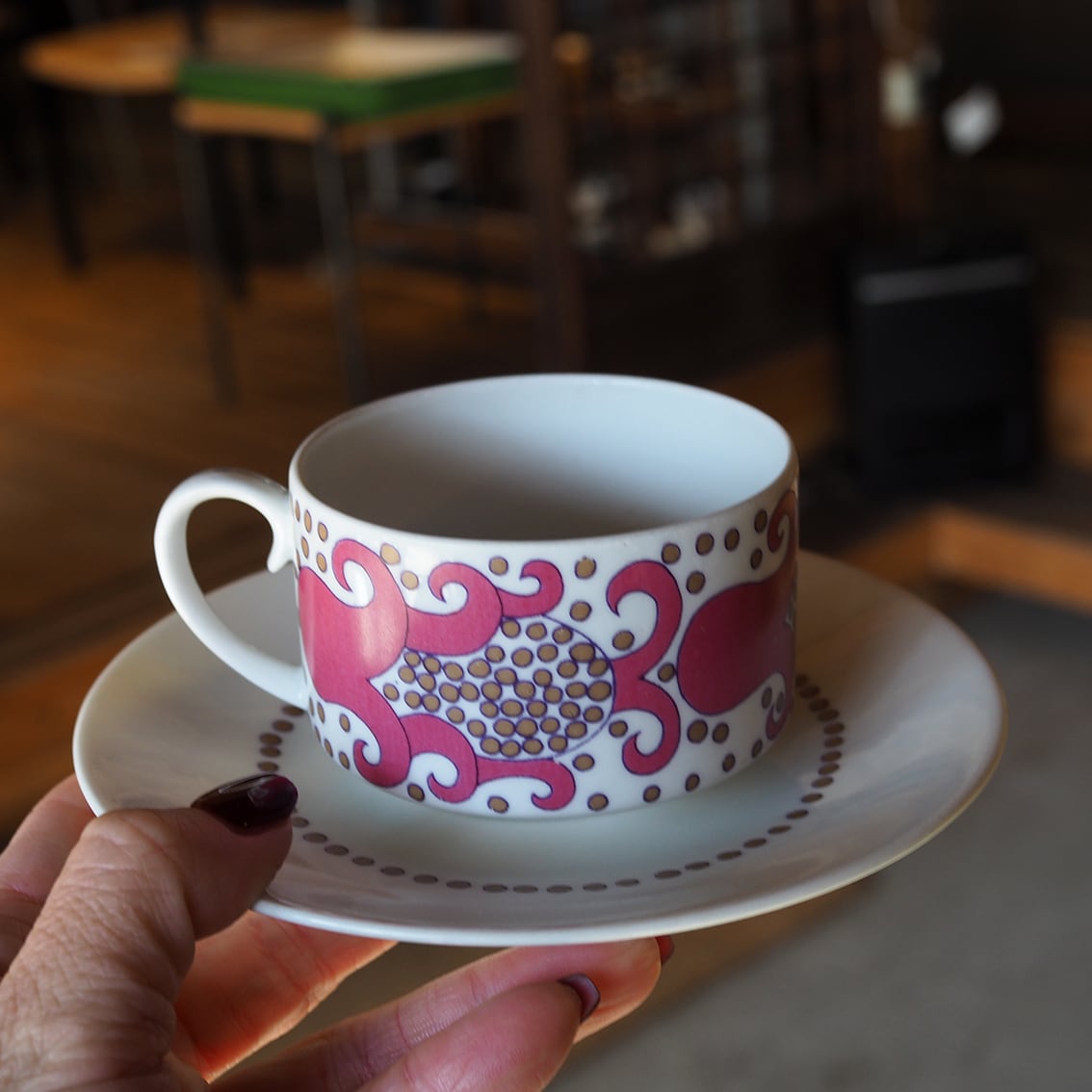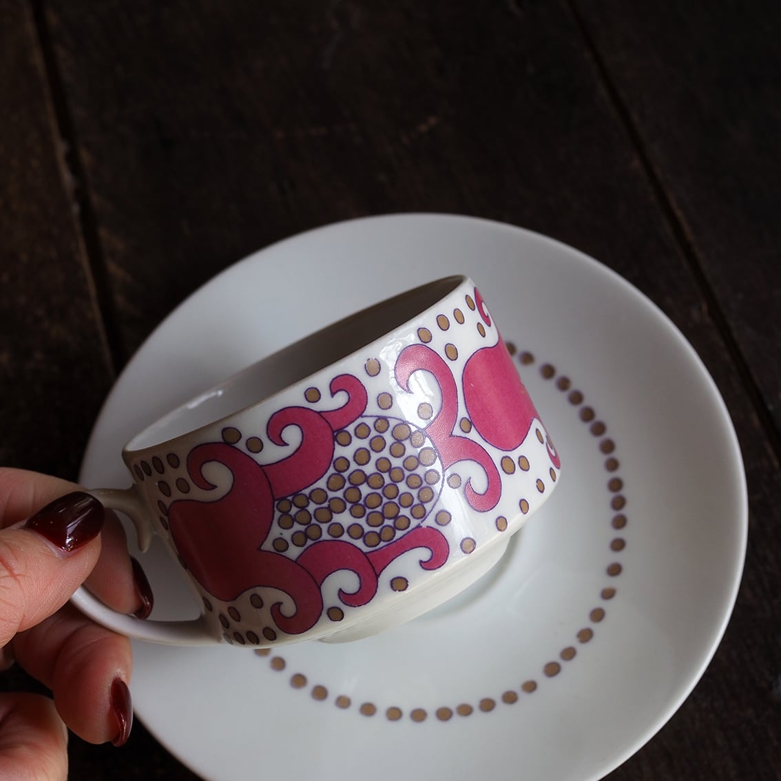 エキゾチックで不思議な柄が魅力の「Esmeralda(エスメラルダ)」の小さなカップ&ソーサーです。「Esmeralda」はスペイン語でエメラルドを意味し、宝石の輝きを散りばめたような表現なのではないでしょうか。一方、ざくろのような植物にも見え、いろいろな想像が広がる神秘的な意匠です。赤・青・緑のカラーバリエーションも存在しますが、こちらのピンクは初めて買い付けることができました。製造期間が3年と短いため、現地でも出会うのが難しくなりつつある存在です。