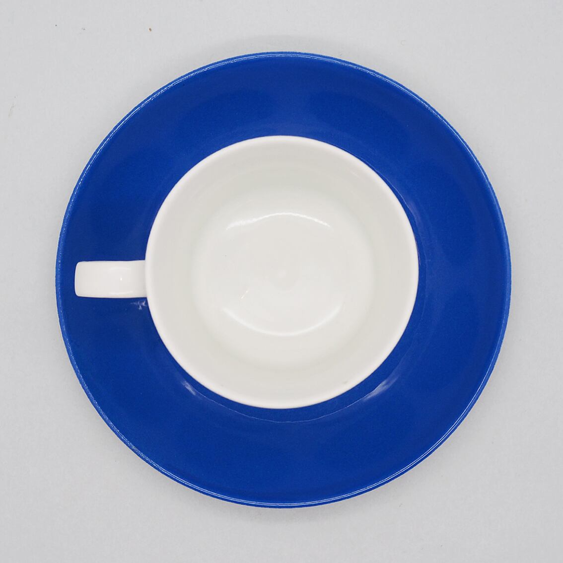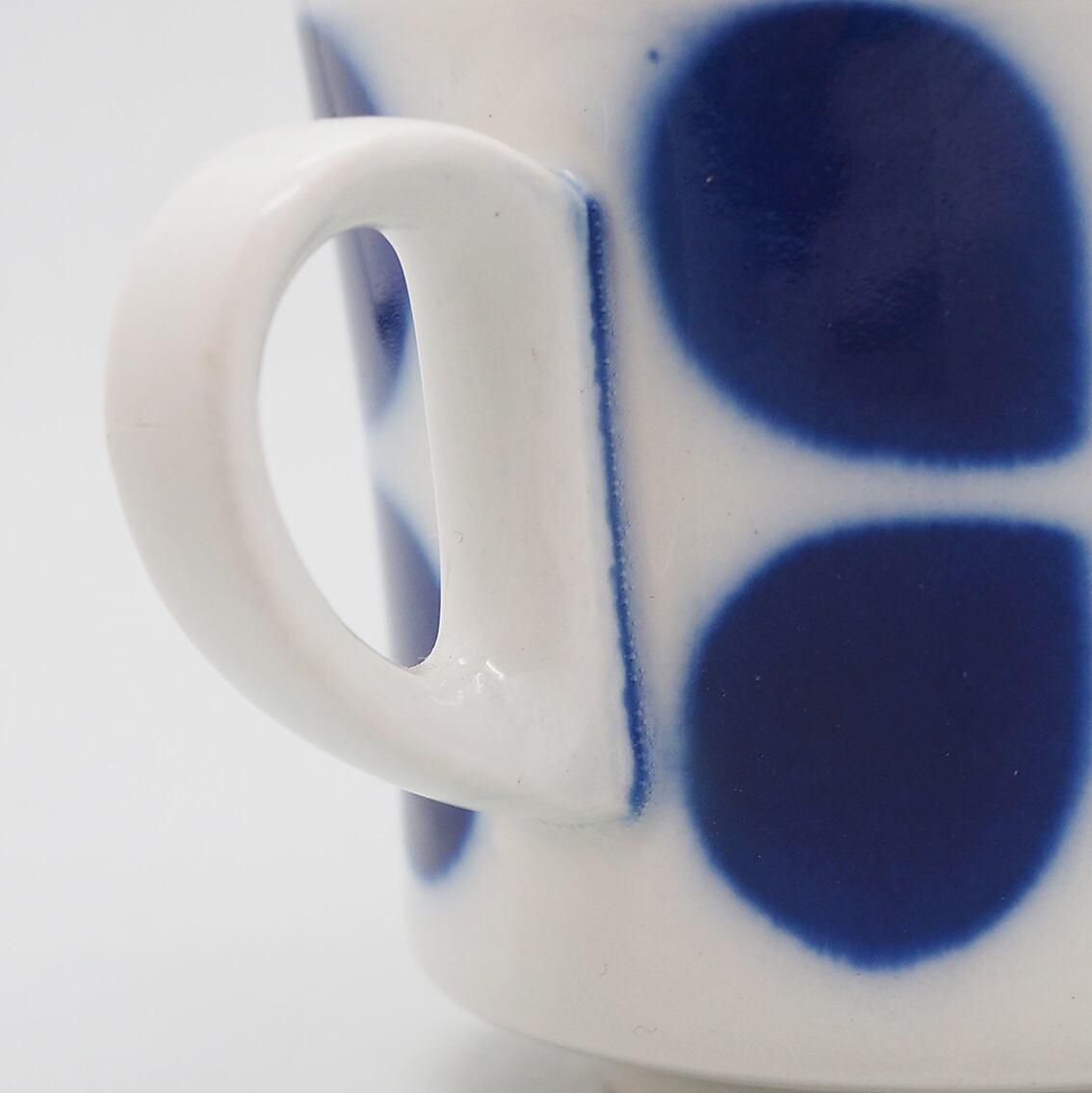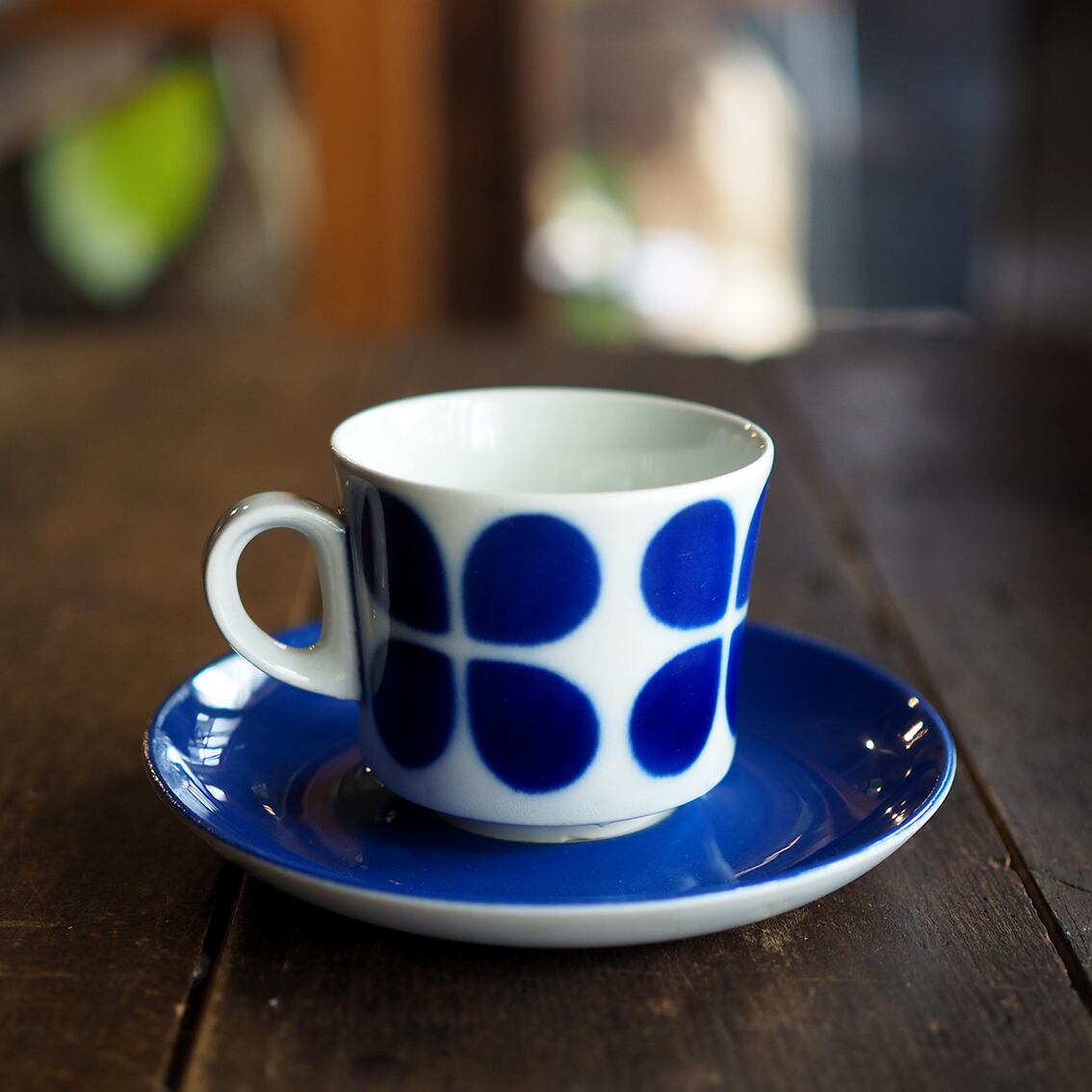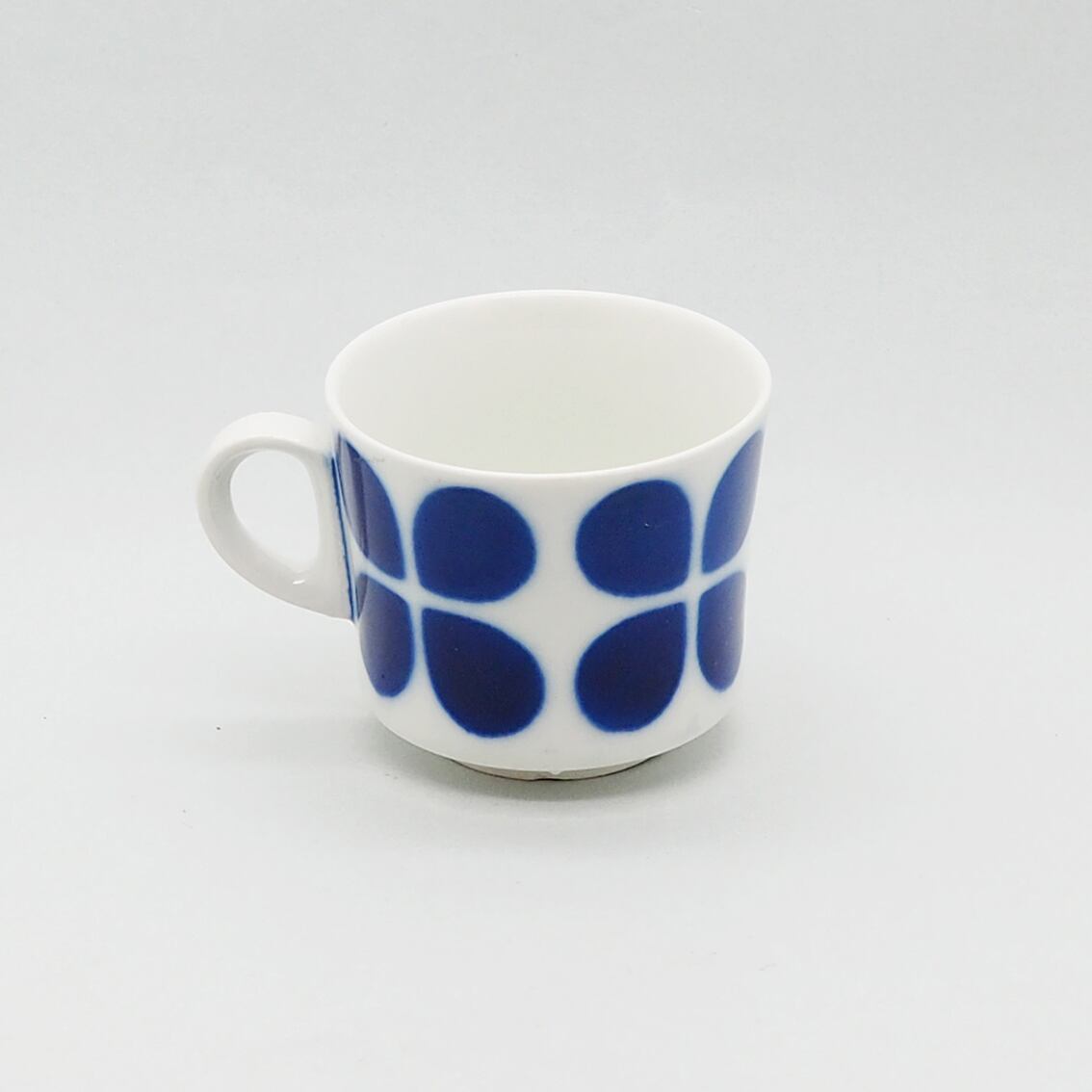 模様がくり抜かれた型をカップに装着し、スプレーで柄を吹き付ける〈ステンシル技法〉で作られた1960〜70年代のシリーズ。可愛らしいけれど洗練された柄、職人の手によるペイントのやわらかい輪郭とあたたかい表情が魅力です。こちらは、ゴラン・バックが手がけた美しいフォルムに、大きなブルーの花が描かれたカップ&ソーサー。ソーサーの鮮やかなブルーも印象的で、遠くからでも洗練されたモダンが光ります。ステンシルシリーズはさまざまなパターンが存在するので、色違い・もよう違いで集めてもすてきです。