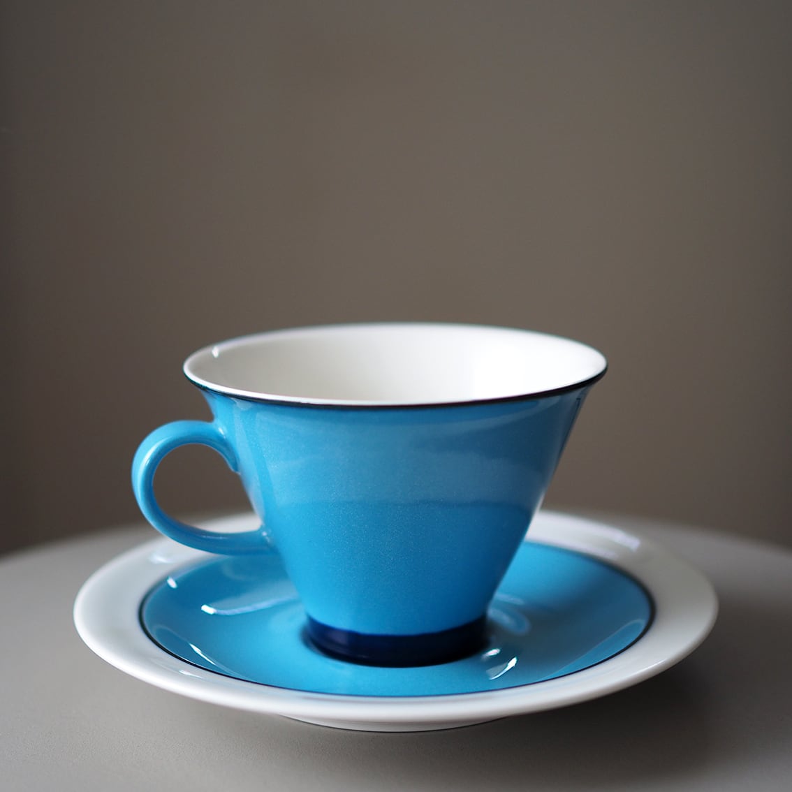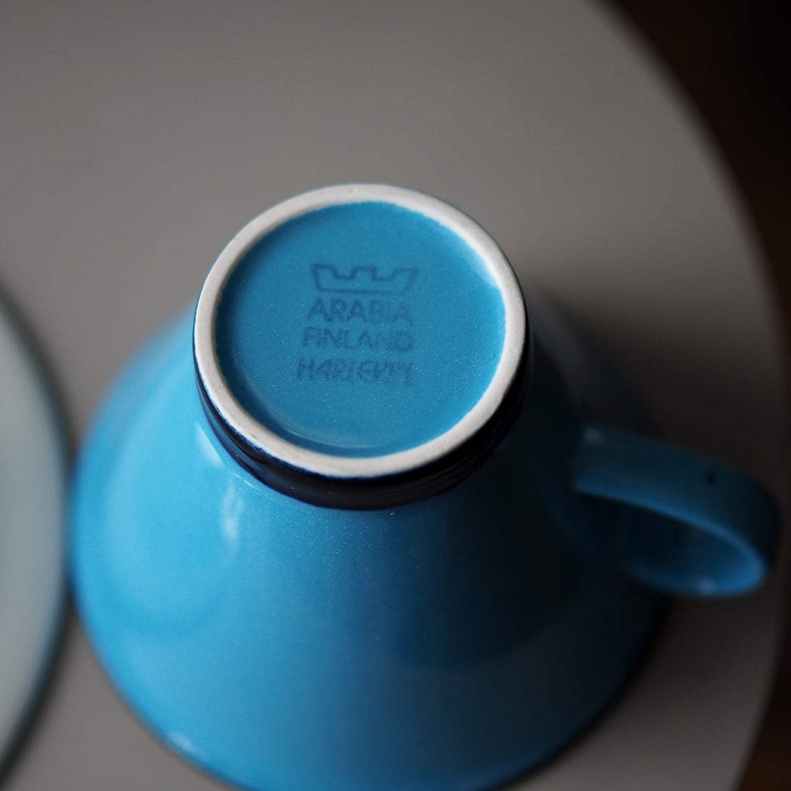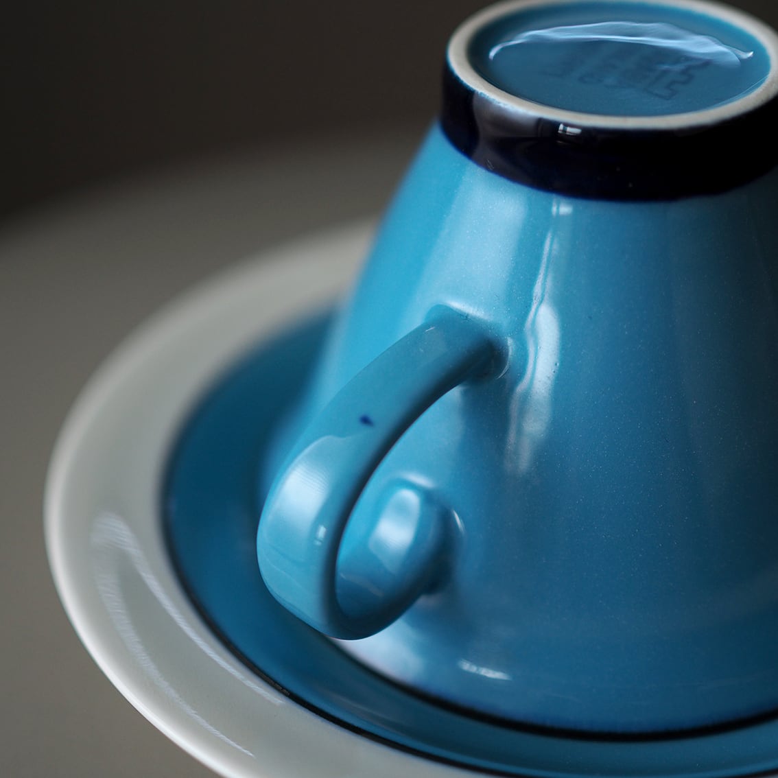 インケリ・レイヴォが手がけた、ARABIAでは珍しい逆三角形のシャープなフォルムが美しい「Harlekin (ハレキン)」のカップ&ソーサーです。鮮やかなターコイズブルーをフチと高台のネイビーがすっきりと引き締め、中はまろやかな白で、コーヒーや紅茶がきれいに映えてくれます。ゆるやかに広がった心地よく薄い飲み口もポイント。ホーローのような質感もあわせ持ち、いちど見たら忘れられない唯一無二のたたずまいです。