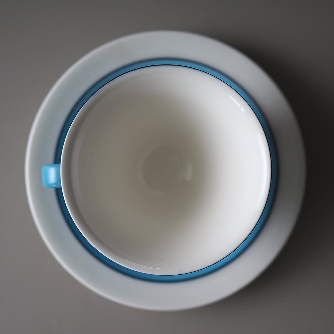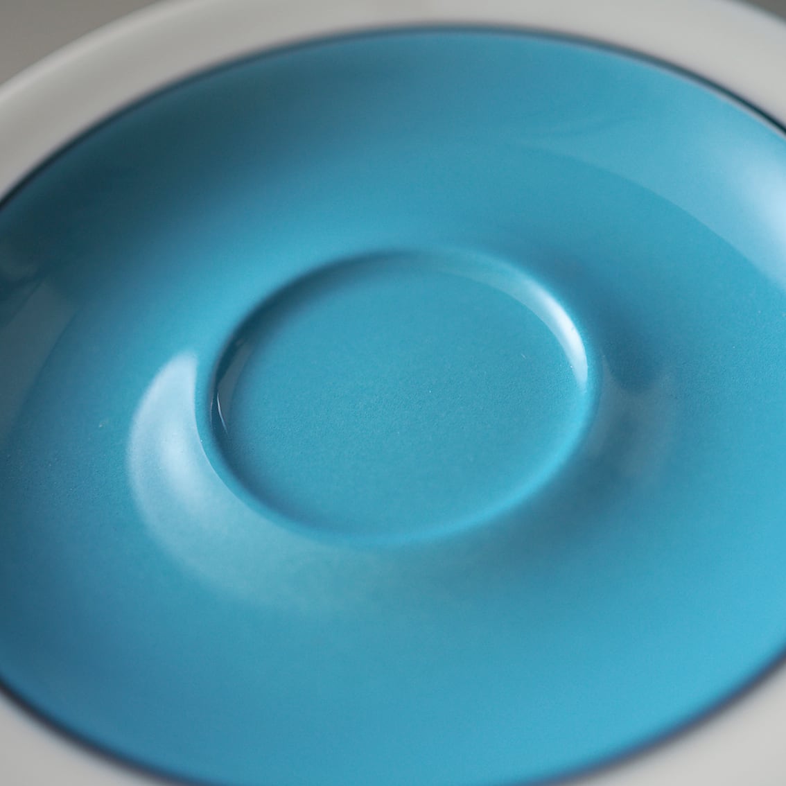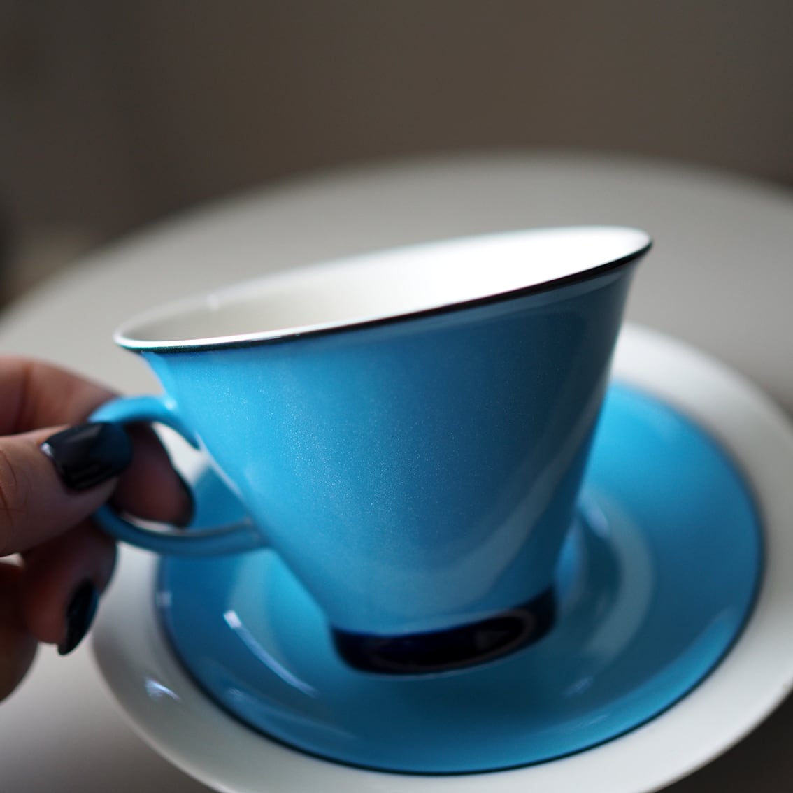 インケリ・レイヴォが手がけた、ARABIAでは珍しい逆三角形のシャープなフォルムが美しい「Harlekin (ハレキン)」のカップ&ソーサーです。鮮やかなターコイズブルーをフチと高台のネイビーがすっきりと引き締め、中はまろやかな白で、コーヒーや紅茶がきれいに映えてくれます。ゆるやかに広がった心地よく薄い飲み口もポイント。ホーローのような質感もあわせ持ち、いちど見たら忘れられない唯一無二のたたずまいです。