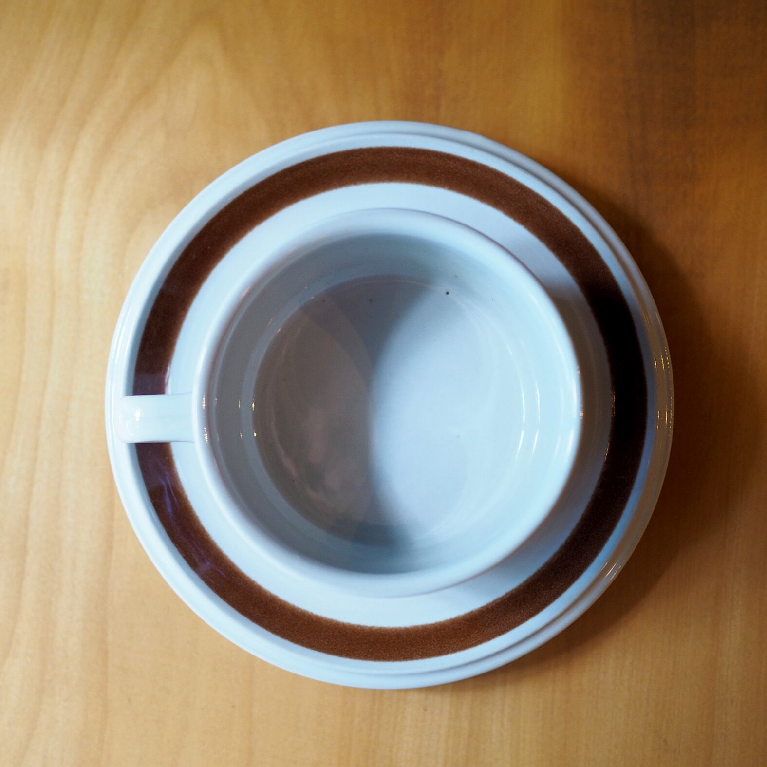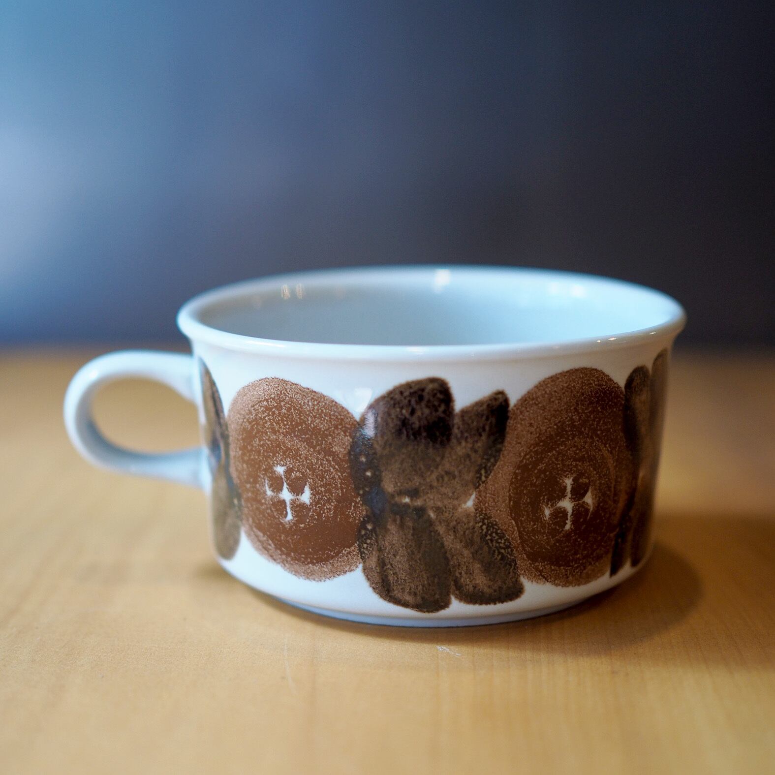 ウラ・プロコッペが手がけた人気シリーズ「ロスマリン」の大きなティーカップ&ソーサーです。同じく彼女の代表作「アネモネ」と色違いのようなたたずまいですが、こちらはロスマリン(フィンランド語で「ローズマリー」)の花がブラウンのペイントで表情豊かに描かれています。バックプリントも手描きで、ウラのイニシャル「UP」と絵付師のサインが残されています。現地でも出会うのが難しくなってきた希少なティーカップのセットは、どっしりとした安定感のあるサイズで、コーヒーや紅茶はもちろん、スープやシリアルを入れてお食事で使ってもすてきです。