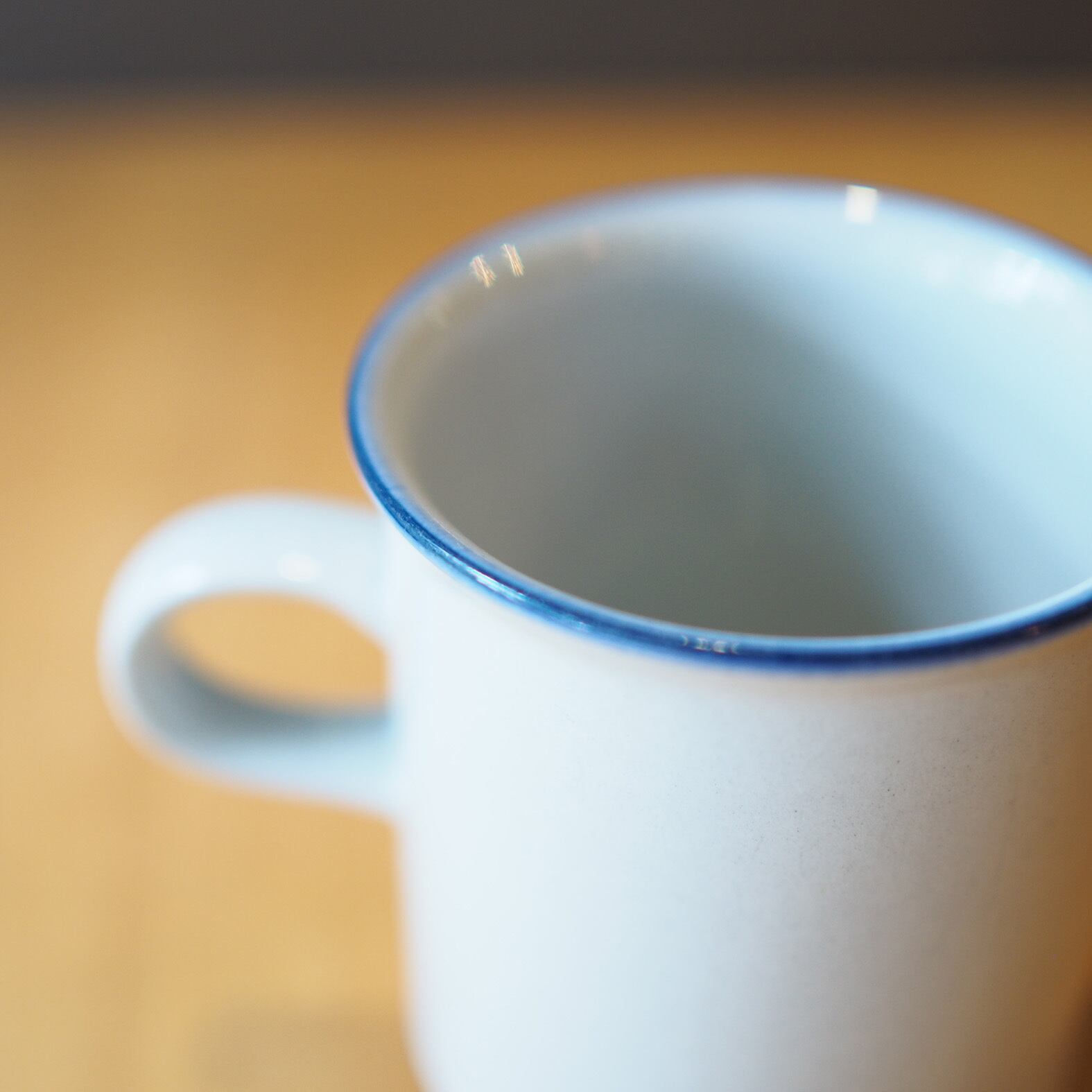 フィンランド最大の湖、サイマー湖からネーミングされたといわれる「Saimaa」シリーズ。グレーホワイト地のカップのフチに鮮やかなブルーのラインが描かれており、静かで深く美しいフィンランドの湖を抽象化した見事なデザインといえます。日本の伝統技術「口紅」(口線加工)を彷彿とさせる、じわりとにじみ地に溶け込むような絶妙なラインが美しく、シンプルの極みともいえるミニマムなデコレートと、機能美を体現したSモデルのバランスが絶妙な名作です。製造期間が短く、希少価値が高いシリーズの1つです。